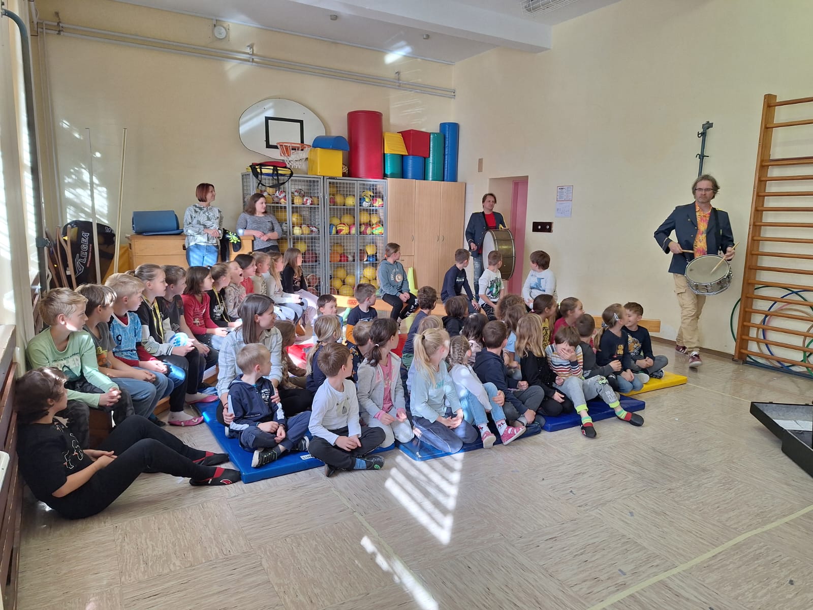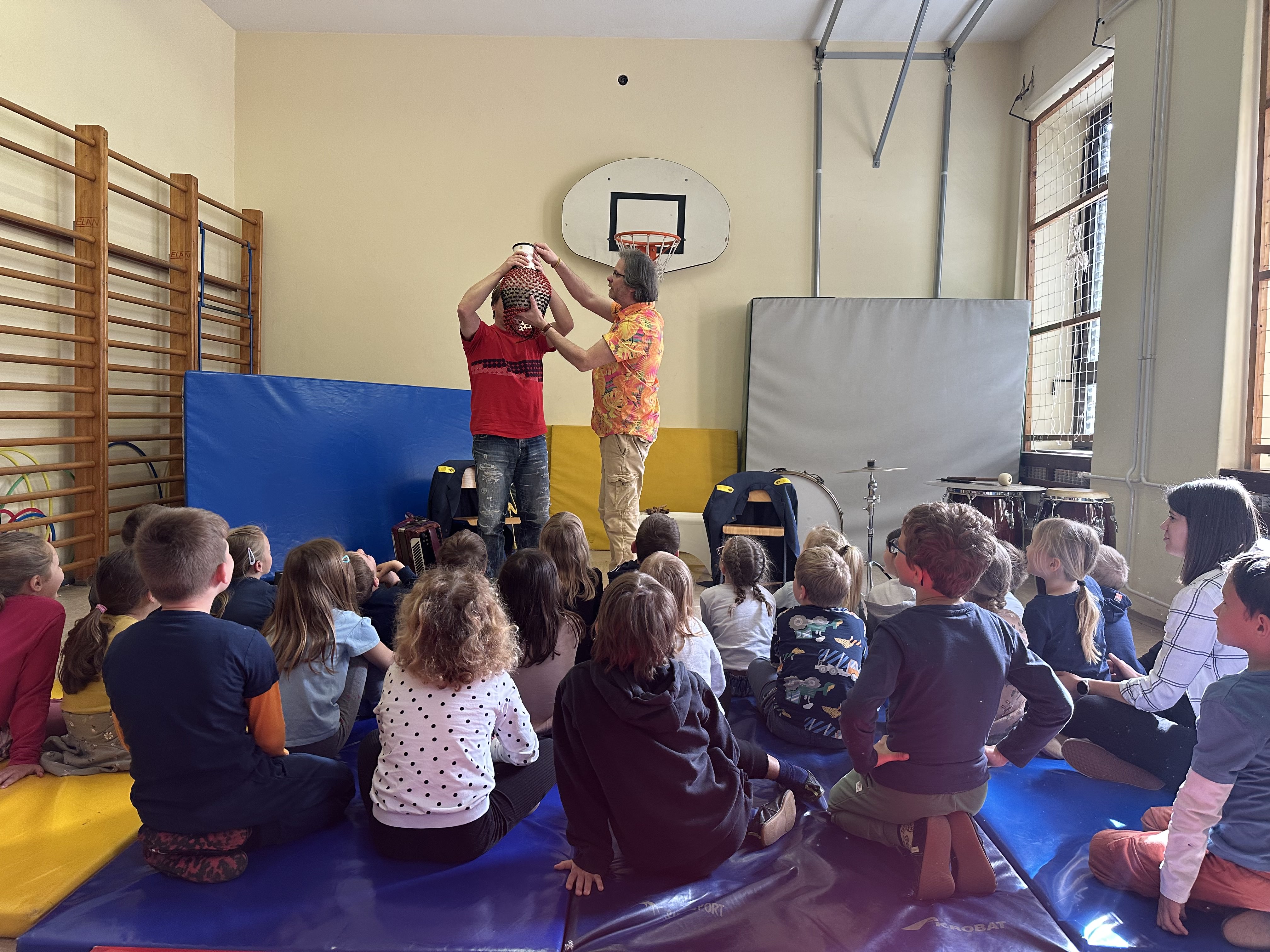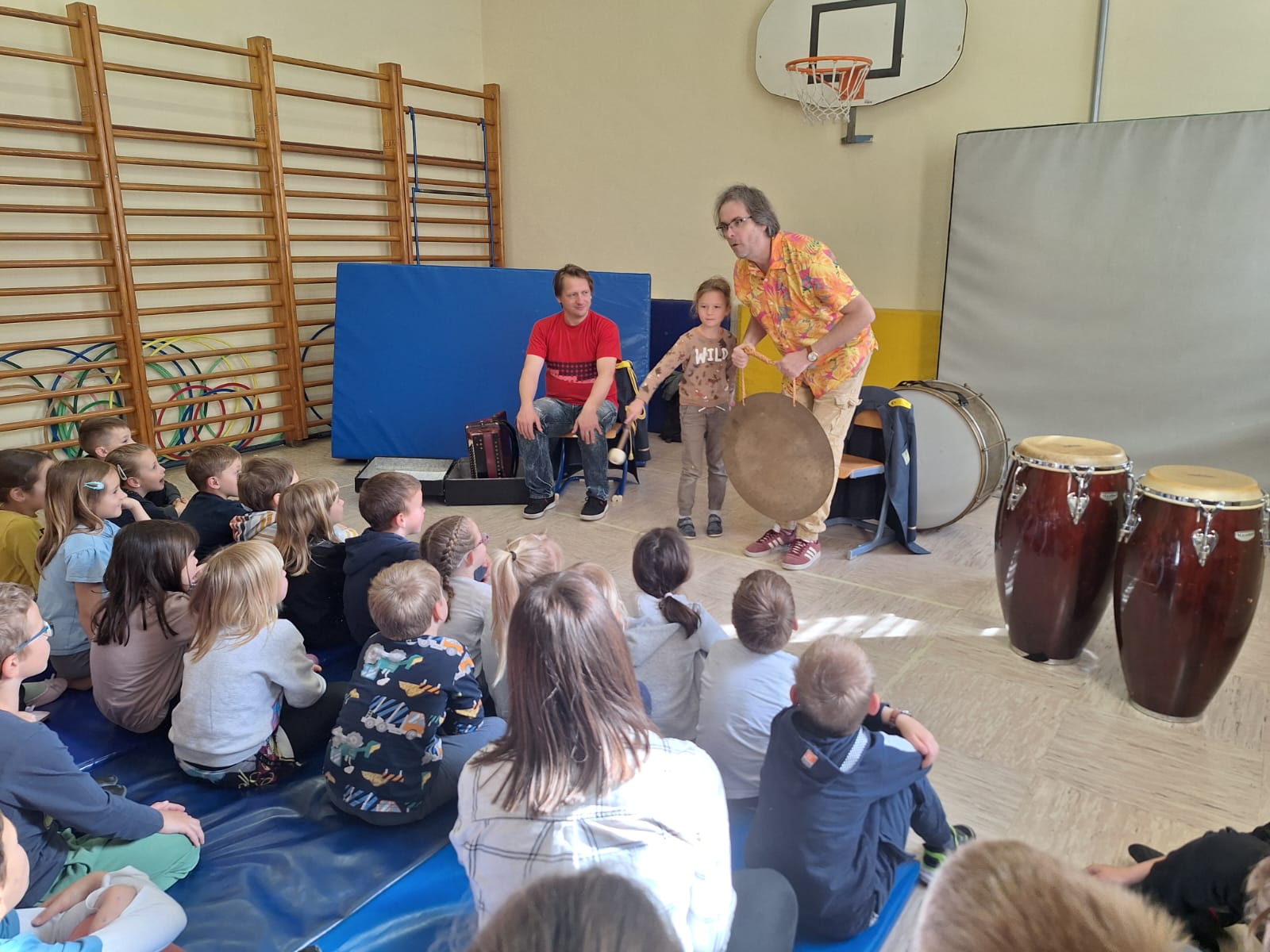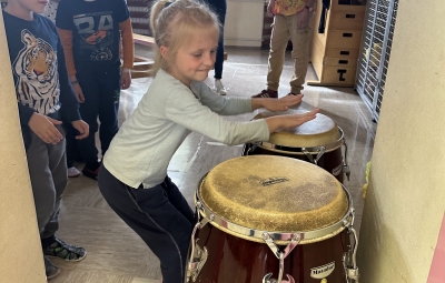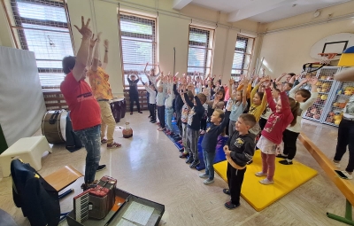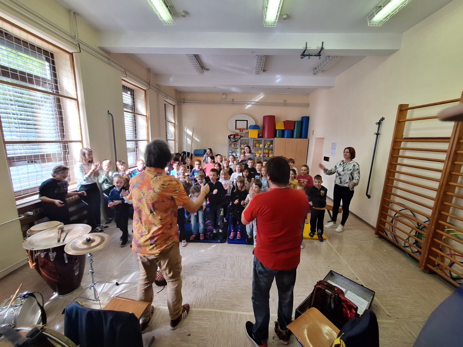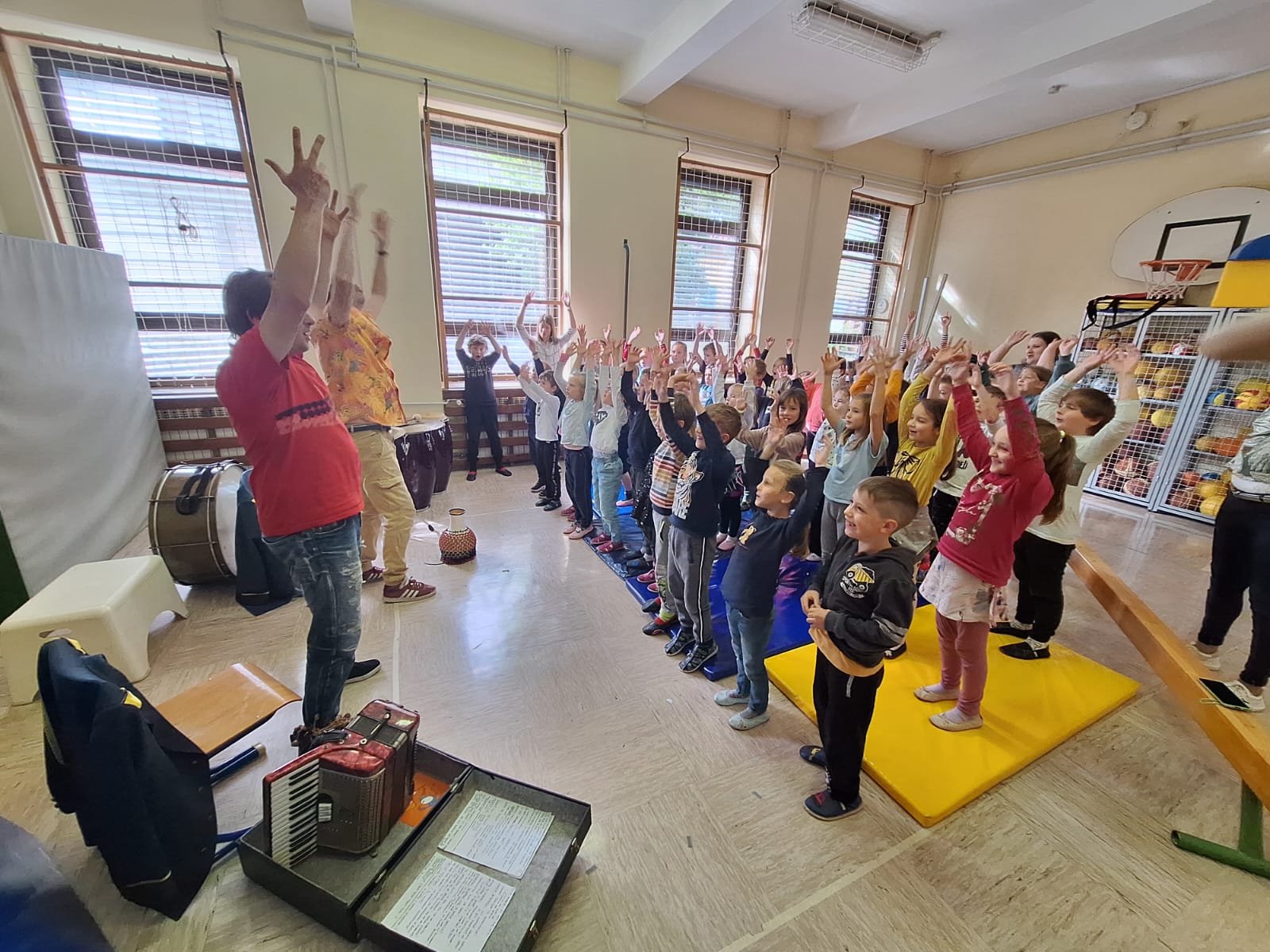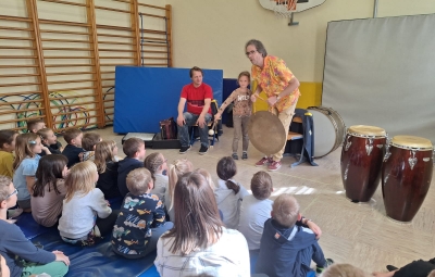 V petek smo učenci s podružnice odpotovali na domišljijsko potovanje okoli sveta. Skupaj s Francijem in Tomažem smo odpotovali v Afriko, na daljno Kitajsko, pa vse do Južne Amerike. Na poti smo spoznavali različna tolkala: mali in veliki boben, komba, tam tam, činela, ropotulja ... spremljala pa nas je tudi harmonika. Celo pot smo peli, se učili novih plesov in se smejali na ves glas.