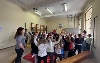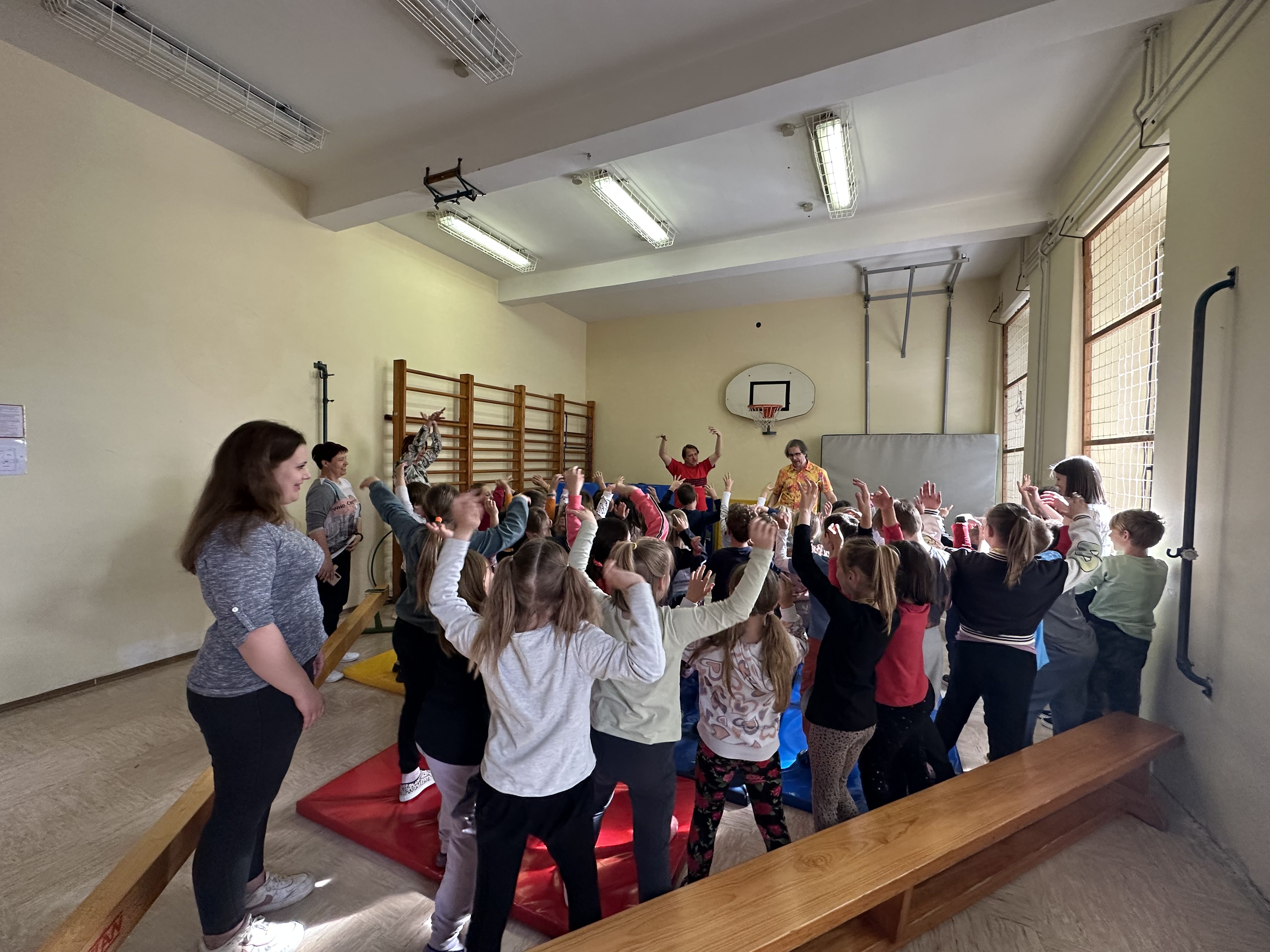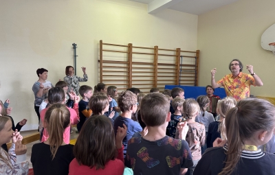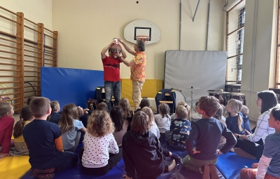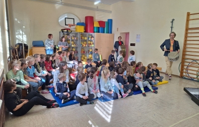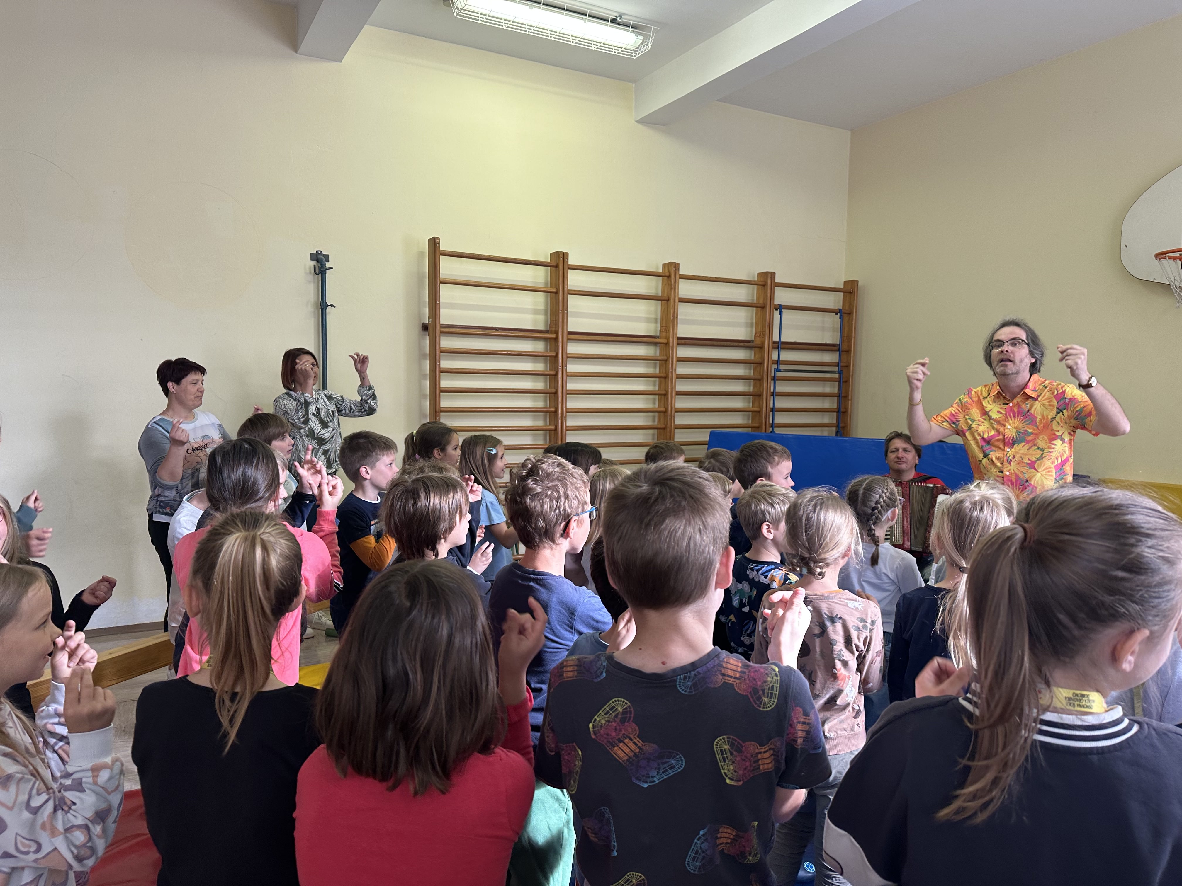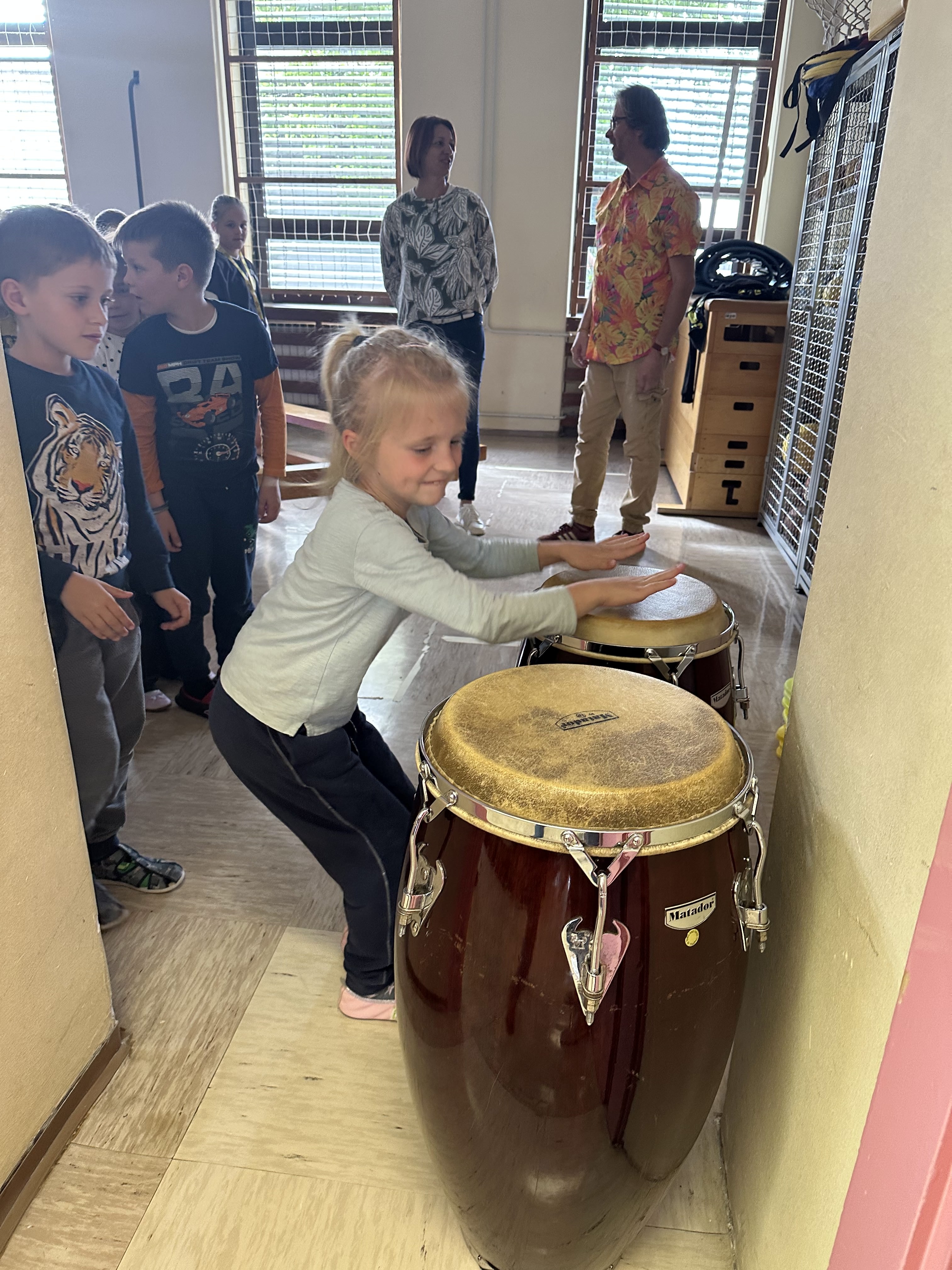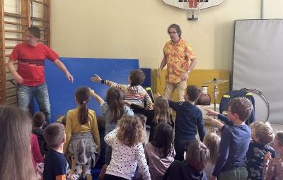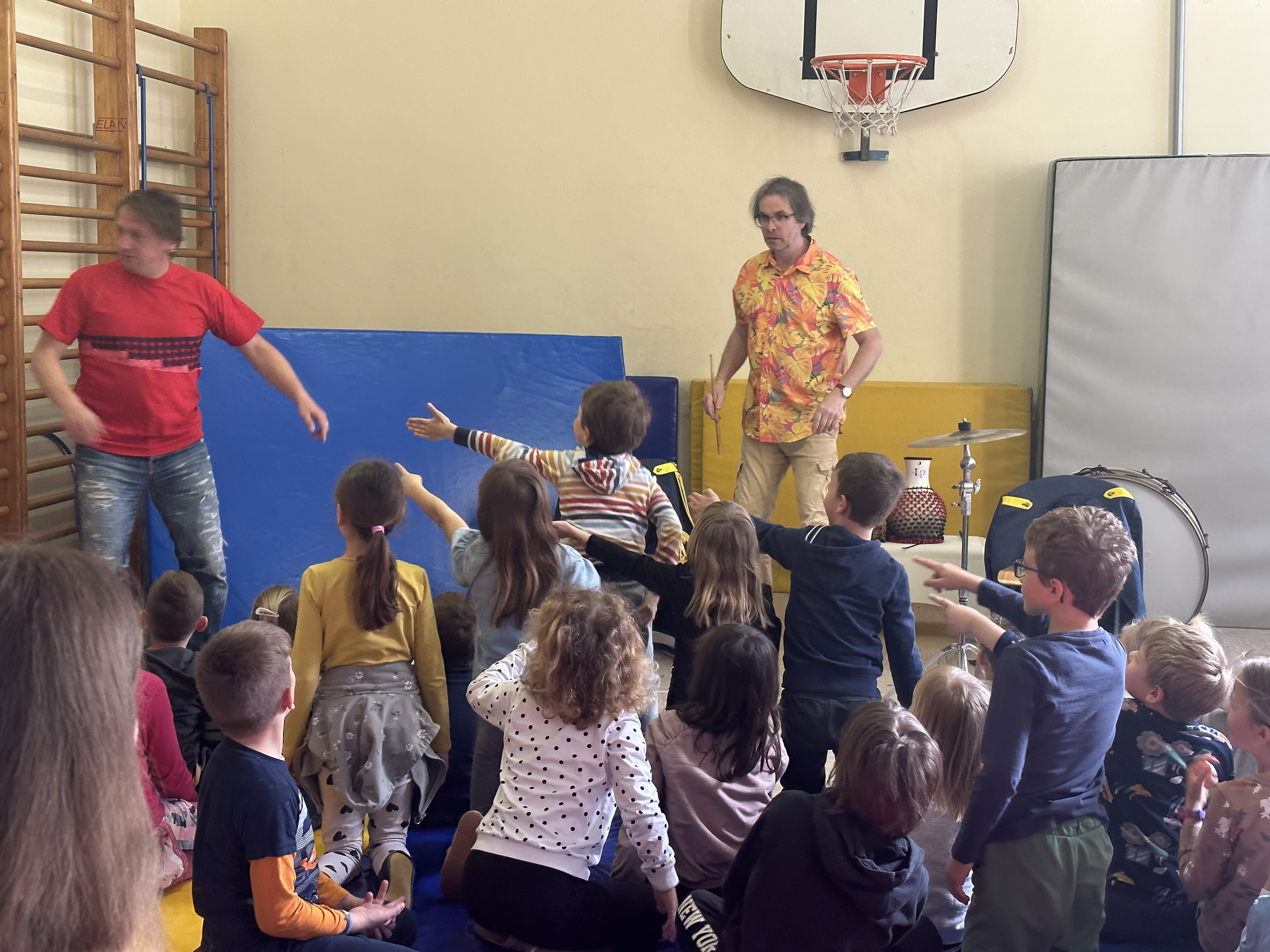 V petek smo učenci s podružnice odpotovali na domišljijsko potovanje okoli sveta. Skupaj s Francijem in Tomažem smo odpotovali v Afriko, na daljno Kitajsko, pa vse do Južne Amerike. Na poti smo spoznavali različna tolkala: mali in veliki boben, komba, tam tam, činela, ropotulja ... spremljala pa nas je tudi harmonika. Celo pot smo peli, se učili novih plesov in se smejali na ves glas.