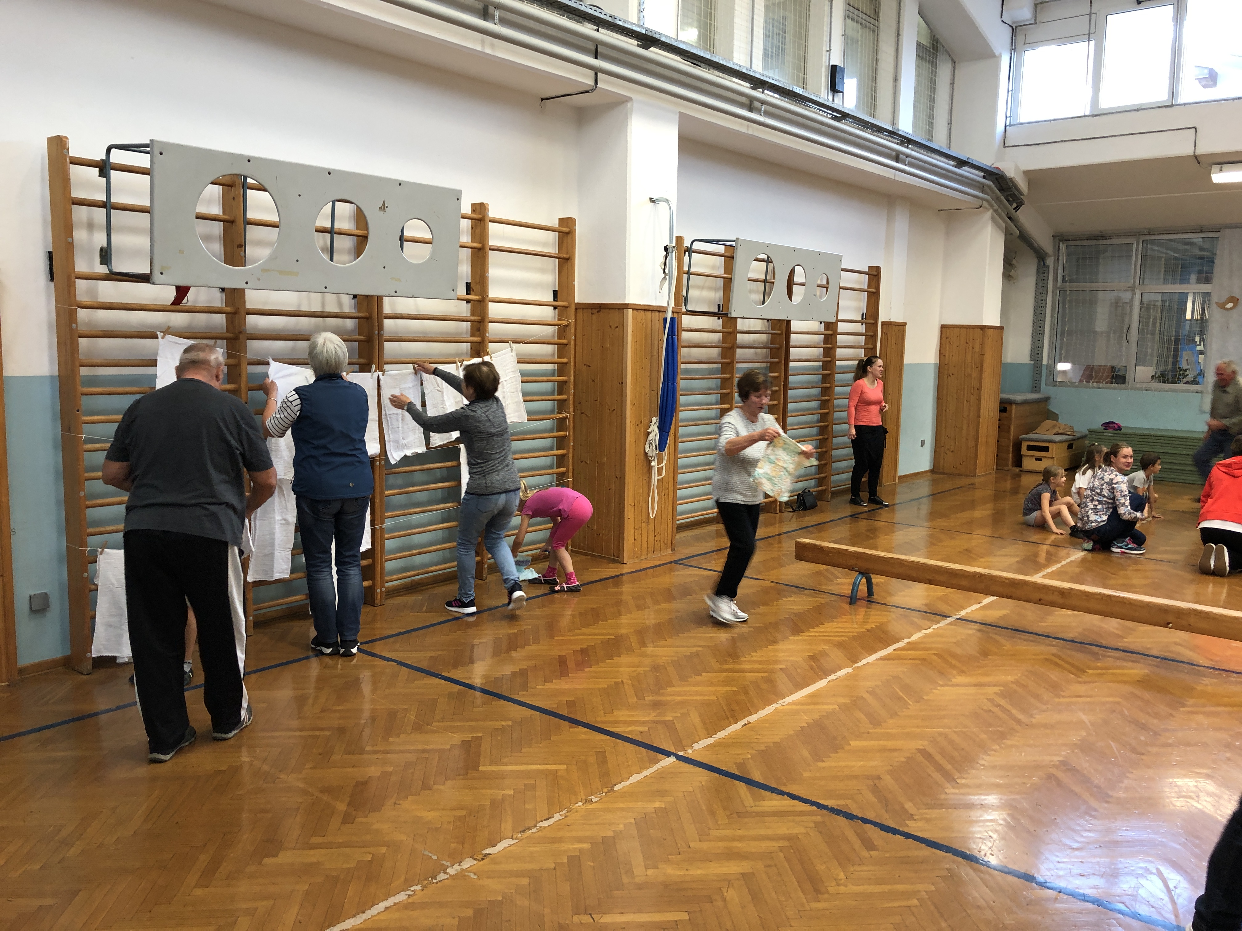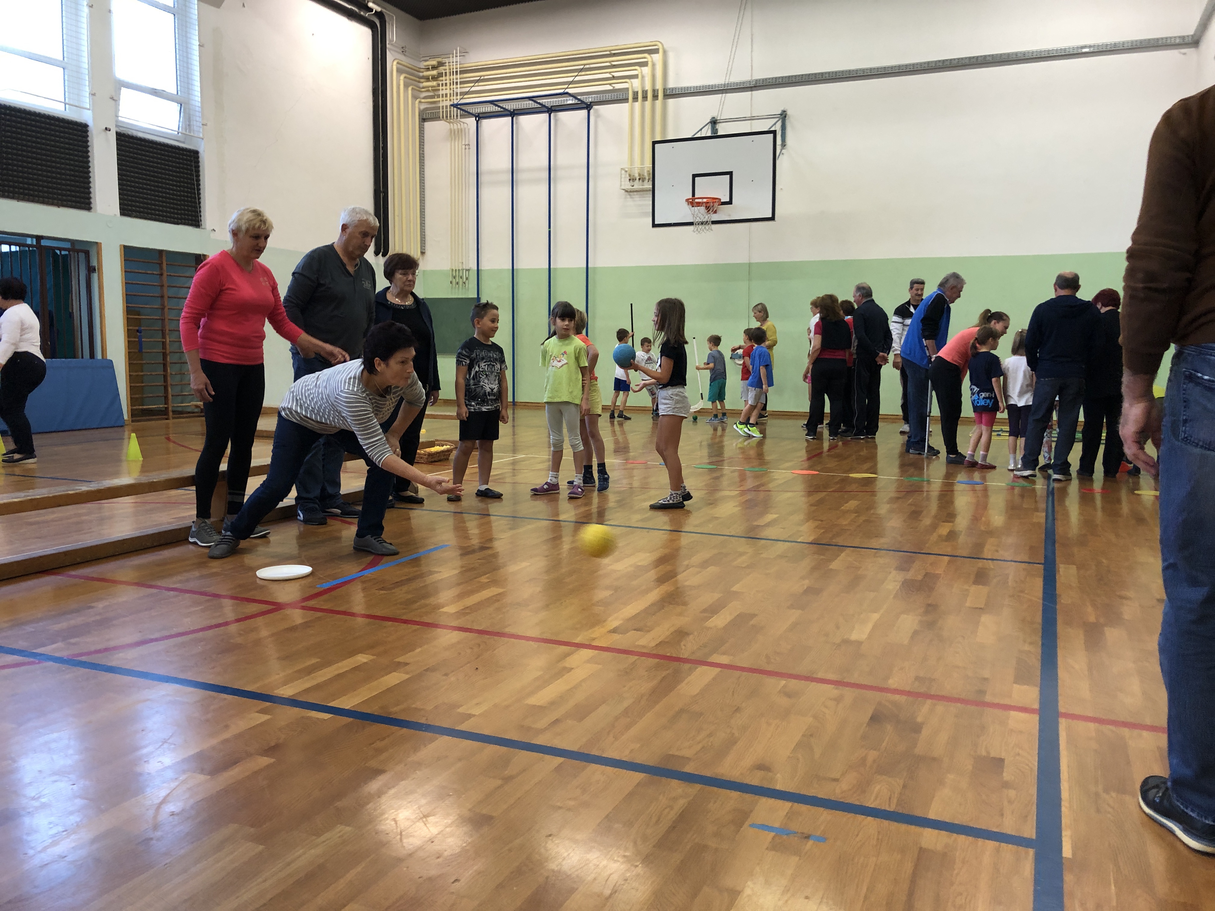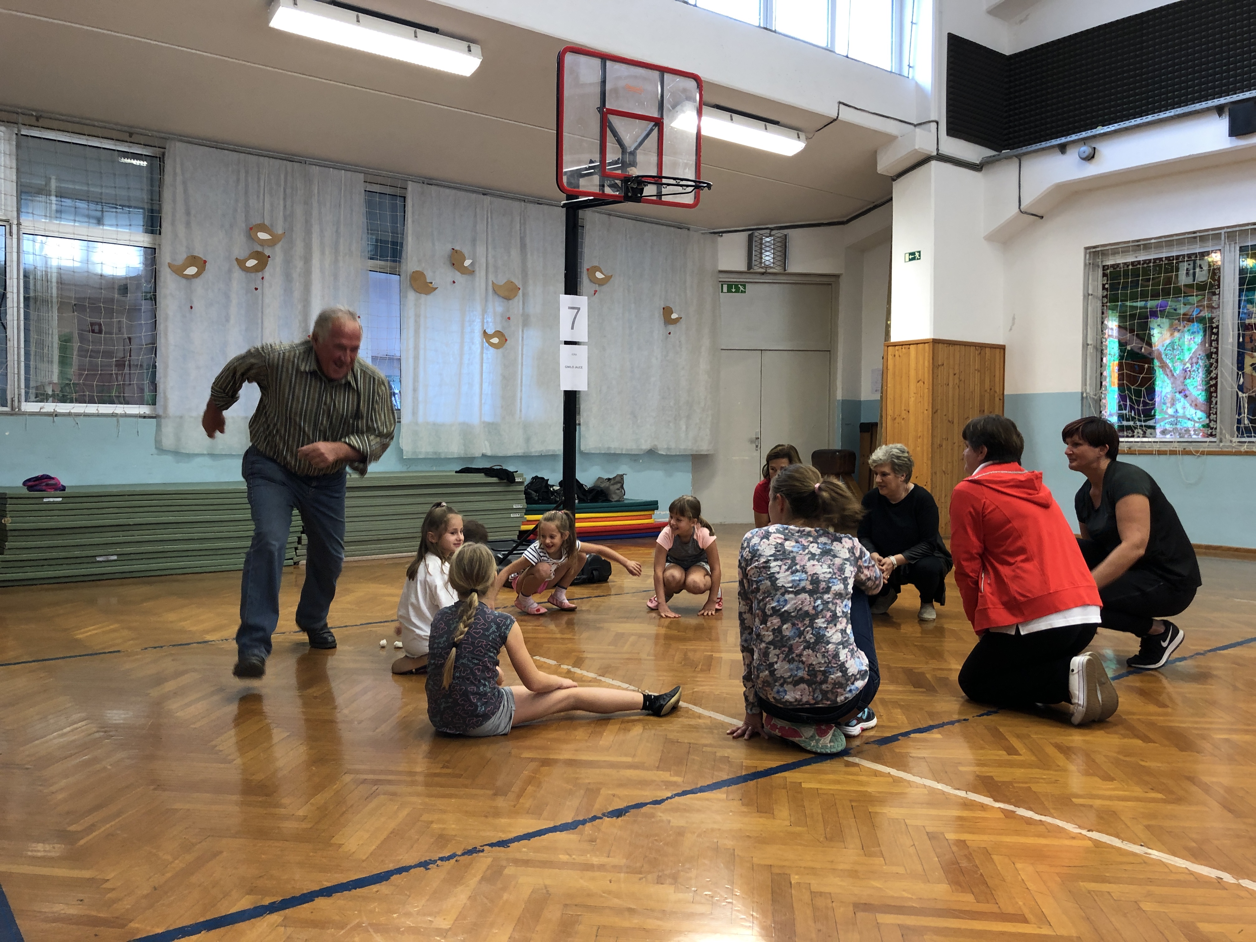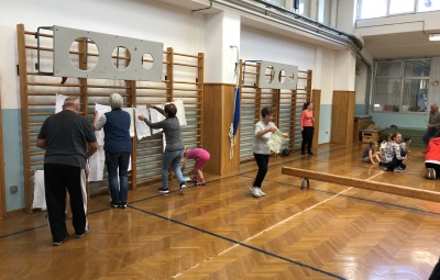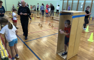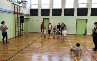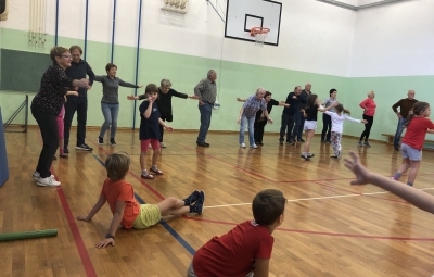 Učenci, učitelji ter stari starši smo si na skupni uri zabavnih iger podelil veliko veselja in zadovoljstva. V četrtek, 17. 10. 2019, se je namreč v okviru Simbioze giba v telovadnici naše osnovne šole ob 37 drugošolcih zbralo kar 35 njihovih starih staršev. Podirali smo keglje, igrali igro Gnilo jajce, obešali in zlagali perilo, poskusili »prelisičiti« vrtečo se kolebnico in iti pod njo, ne da bi nas oplazila, na žlici prenašali jajčka mimo različnih ovir, s hokejsko palico usmerjali žogico v gol in si prizadevali v vrsto postaviti tri enake markerje, preden bi to storila nasprotna ekipa. Na koncu smo stare starše naučili še ples Ko, ko, ko, ki nas poživi, ko smo med poukom utrujeni. Čas je za naše učence minil prehitro, zato si nadejamo, da se nam bo uspelo še kdaj srečati in se zabavati na tak ali podoben način.