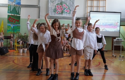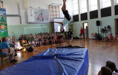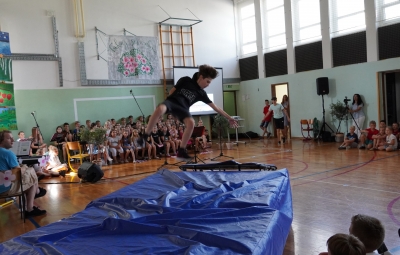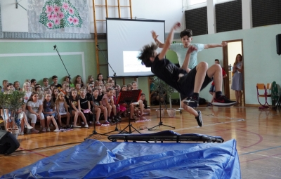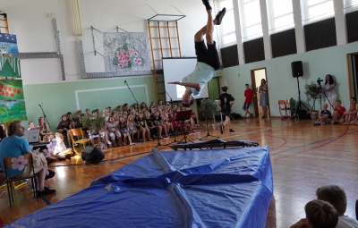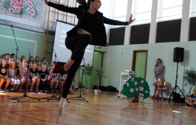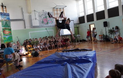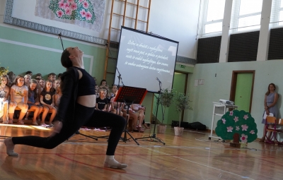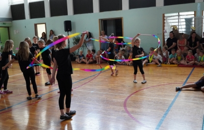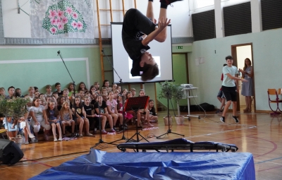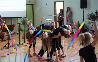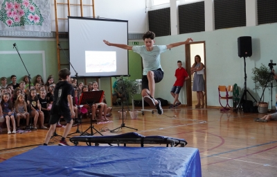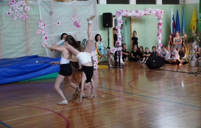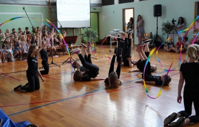 Da na naši šoli domuje šport, sta dokazala sedmošolca Martin Reja in Tibor Rusjan, ki sta navdušila z akrobatskimi skoki s prožne ponjave, ter šestošolki Eva Ribolica in Sara Mavrič iz Športnega društva Twirling Brda s twirling točko pod mentorstvom Gaje Peršolja. Mojstrstvo sodobnega plesa smo občudovali tudi v plesni točki šestošolke Ule Koncut.