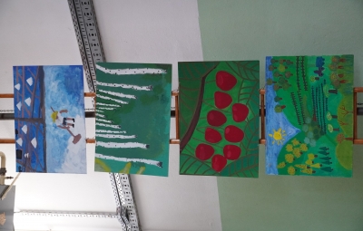 Vizualno podobo telovadnice so ustvarjali učenci in učenke naše šole pod mentorstvom učiteljic podaljšanega bivanja, razrednega pouka, likovne umetnosti Lidije Vodopivec ter tehnike in tehnologije Helene Skok Schlegel, ki so izdelali na stotine triglavskih rož. Petošolec David Vendramin je naslikal triglavske rože na kopreno, pri napisu mu je s tehniko risanja črk pomagala učiteljica Tjaša Rotar Komel, učenci 6. in 7. razreda pa so naslikali podobe iz štirih slovenskih pokrajin, ki so krasile glavni oder. Slavolok iz triglavskih rož so izdelali učenci podaljšanega bivanja OPB 5 in OPB 6 ob pomoči učiteljic Tereze Peršolja in Lidije Vodopivec.