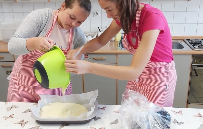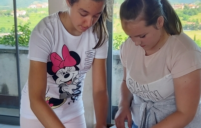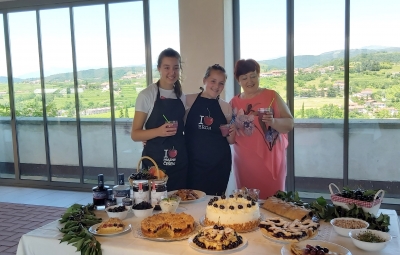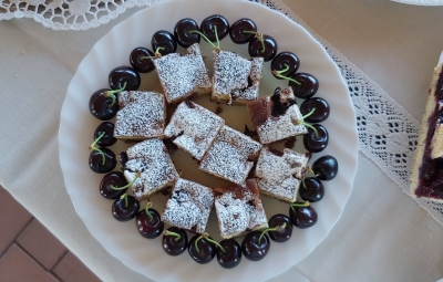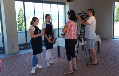 Včeraj je na gradu Dobrovo potekalo snemanje oddaje o poznih vrstah briškega sadeža. V sodelovanju z briškimi ženami in gospo Marijo Merljak sta se predstavili tudi dve naši sedmošolki. Pripravili sta češnjevo pito, ki sta jo dodali na lepo obloženo mizo s sladkimi dobrotami. Dokazali sta tudi, da si lahko iz češenj pripravimo okusen in zdrav smuti. Punci sta se odlično znašli za kamero in tudi pred njo.