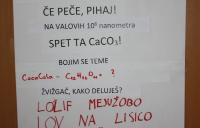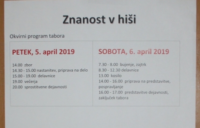 Ob koncu tedna, 5. in 6. aprila 2019, smo učencem 8. in 9. razreda ponudili dvodnevni tabor, na katerem so se srečali z zanimivimi, uporabnimi in poučnimi vsebinami, za katere so šolske ure žal prekratke. Učenci so ob druženju spoznavali dodatne vsebine, ki so pripravljene tako, da spodbujajo raziskovalno delo, medpredmetno povezovanje, sodelovalno učenje in celosten učenčev razvoj. Prednosti takšnega dela so predvsem prijetno delovno vzdušje in možnost spodbujanja kreativnosti in medsebojnega sodelovanja. Tema letošnjega tabora je bila Znanost v hiši.