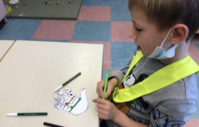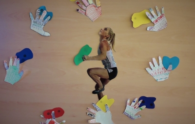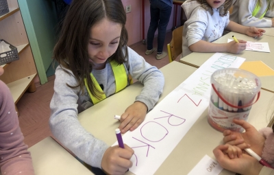 Prvošolci in prvošolke, ki se bodo pisanja črk šele učili, so drug drugemu na list papirja obrisali dlan, nato pa nanjo z barvnimi flomastri narisali različne vrste črt, ki jih obvladajo: ravne, krive, poševne, vijugaste in druge. Iz barvnega papirja so izrezali še plezalne oprimke in tako oblikovali plezalno steno, po katerih (med njihovimi dlanmi) pleza Janja Garnbret. Slovenska plezalka in prejemnica zlate olimpijske medalje je namreč ambasadorka letošnjega Tedna pisanja z roko. Pisarje in nadobudne plezalce so pri delu spremljale učiteljice Brigita Markič, Melita Čibej in Mateja Čendak.