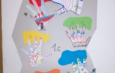 V Tednu pisanja z roko smo učenci prvega razreda izdelali plezalno steno. Nanjo smo prilepili obrise dlani, ki smo jih okrasili z različnimi vzorci.
