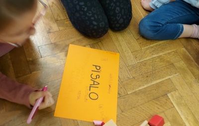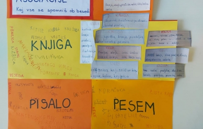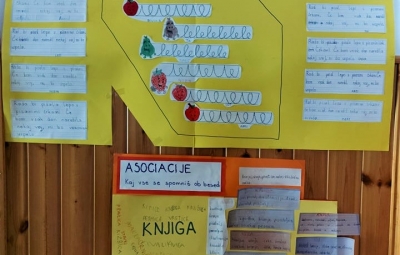 V drugem razredu smo se pogovarjali o besedi asociacija. Kaj pomeni? Po pogovoru smo zapisali čim več besed na temo knjiga, pesem, pisalo. Na plakat smo zalepili tudi besede otrok, ki so se učili doma. Spoznali smo vse male in velike tiskane črke. Komaj smo čakali na zapisovanje malih pisanih črk. Pregovor pravi, da vaja dela mojstra, če mojster dela vajo, zato smo vadili tudi mi. Ker bi radi pisali lepe črke, smo morali najprej vaditi vaje zapisa različnih črt. Dobro nam gre.