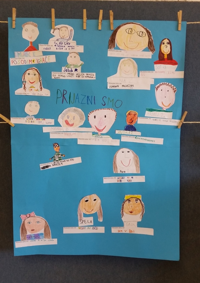 Vse prijazne besede in dejanja vplivajo na nas in našo bližnjo okolico, v nas vzbudijo veselje in zadovoljstvo. Nasmeh, prijazen pogled, prisrčen objem, stisk roke, vse te geste vplivajo na medsebojno povezanost in pripadnost. Učitelji so poleg aktivnosti, ki so potekala v povezavi s knjižničarko, izpostavili na temo prijaznost še izdelavo plakatov, ogled videoposnetka, skrinjico prijaznih besed, risanje obraza prijaznega otroka, risbo in prijazno spodbudo za bolnega sošolca, izdelavo hišic prijaznih besed, kozarec spodbud z zahvalo za prijazno dejanje, analizo pesmi, ki govori o prijateljstvu ipd.