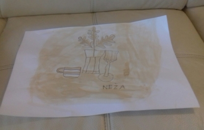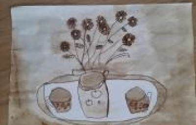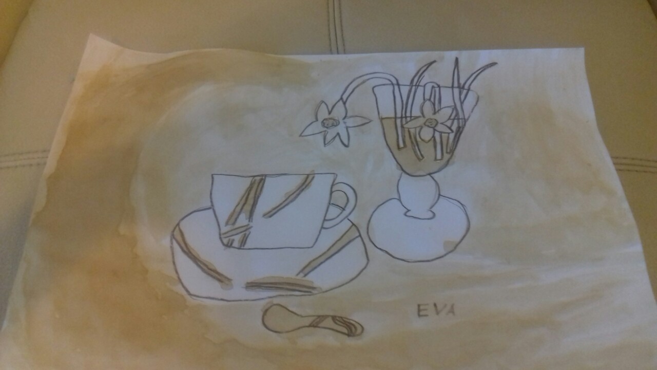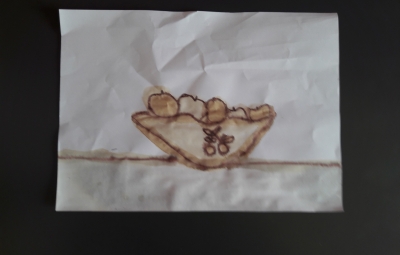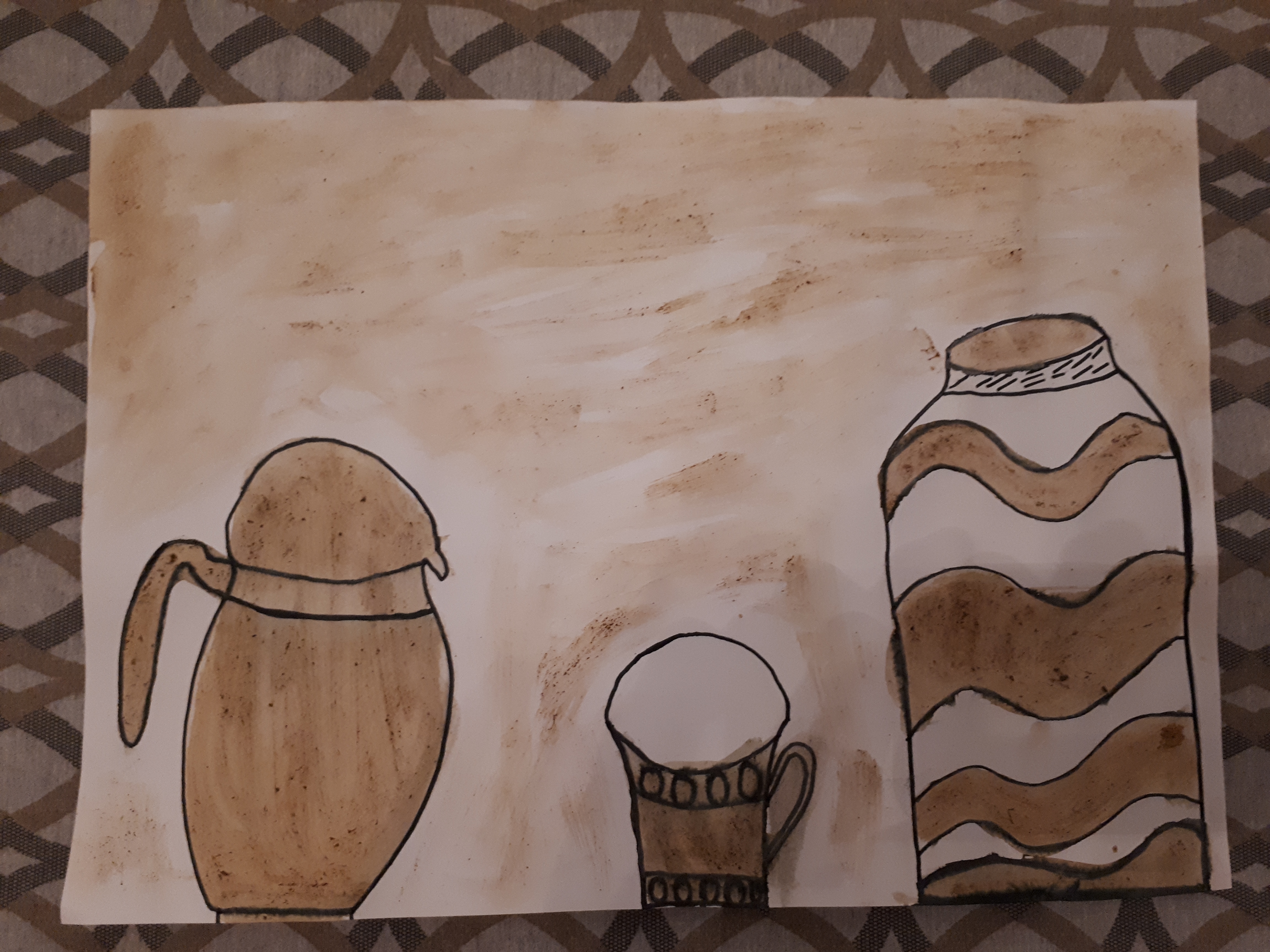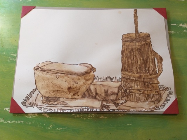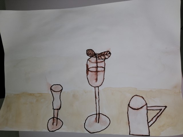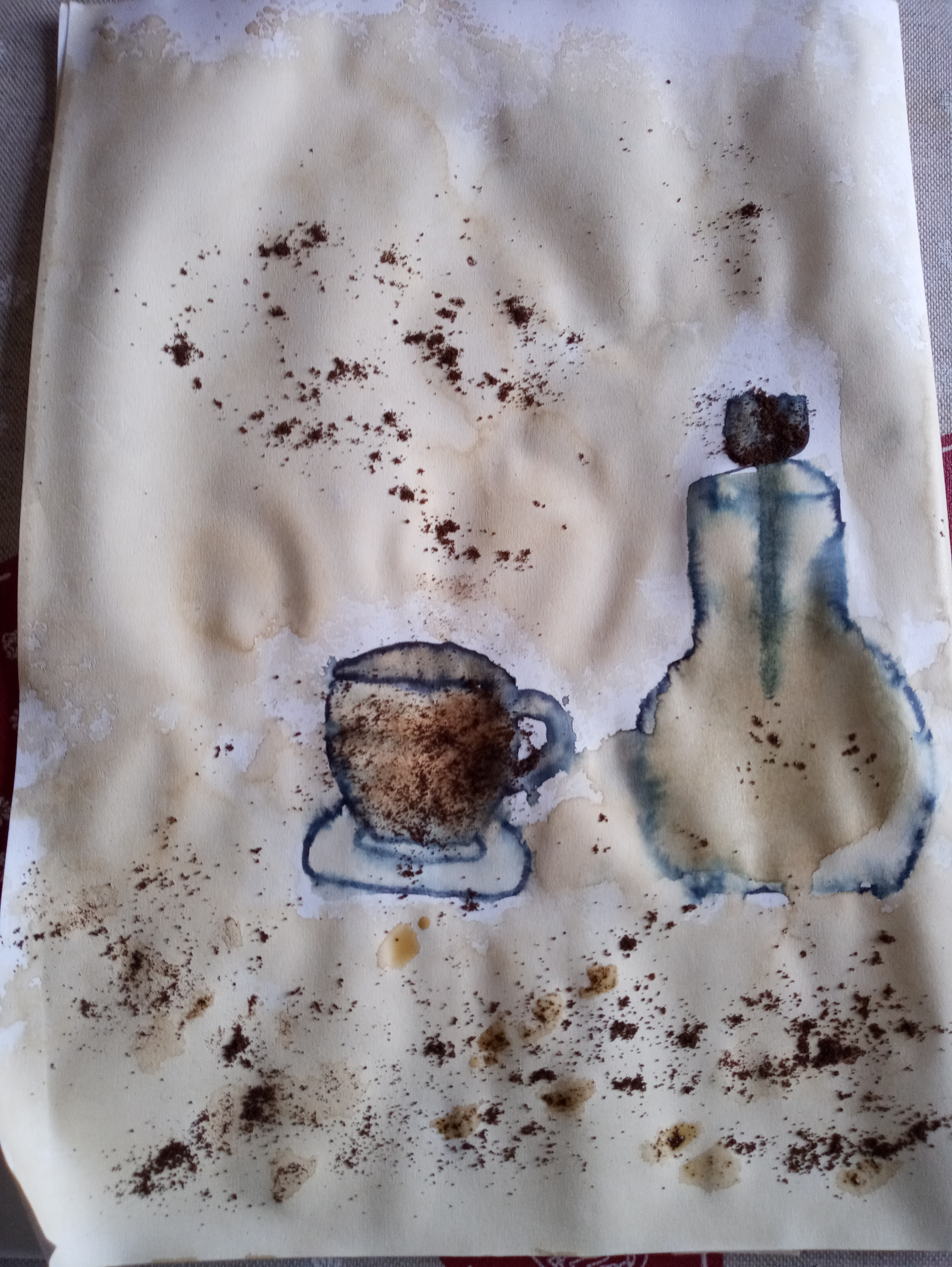 Tretješolci iz Dobrovega in Kojskega smo spet ustvarjali. Ker so naše tempera in vodene barve ostale v šoli, smo si pri slikanju morali pomagati drugače. Skuhali smo kavo in barvali.
