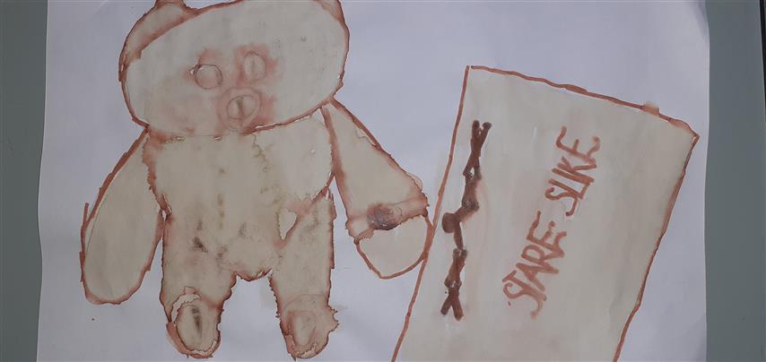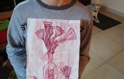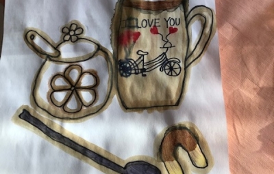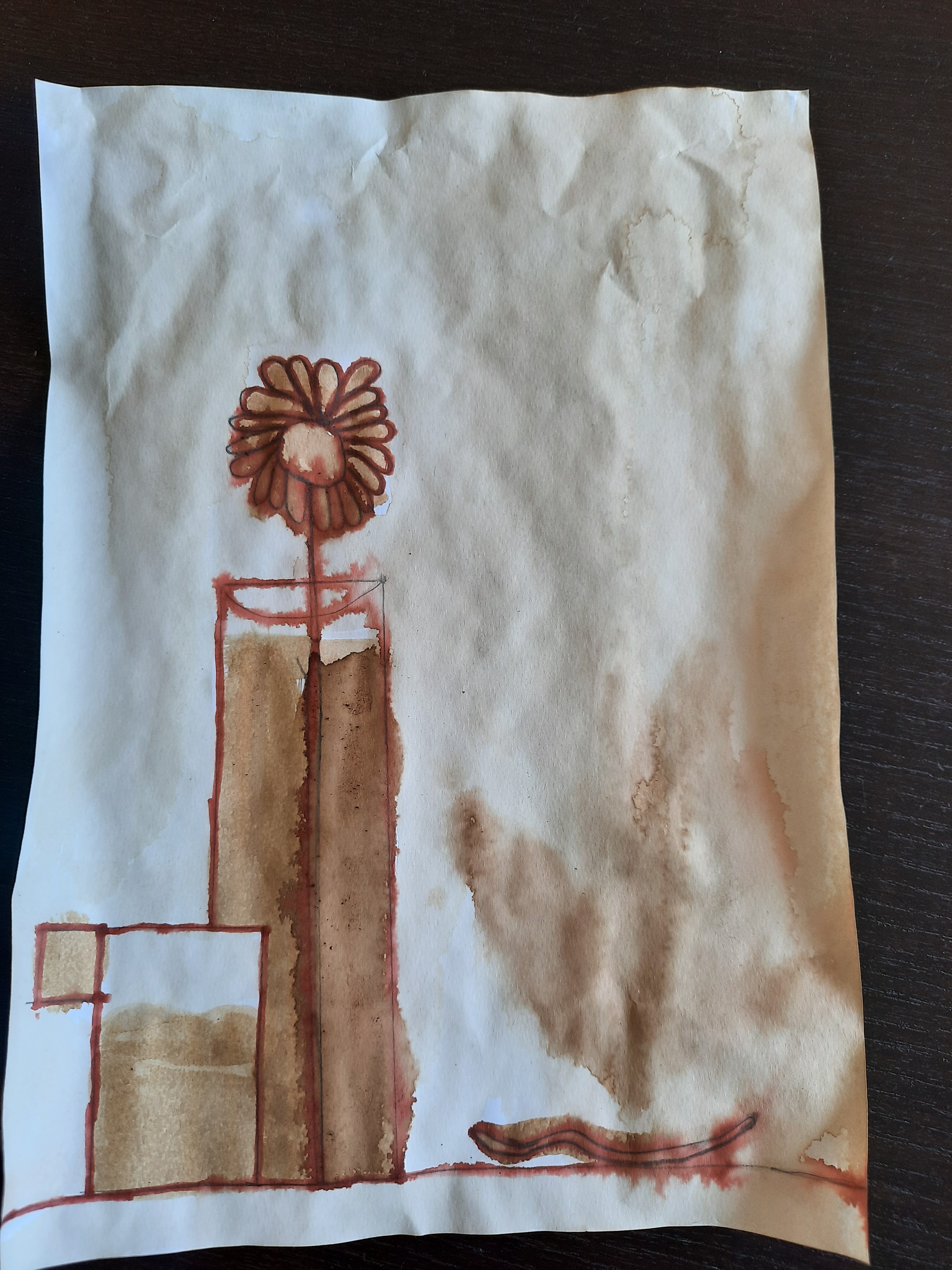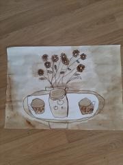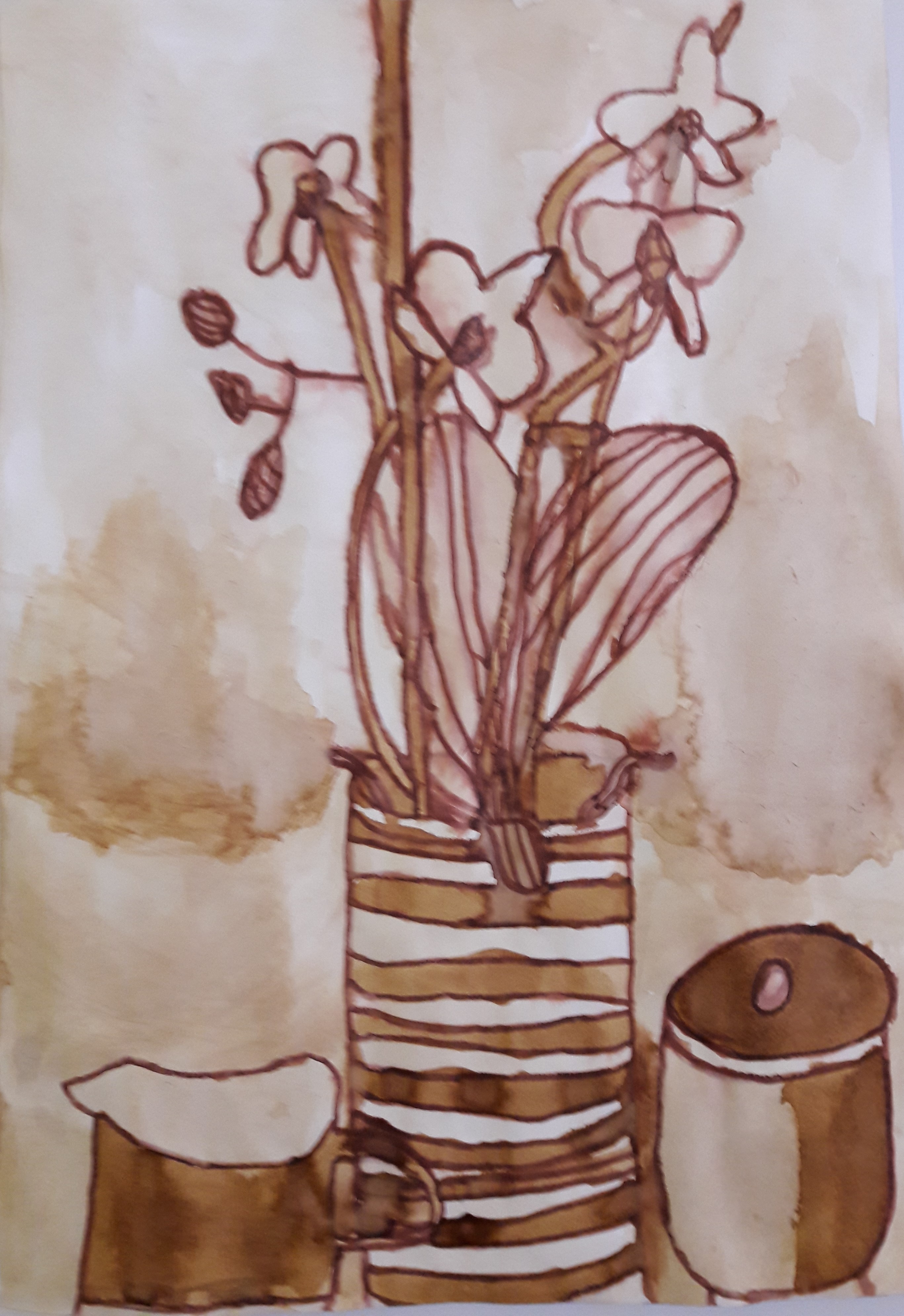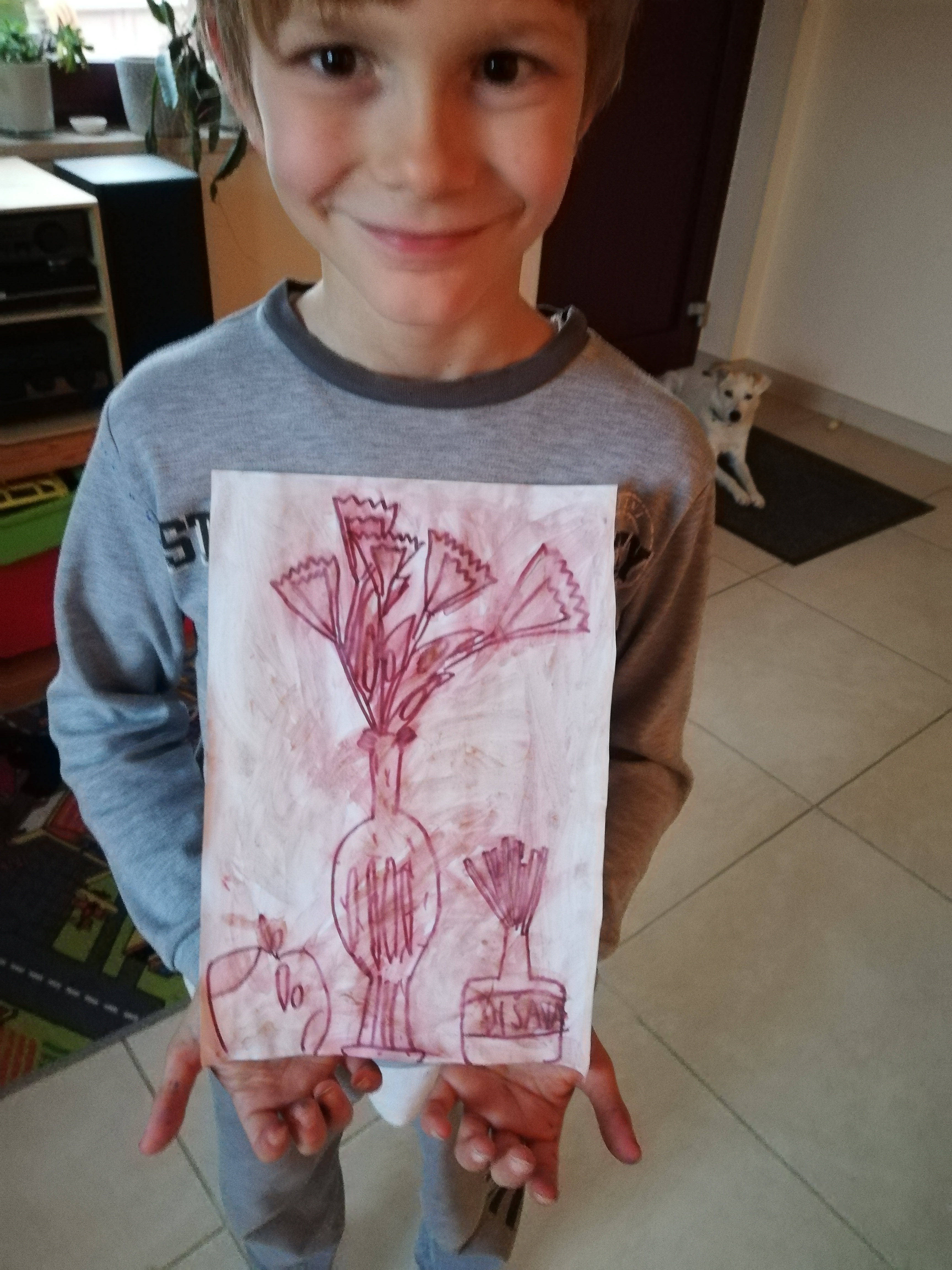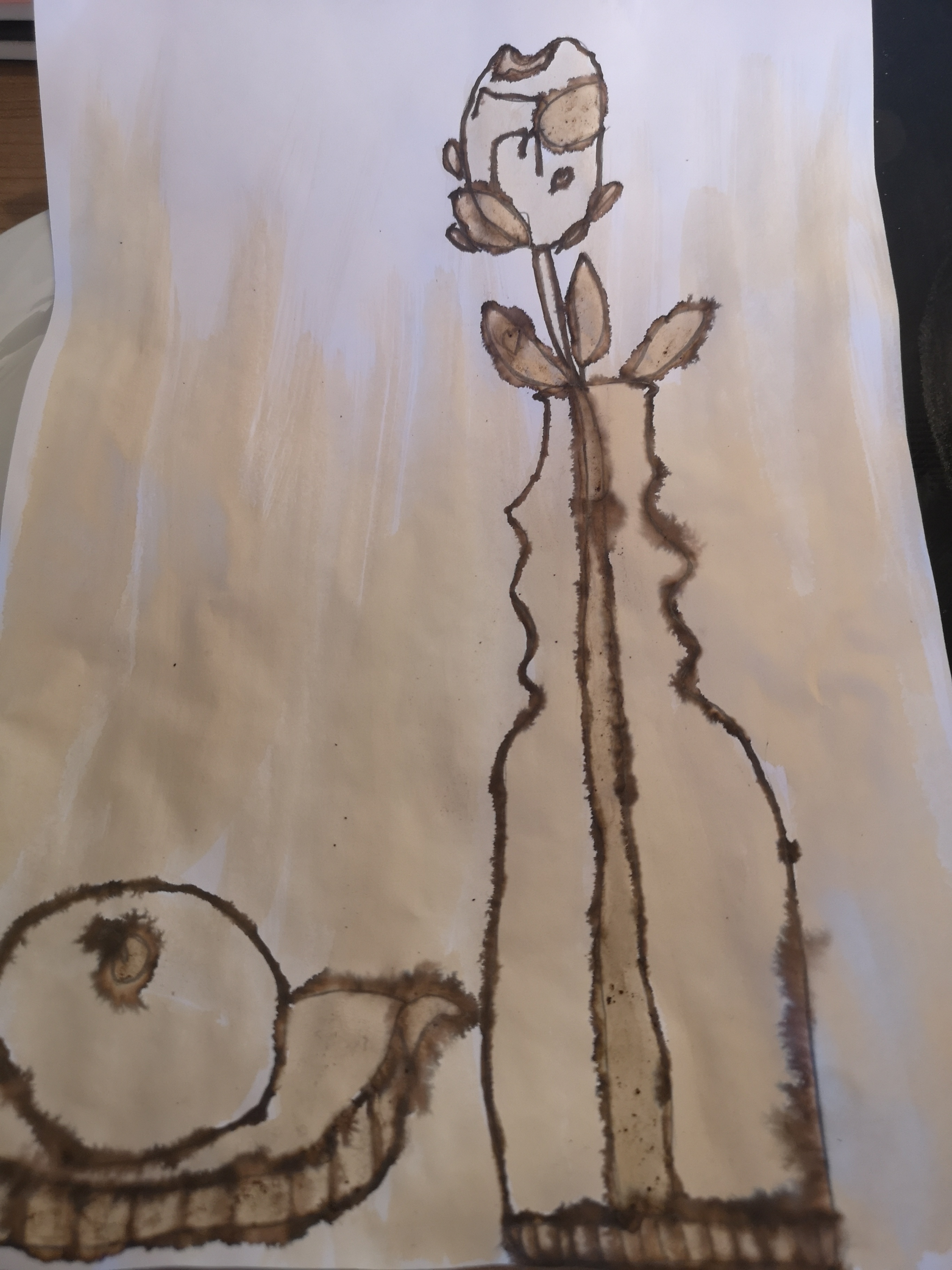 Tretješolci iz Dobrovega in Kojskega smo spet ustvarjali. Ker so naše tempera in vodene barve ostale v šoli, smo si pri slikanju morali pomagati drugače. Skuhali smo kavo in barvali.