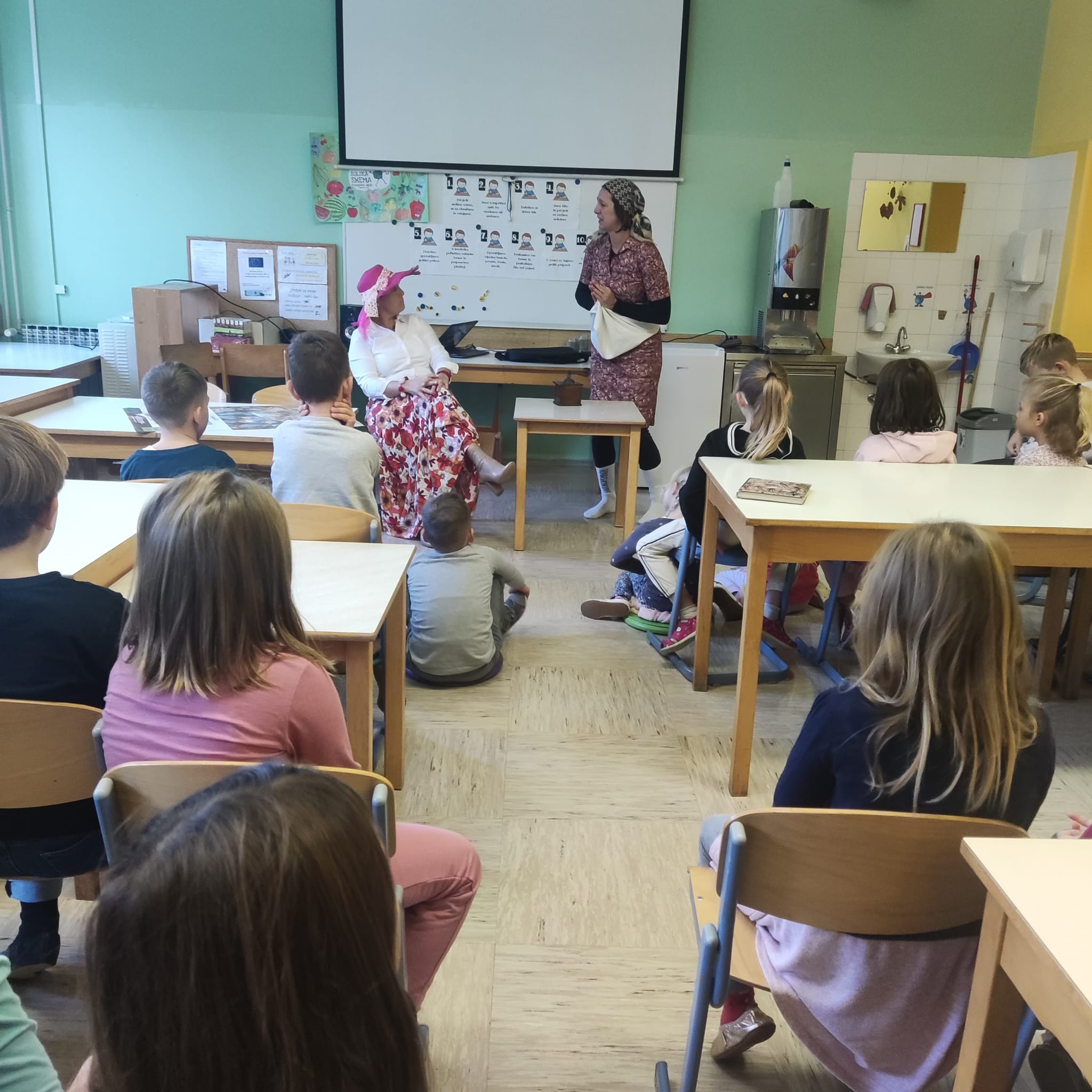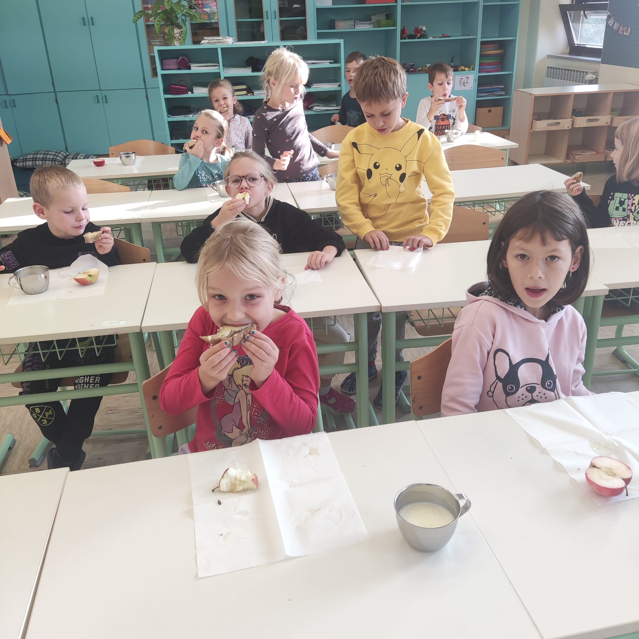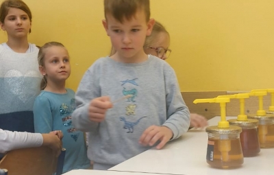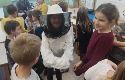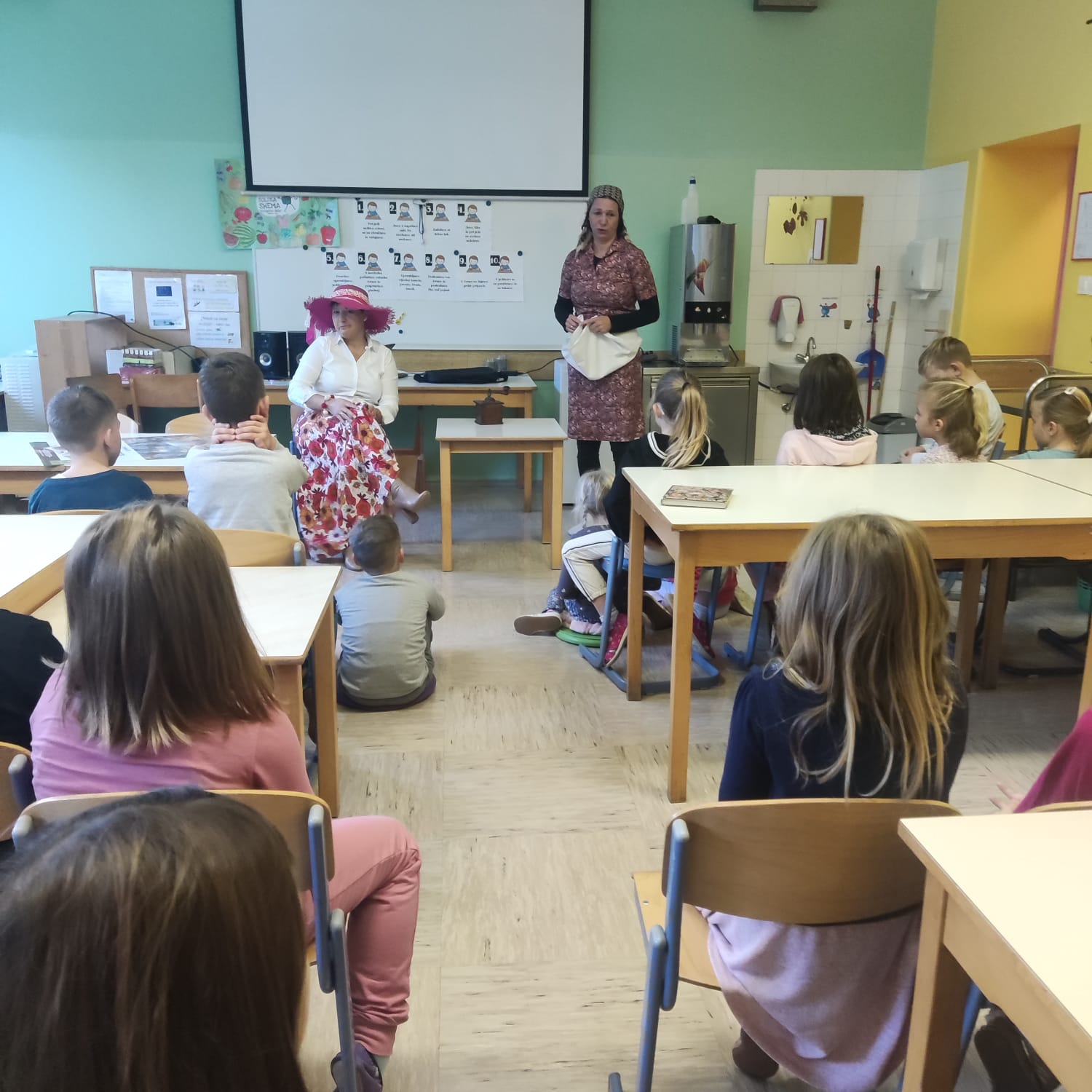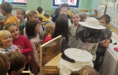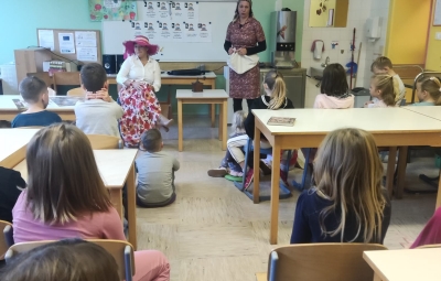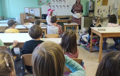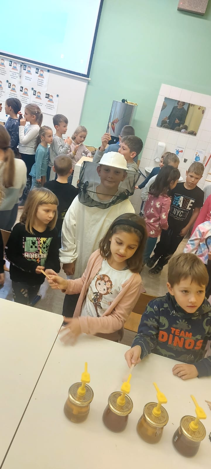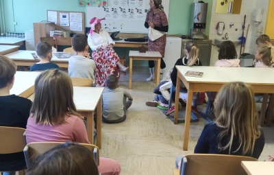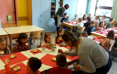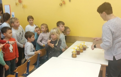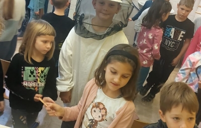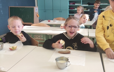 Na podružnični šoli smo teden zaključili s Tradicionalnim slovenskim zajtrkom. Dan smo začeli z ogledom posnetka o omenjenem dogodku, nato pa sta učiteljici Monika in Andrejka za nas uprizorili slovensko ljudsko pravljico o bogati in revni sestri. Končno je sledil že težko pričakovani zajtrk: kruh, maslo, med, jabolka in mleko. Ko smo napolnili želodčke, nas je obiskala čebelarka Elis iz čebelarstva Batištuta in nam dala možnost, da smo preizkusili različne vrste medu ter cvetni prah. Za njen obisk se ji lepo zahvaljujemo. Veseli smo, da sta na ta dan bili z nami tudi učiteljici s Poljske in tako spoznali delček naše kulture.