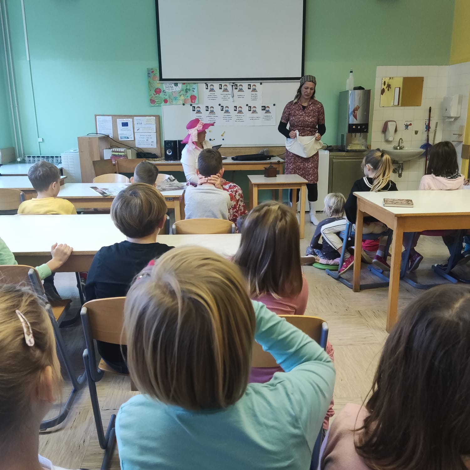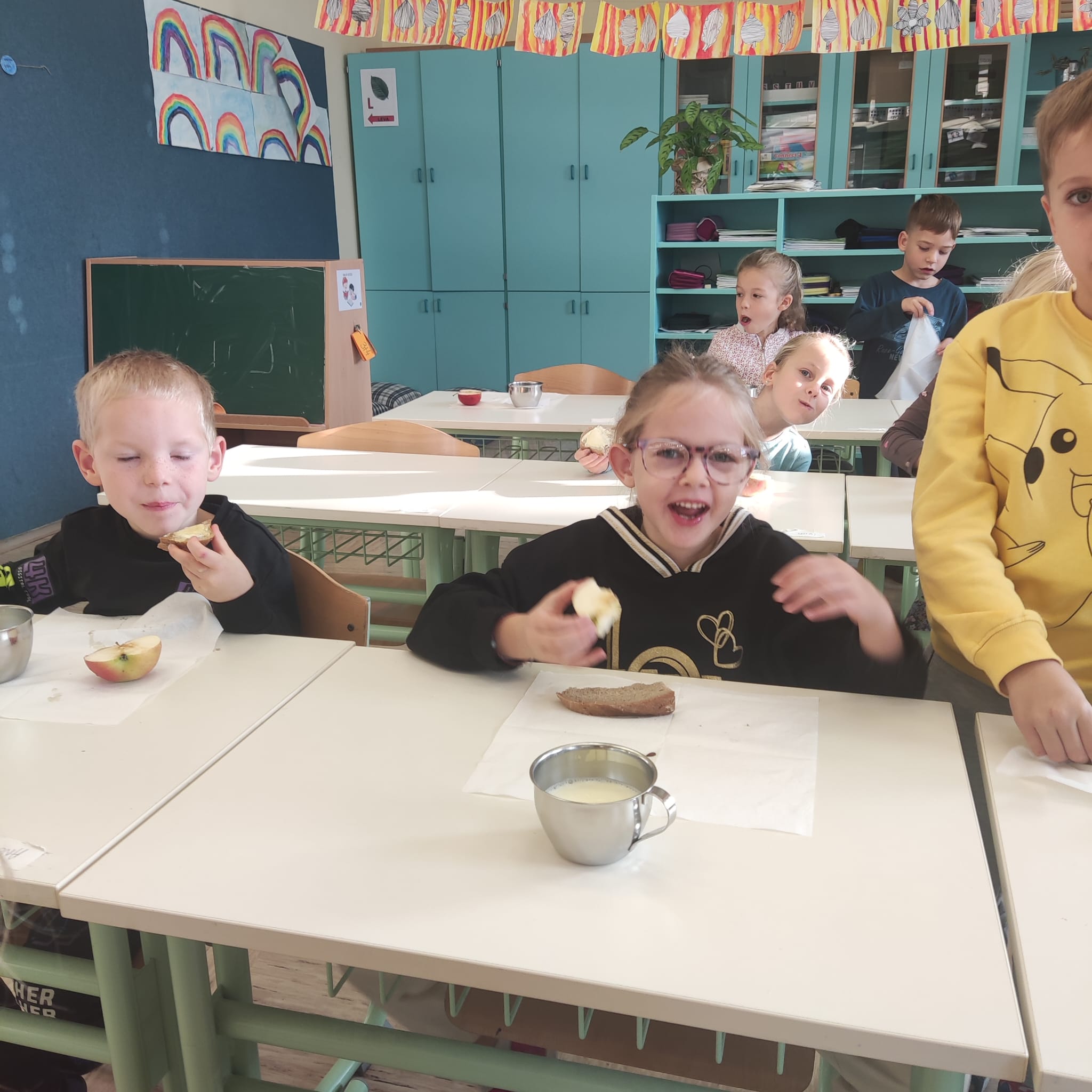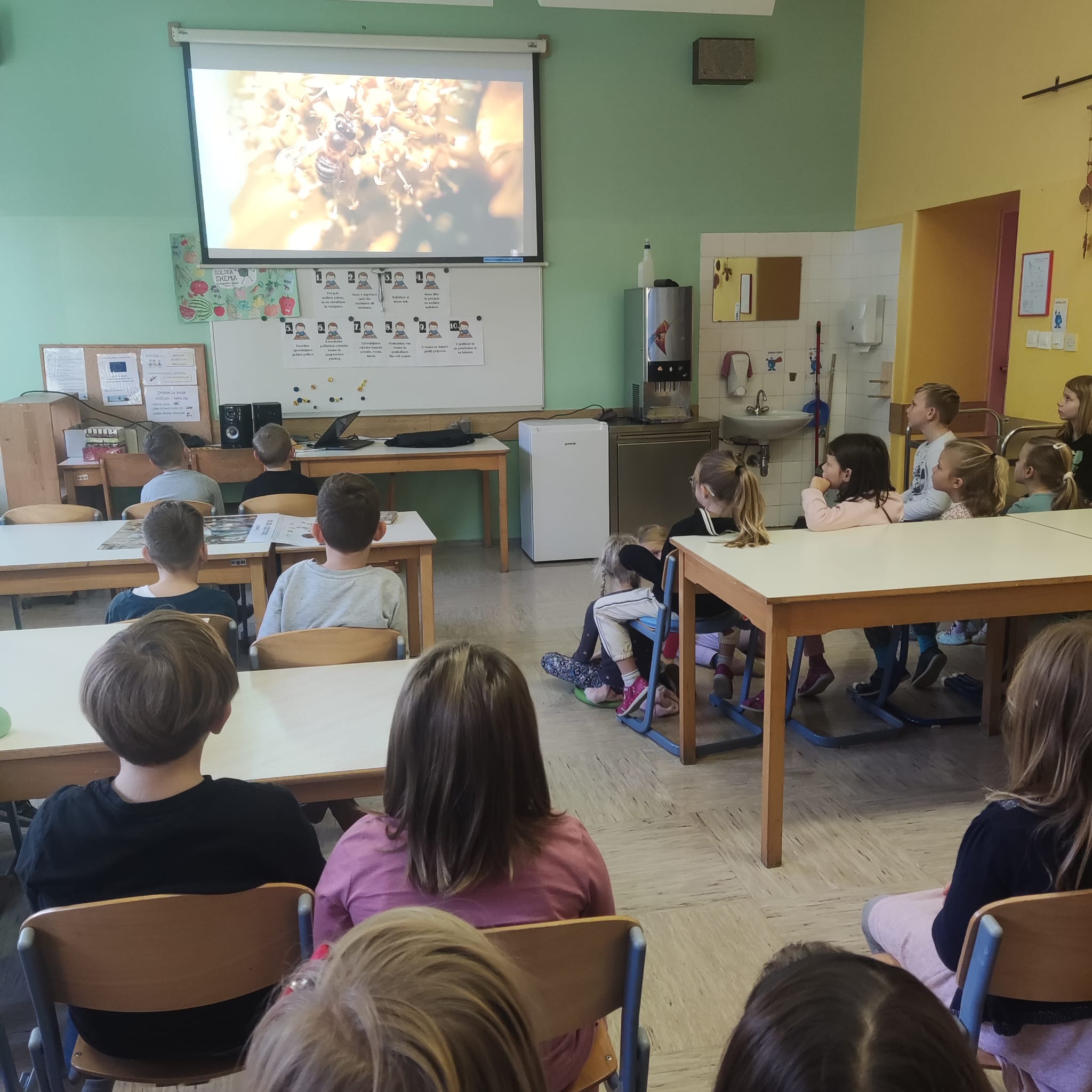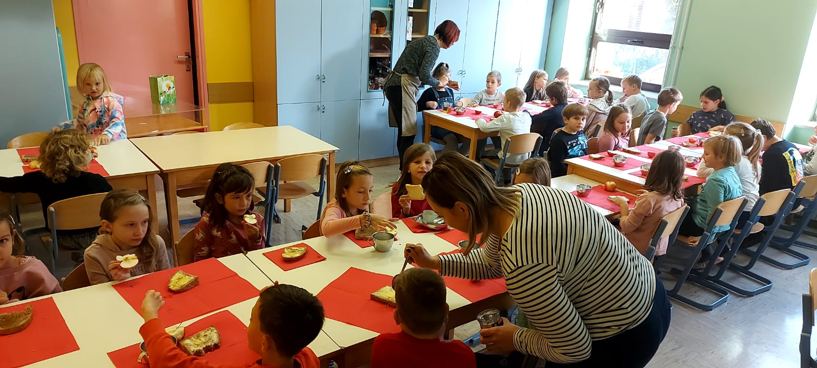 Na podružnični šoli smo teden zaključili s Tradicionalnim slovenskim zajtrkom. Dan smo začeli z ogledom posnetka o omenjenem dogodku, nato pa sta učiteljici Monika in Andrejka za nas uprizorili slovensko ljudsko pravljico o bogati in revni sestri. Končno je sledil že težko pričakovani zajtrk: kruh, maslo, med, jabolka in mleko. Ko smo napolnili želodčke, nas je obiskala čebelarka Elis iz čebelarstva Batištuta in nam dala možnost, da smo preizkusili različne vrste medu ter cvetni prah. Za njen obisk se ji lepo zahvaljujemo. Veseli smo, da sta na ta dan bili z nami tudi učiteljici s Poljske in tako spoznali delček naše kulture.