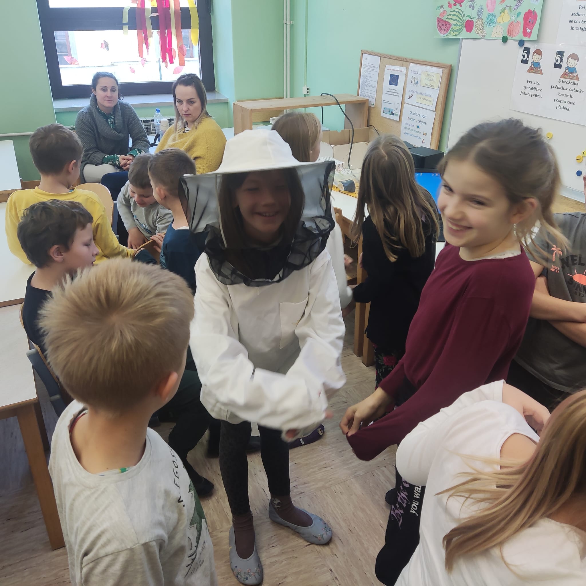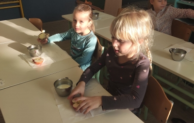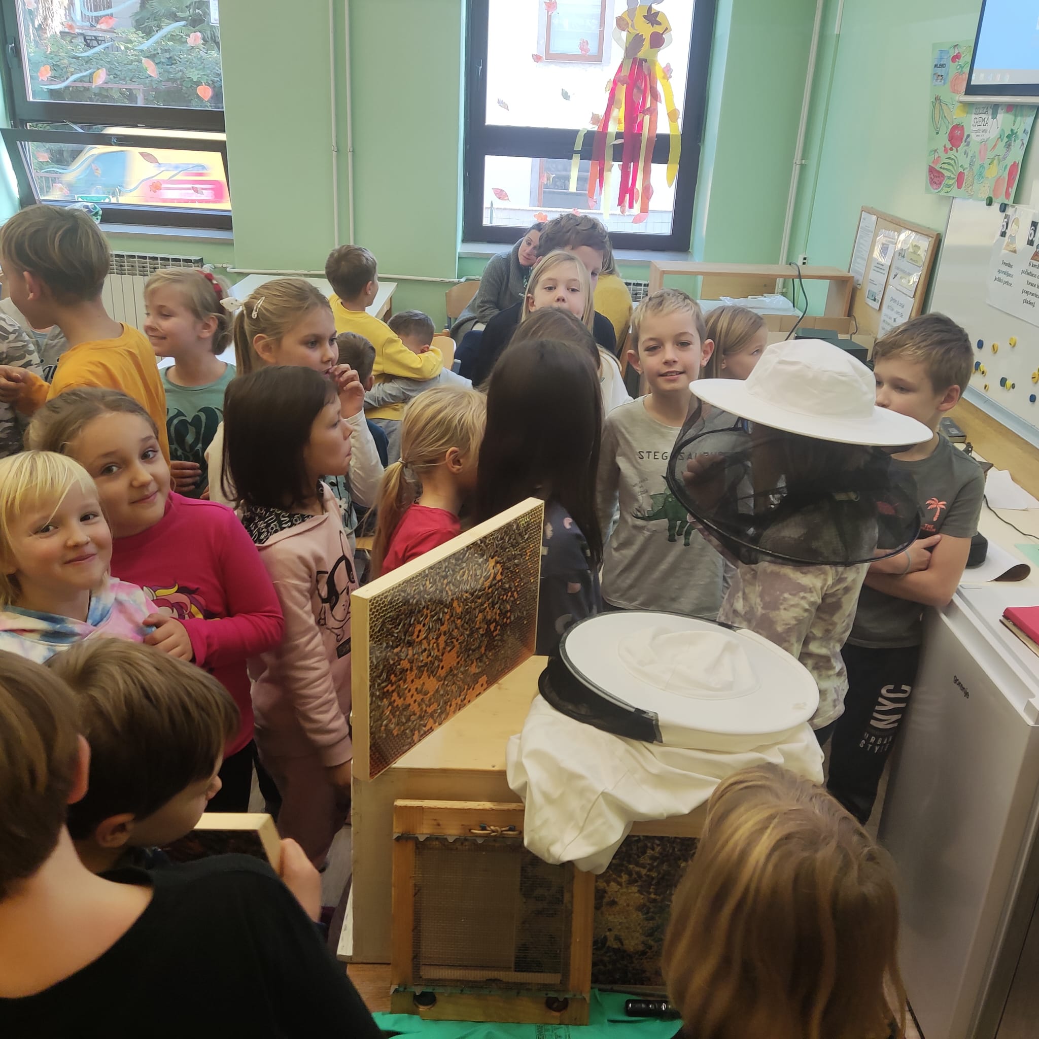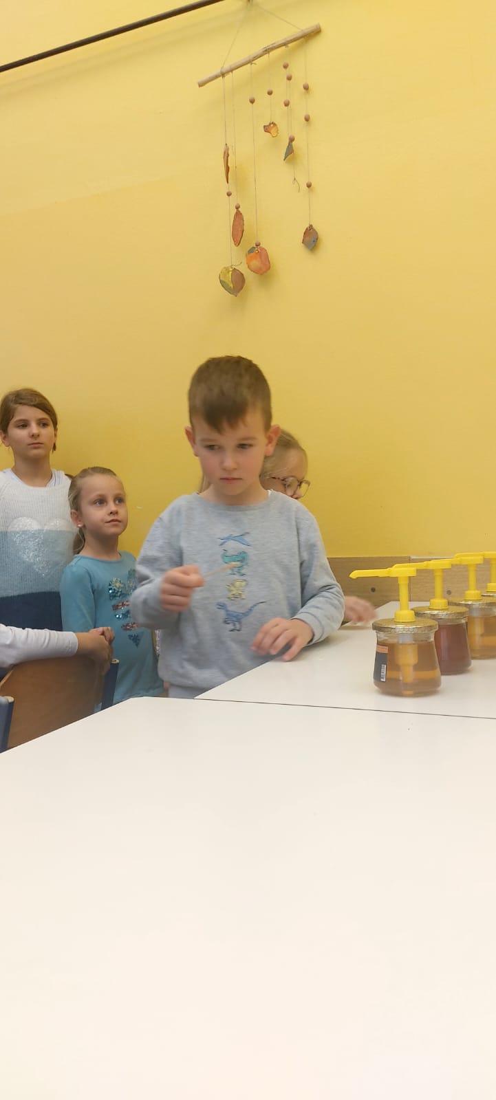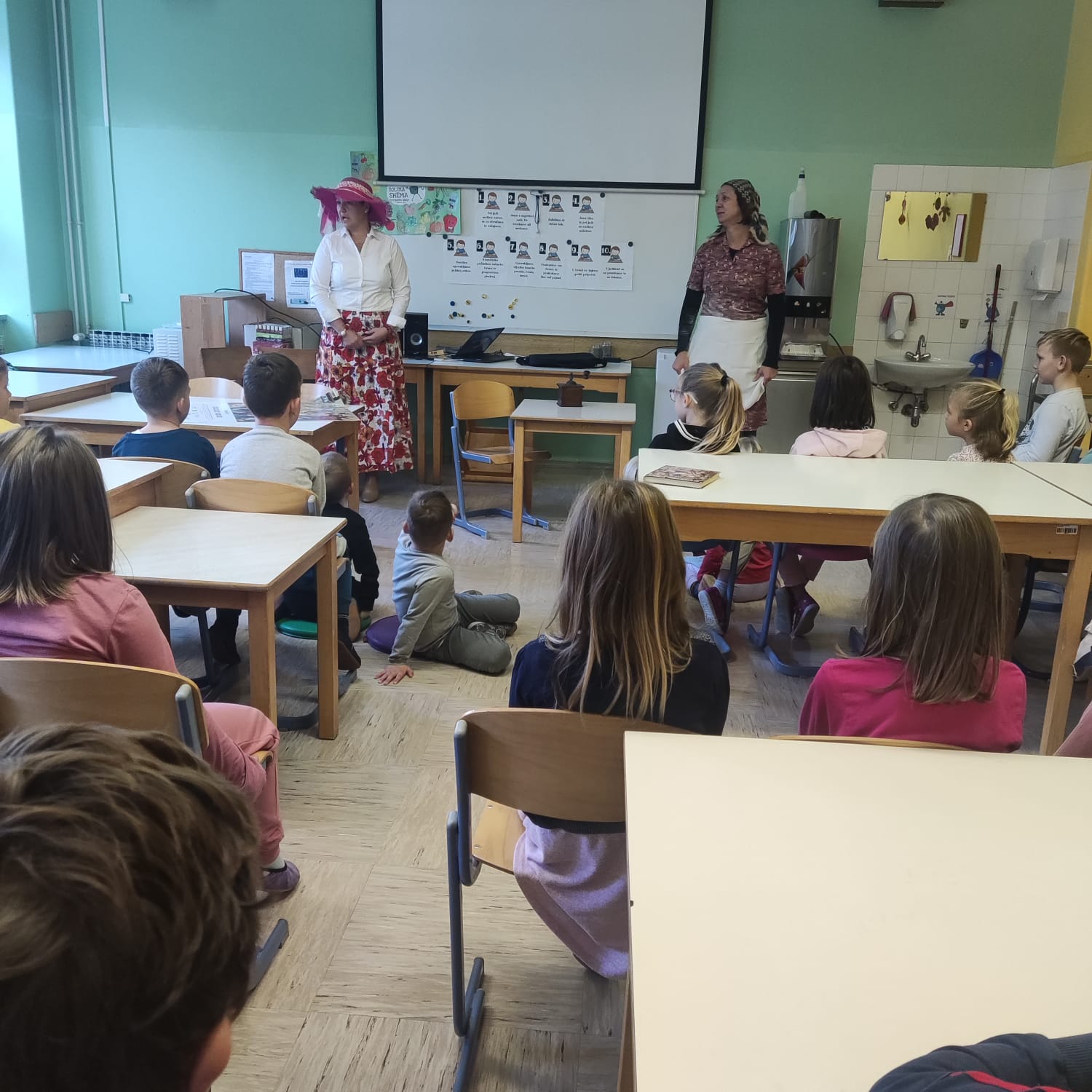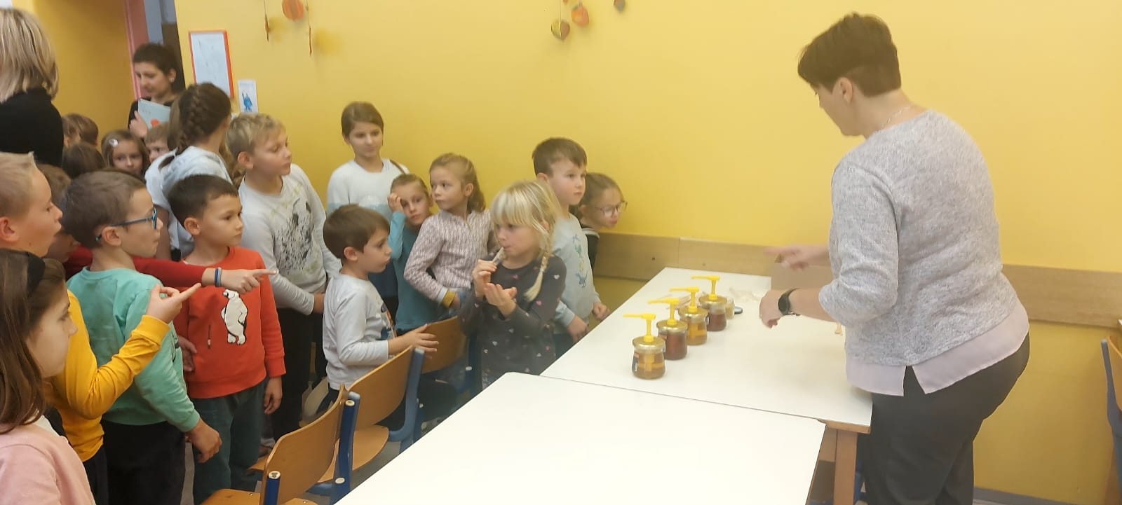 Na podružnični šoli smo teden zaključili s Tradicionalnim slovenskim zajtrkom. Dan smo začeli z ogledom posnetka o omenjenem dogodku, nato pa sta učiteljici Monika in Andrejka za nas uprizorili slovensko ljudsko pravljico o bogati in revni sestri. Končno je sledil že težko pričakovani zajtrk: kruh, maslo, med, jabolka in mleko. Ko smo napolnili želodčke, nas je obiskala čebelarka Elis iz čebelarstva Batištuta in nam dala možnost, da smo preizkusili različne vrste medu ter cvetni prah. Za njen obisk se ji lepo zahvaljujemo. Veseli smo, da sta na ta dan bili z nami tudi učiteljici s Poljske in tako spoznali delček naše kulture.