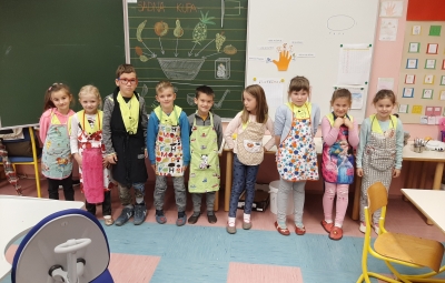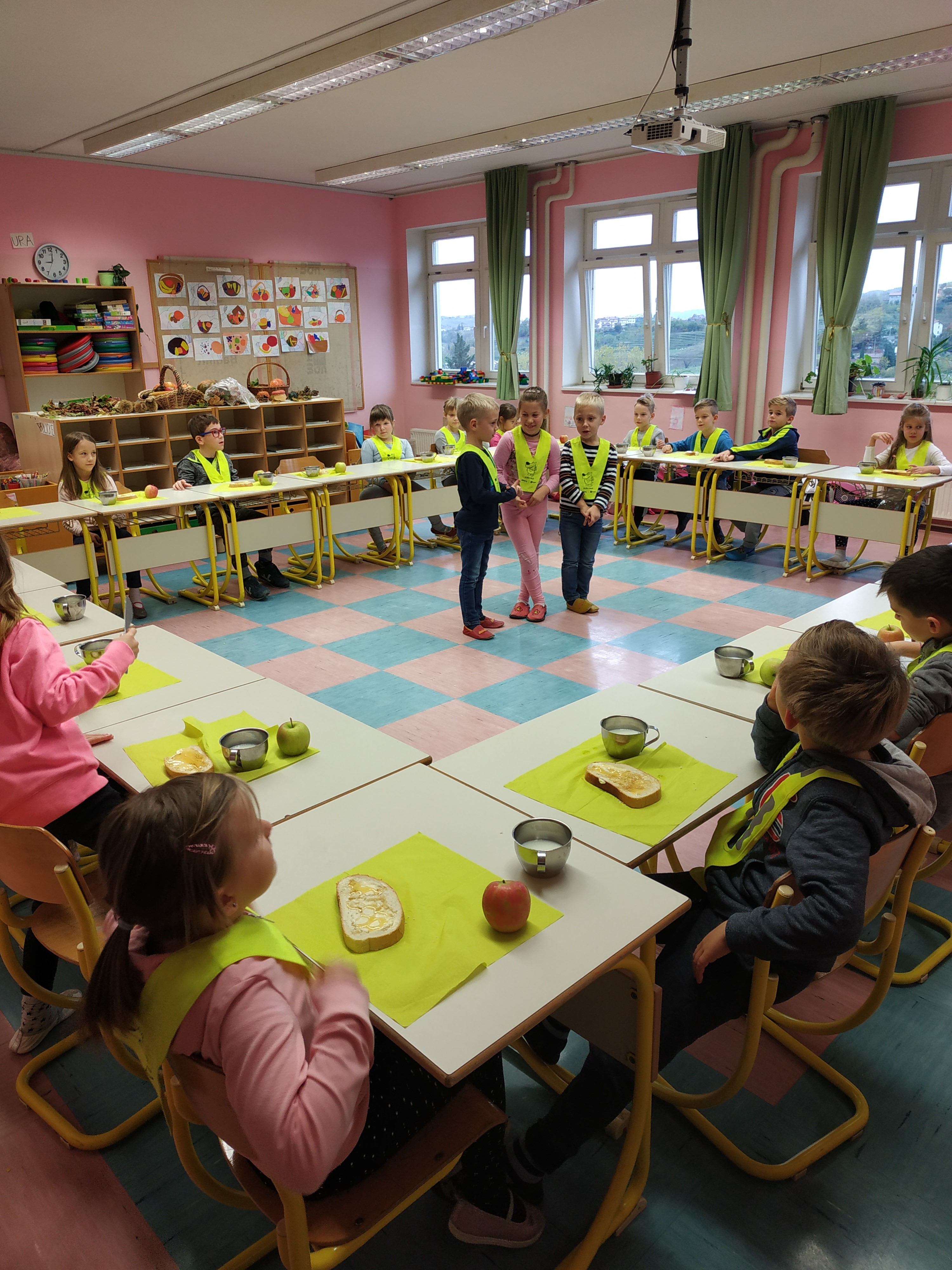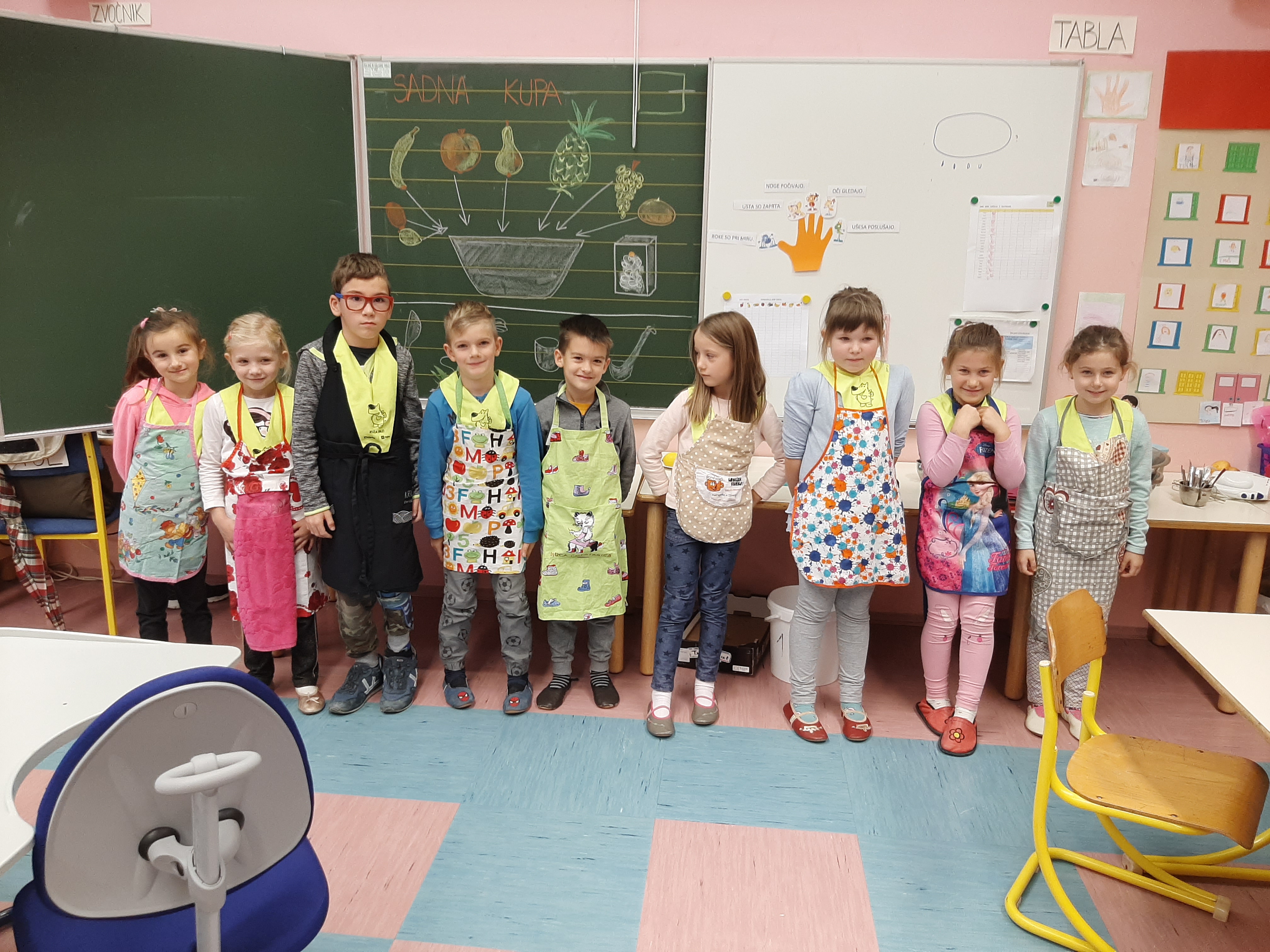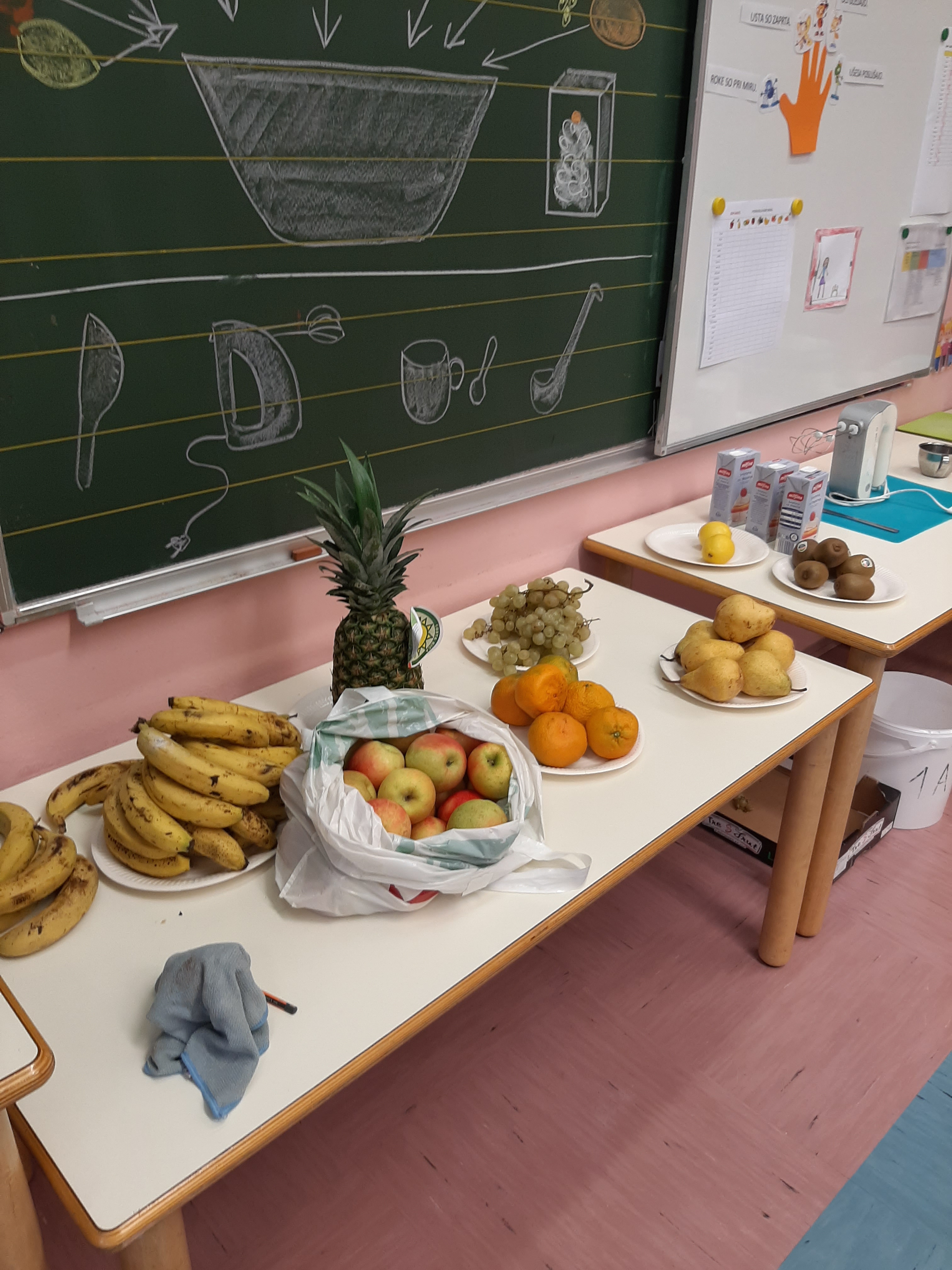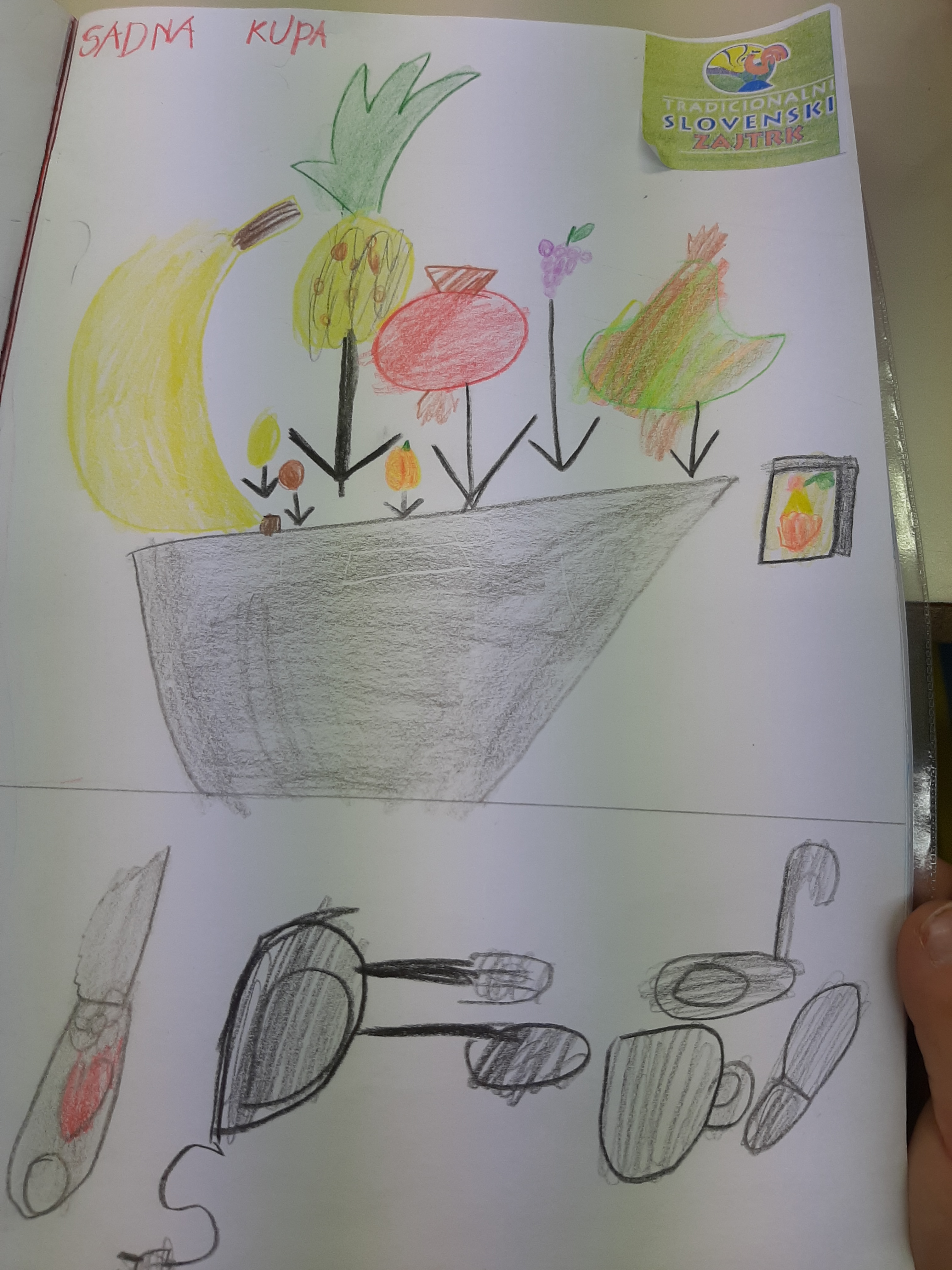 Dan smo začeli z zdravim zajtrkom. Pogovarjali smo se o pomenu zajtrka in uživanju lokalno pridelane hrane. S prikazom s stolpci smo ugotovili, katero sadje imamo najraje. Narisali smo recept za pripravo sadne kupe. V roke smo vzeli nože in lupili in rezali jabolka, hruške, kivi, mandarine in ananas. Dodali smo še limonin sok in stepeno smetano. Sadna kupa je bila narejena. Posladkali smo se s sadno kupo. Zelo nam je teknila.