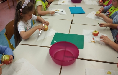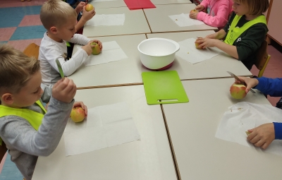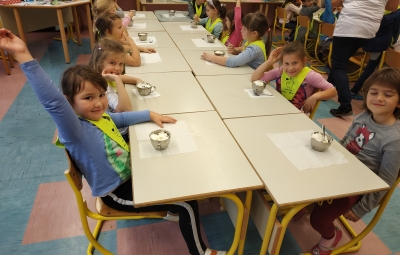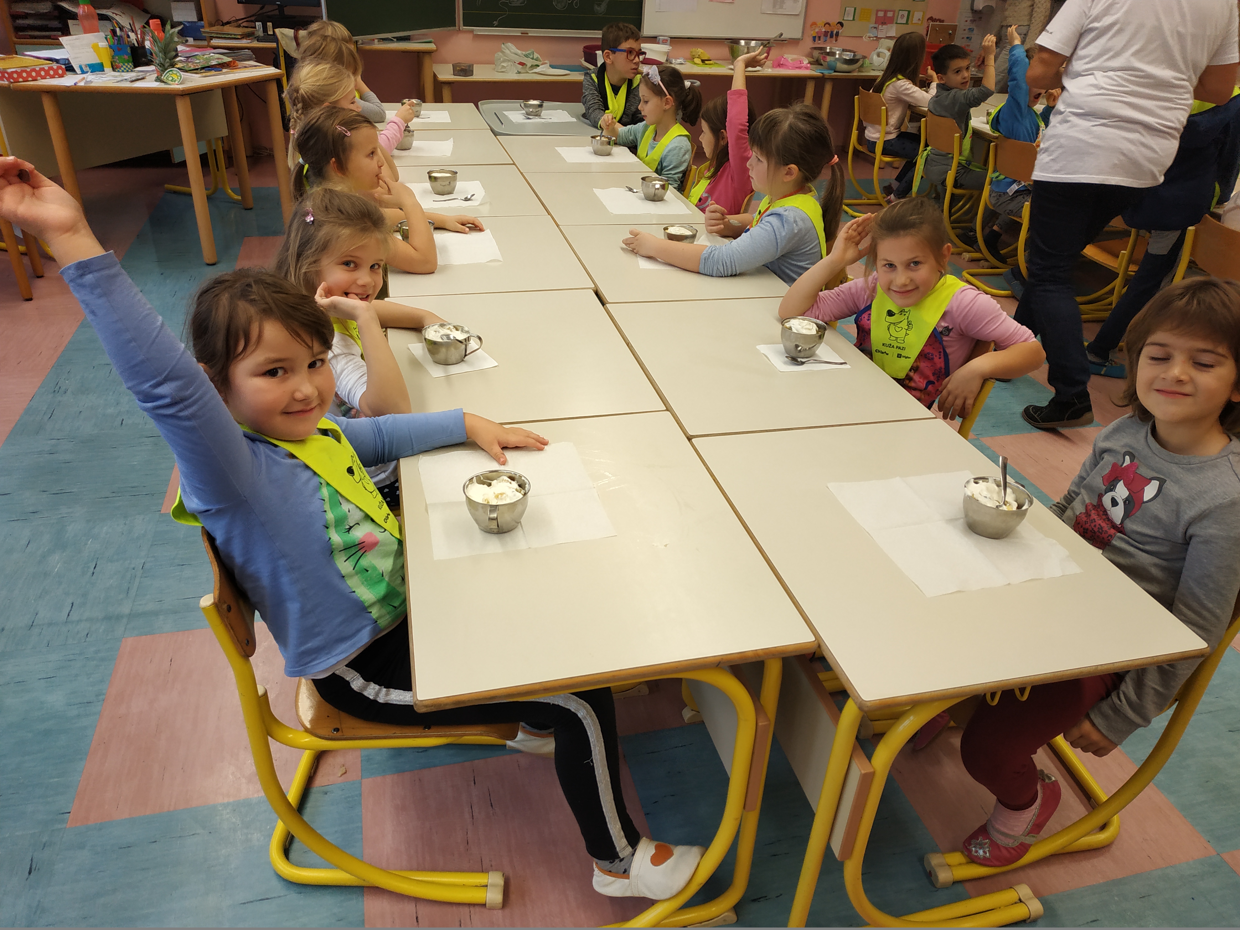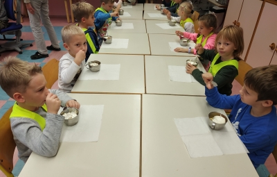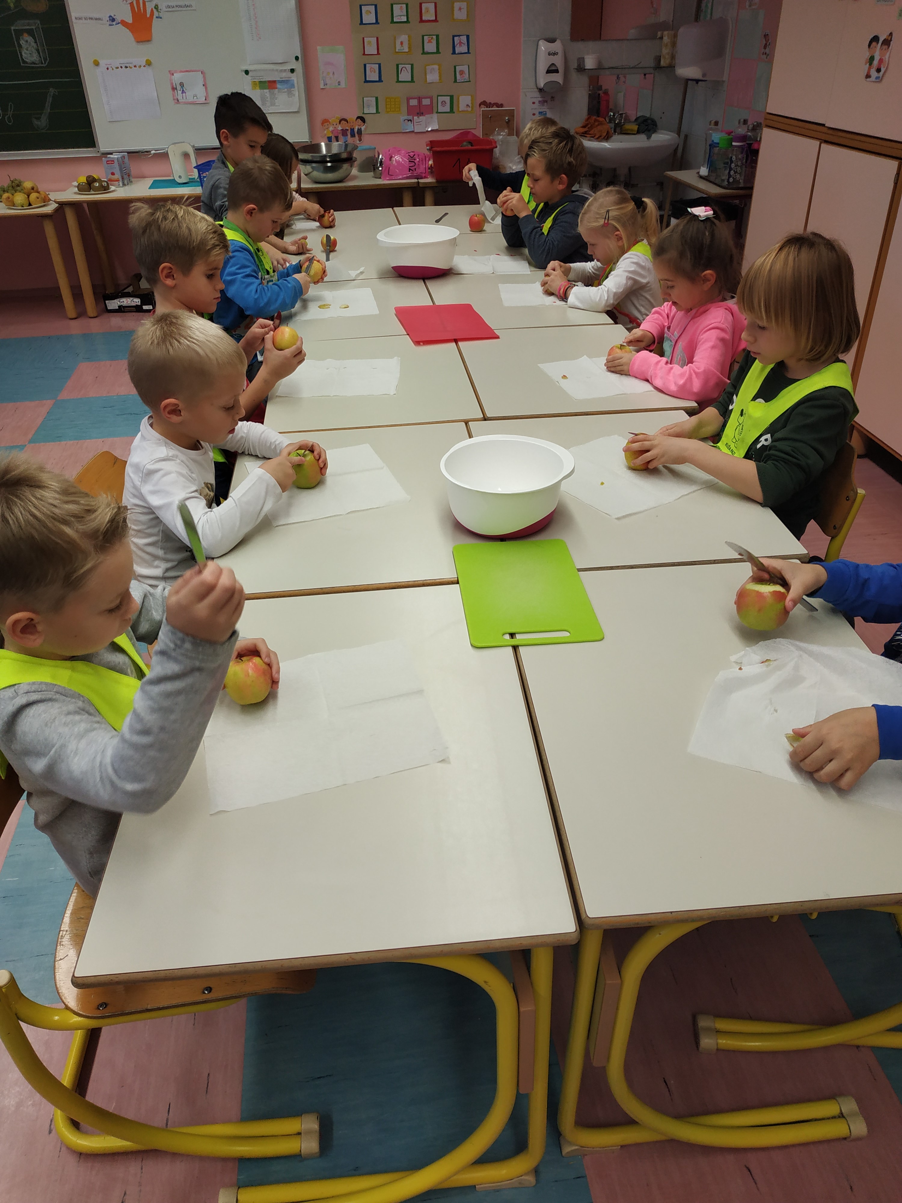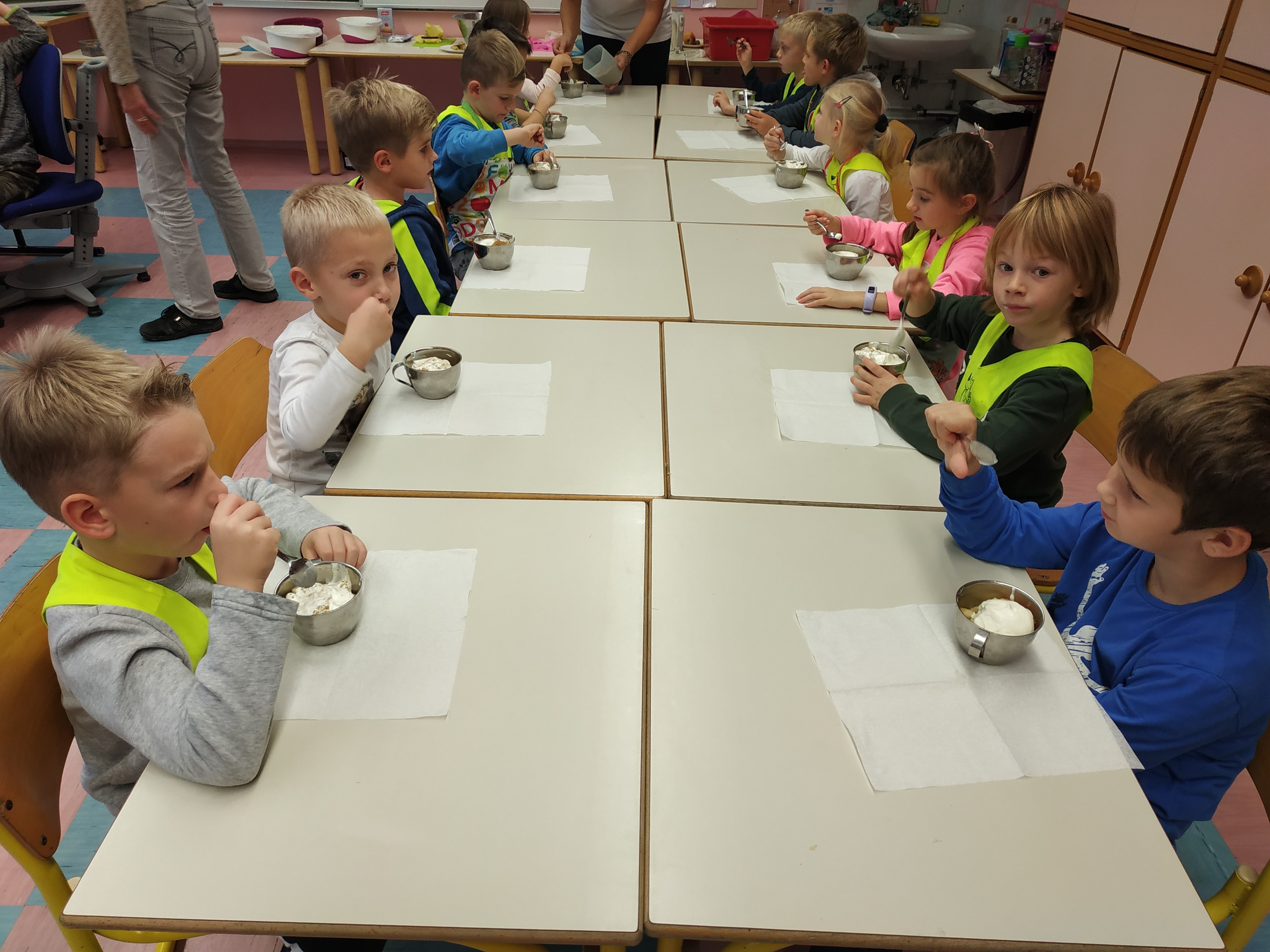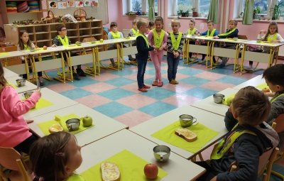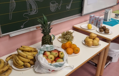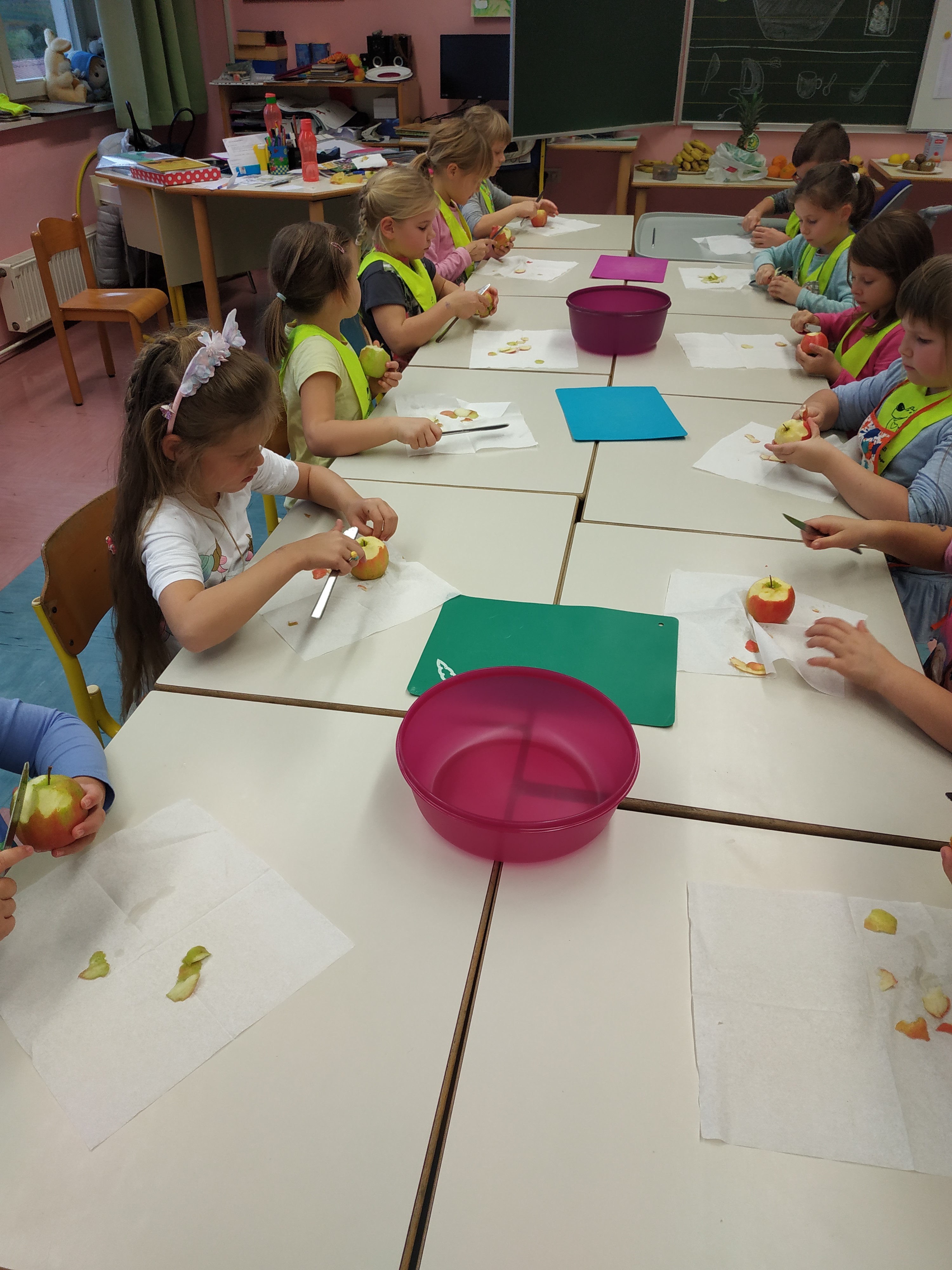 Dan smo začeli z zdravim zajtrkom. Pogovarjali smo se o pomenu zajtrka in uživanju lokalno pridelane hrane. S prikazom s stolpci smo ugotovili, katero sadje imamo najraje. Narisali smo recept za pripravo sadne kupe. V roke smo vzeli nože in lupili in rezali jabolka, hruške, kivi, mandarine in ananas. Dodali smo še limonin sok in stepeno smetano. Sadna kupa je bila narejena. Posladkali smo se s sadno kupo. Zelo nam je teknila.