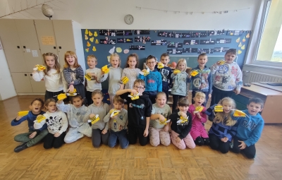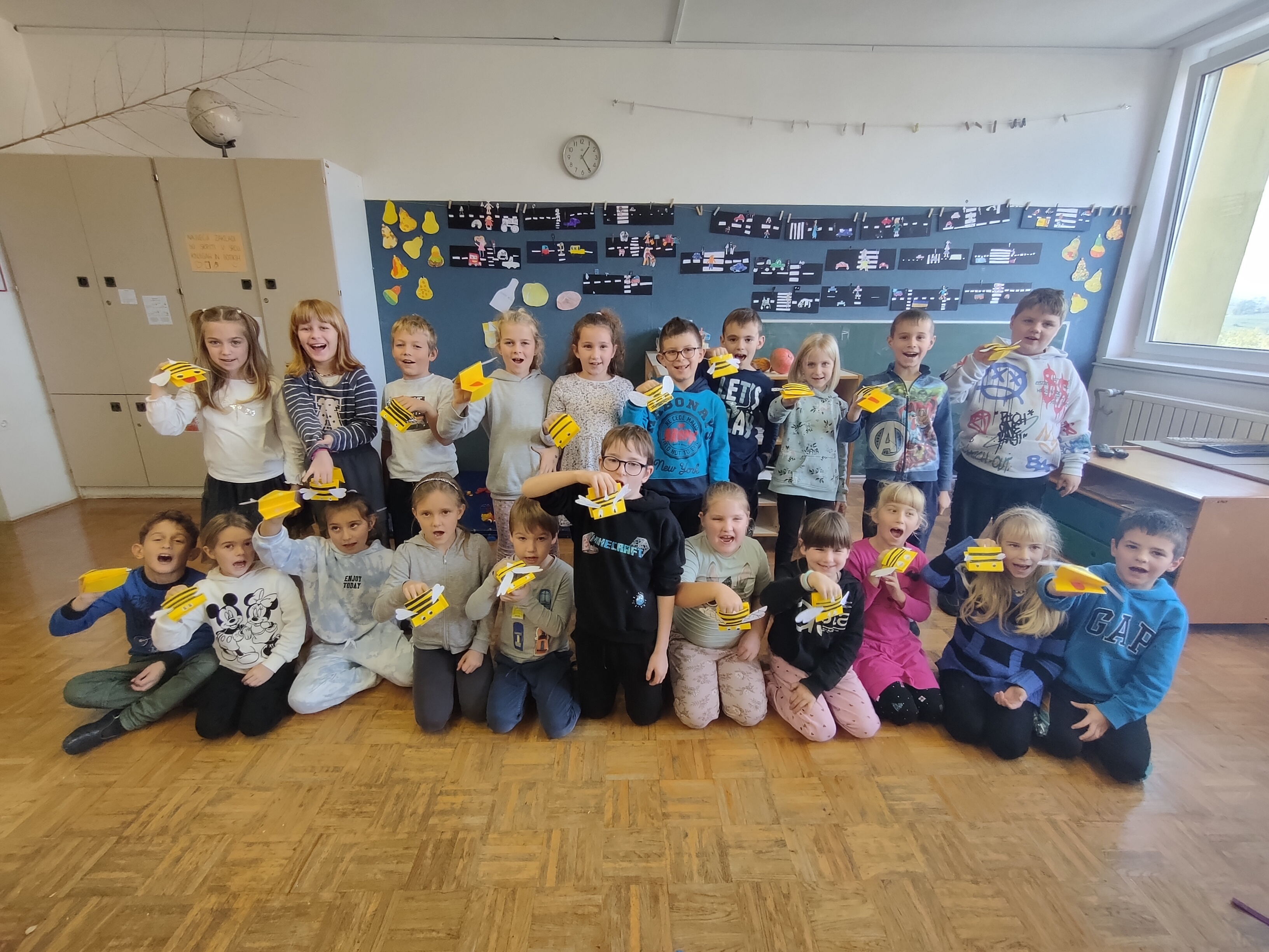 Prvo uro smo se udeležili prireditve ob otvoritvi prenovljene šolske kuhinje. Pozajtrkovali, zaplesali, prisluhnili pravljici o pogumni čebelici Meli in si izdelali vsak svojo čebelico.