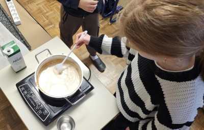 Danes smo učenci 4.a pri pouku naravoslovja iz sladkorja naredili karamelo. Bilo je zelo zabavno, saj tega nismo pričakovali. Med kuhanjem smo se učenci naučili, da je sladkor potrebno neprestano mešati, da se ne zažge. Ko je iz sladkorja nastala karamela, jo je učiteljica previdno vlila v pekač, v katerega smo učenci položili več lesenih palčk. S poskusom smo dokazali, da je lahko sladkor trden ali tekoč. Ko se je karamela strdila, se je zelo svetila. Bila je dobra in je zelo hrustala v ustih. Bilo je je veliko, saj nas je v razredu kar 21! Nihče ni imel pripomb nad karamelo, ker je bila dobra. Iz tega, kar je ostalo v loncu, smo naredili še karamelno mleko. Počutili smo se odlično. Upamo, da se še ponovi.