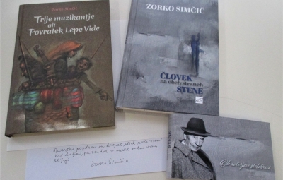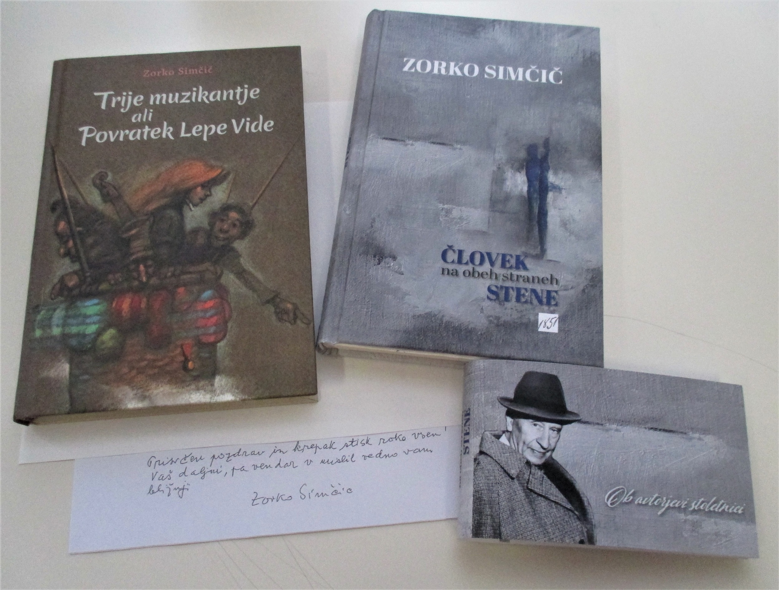 Podaril nam je dve njegovi knjigi, in sicer Trije muzikantje ali Povratek Lepe Vide in knjigo, ki je izšla letos, ob njegovi stoletnici Človek na obeh straneh stene. Iskrena hvala.
