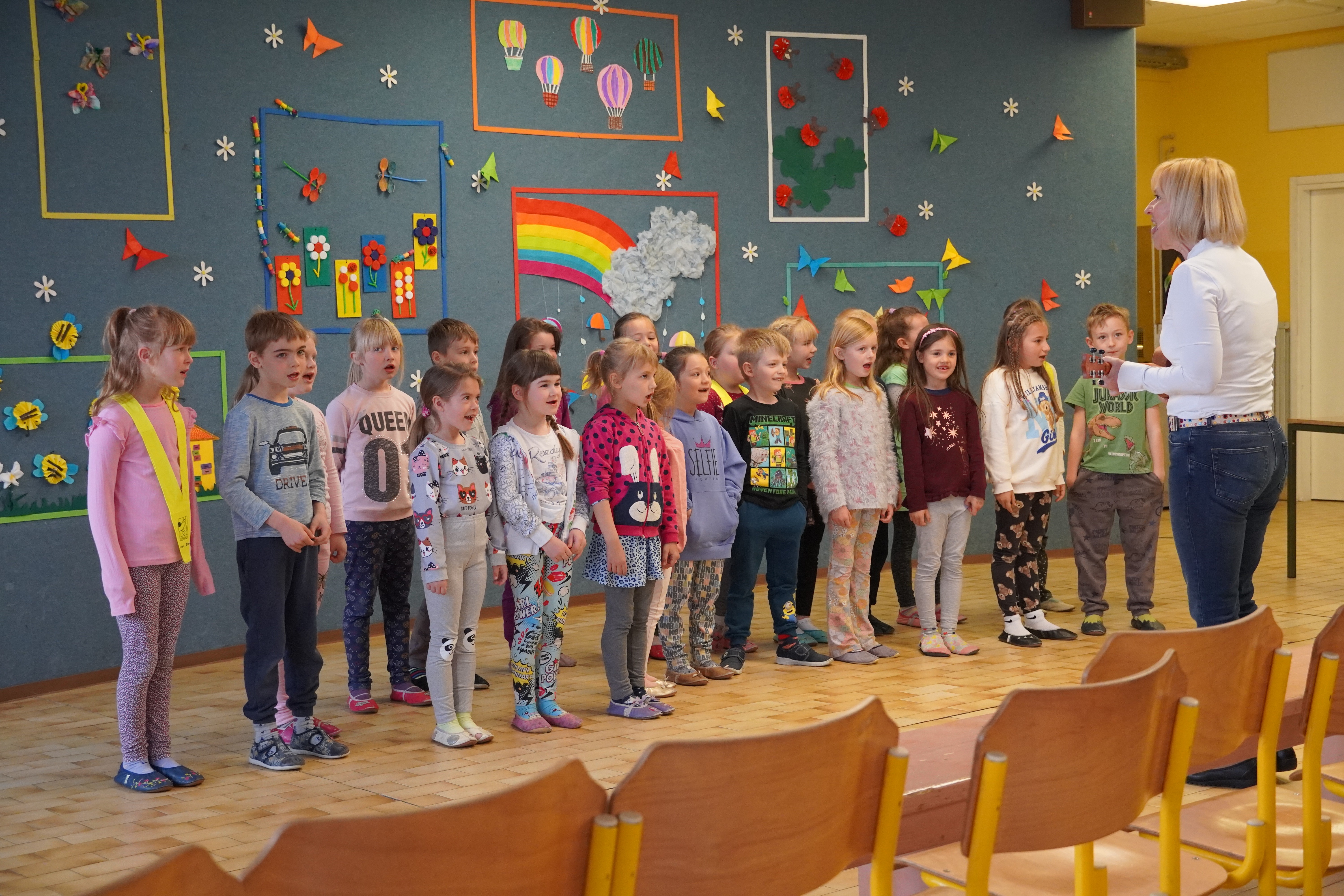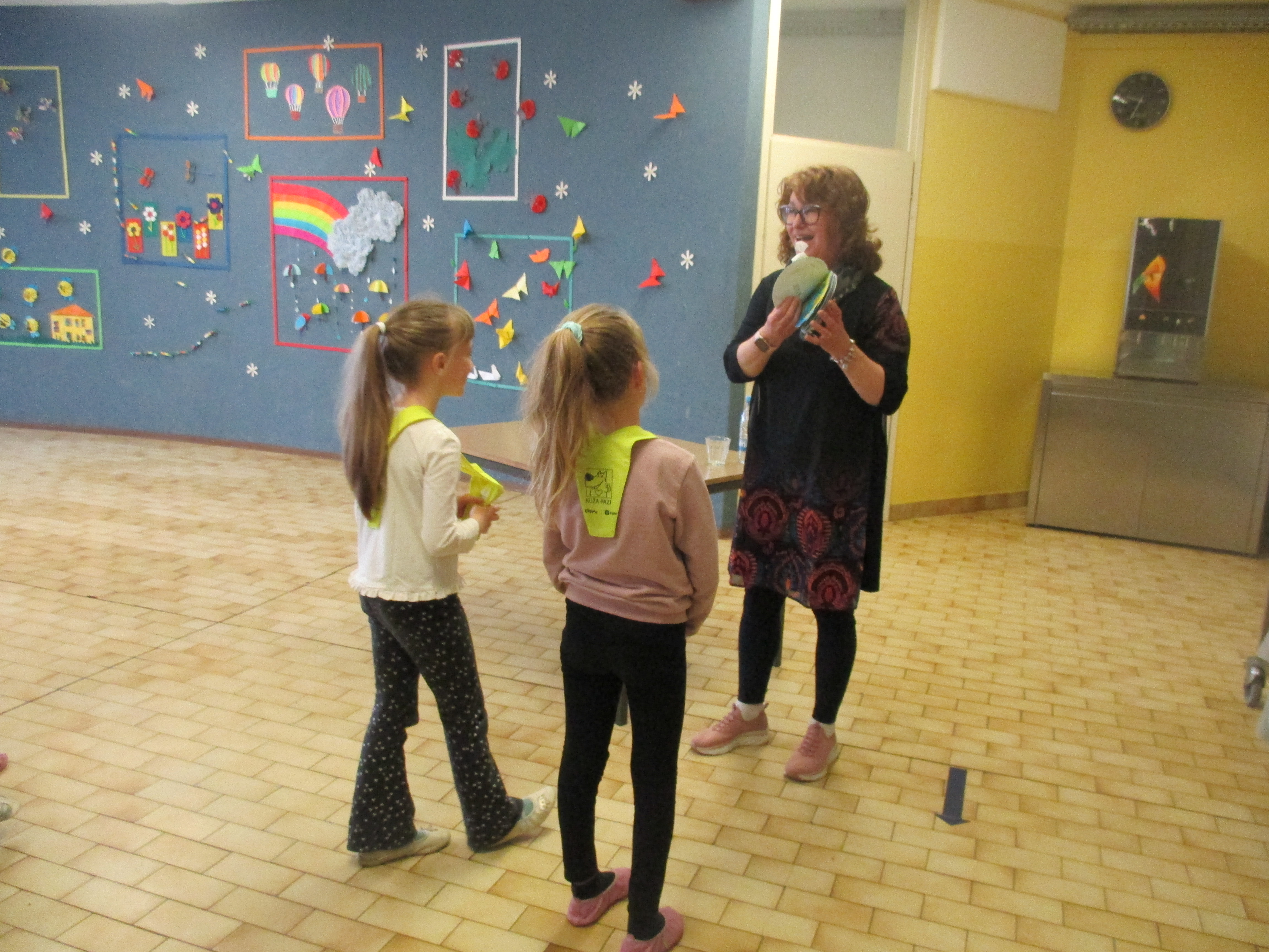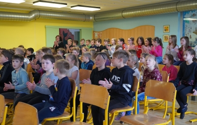V šolski jedilnici se je 1. šolsko uro srečala z učenci 2. in 3. triade, 2. šolsko uro z učenci 1. triade, ob 11.00 uri pa je obiskala še učence POŠ Kojsko.