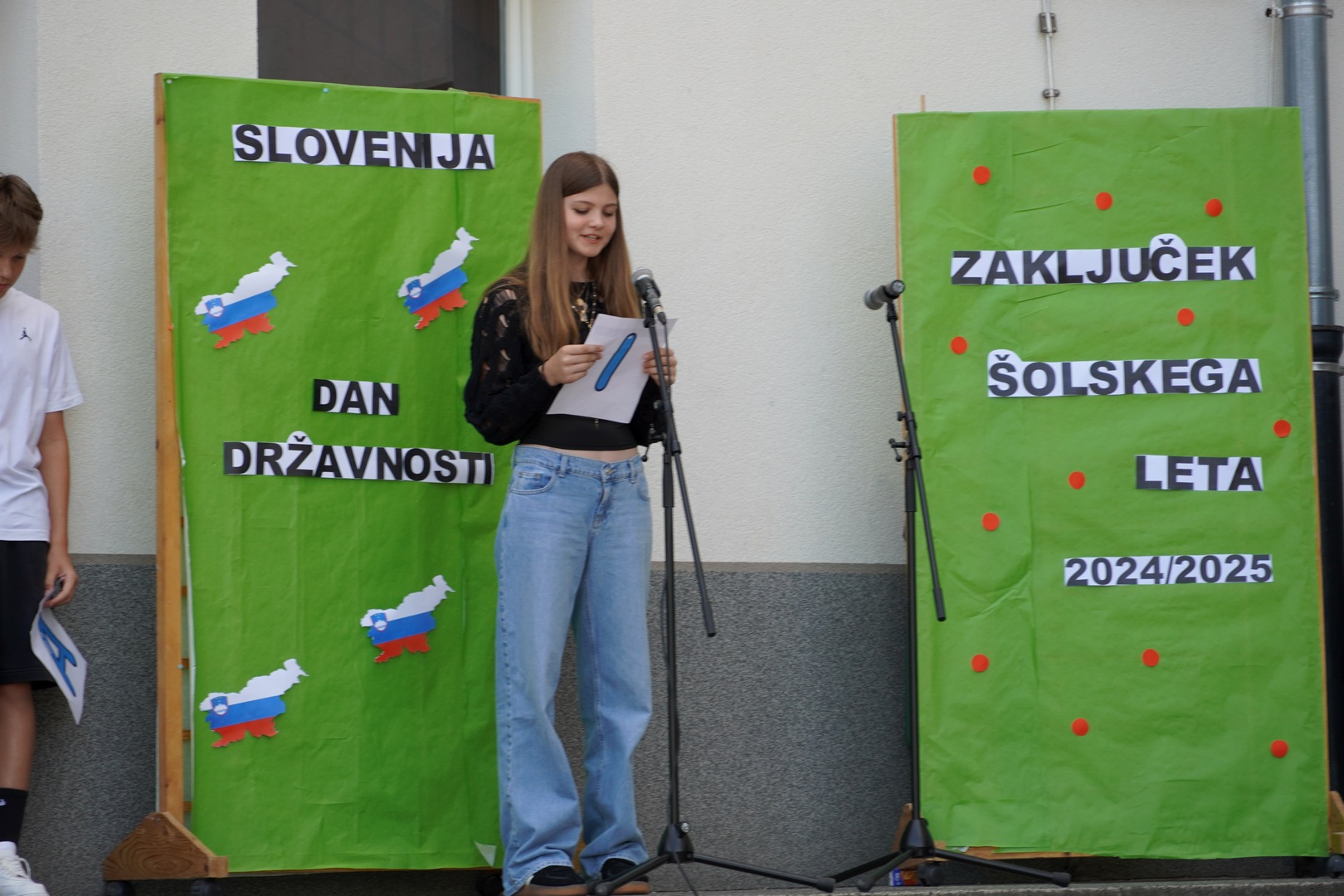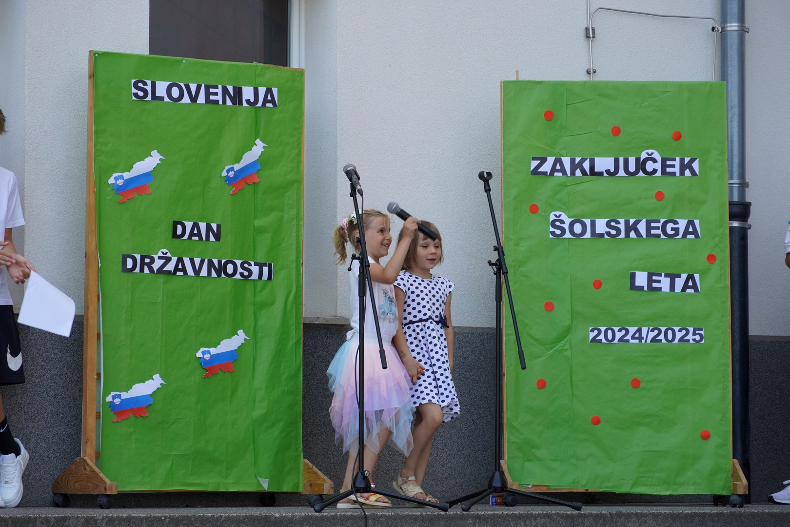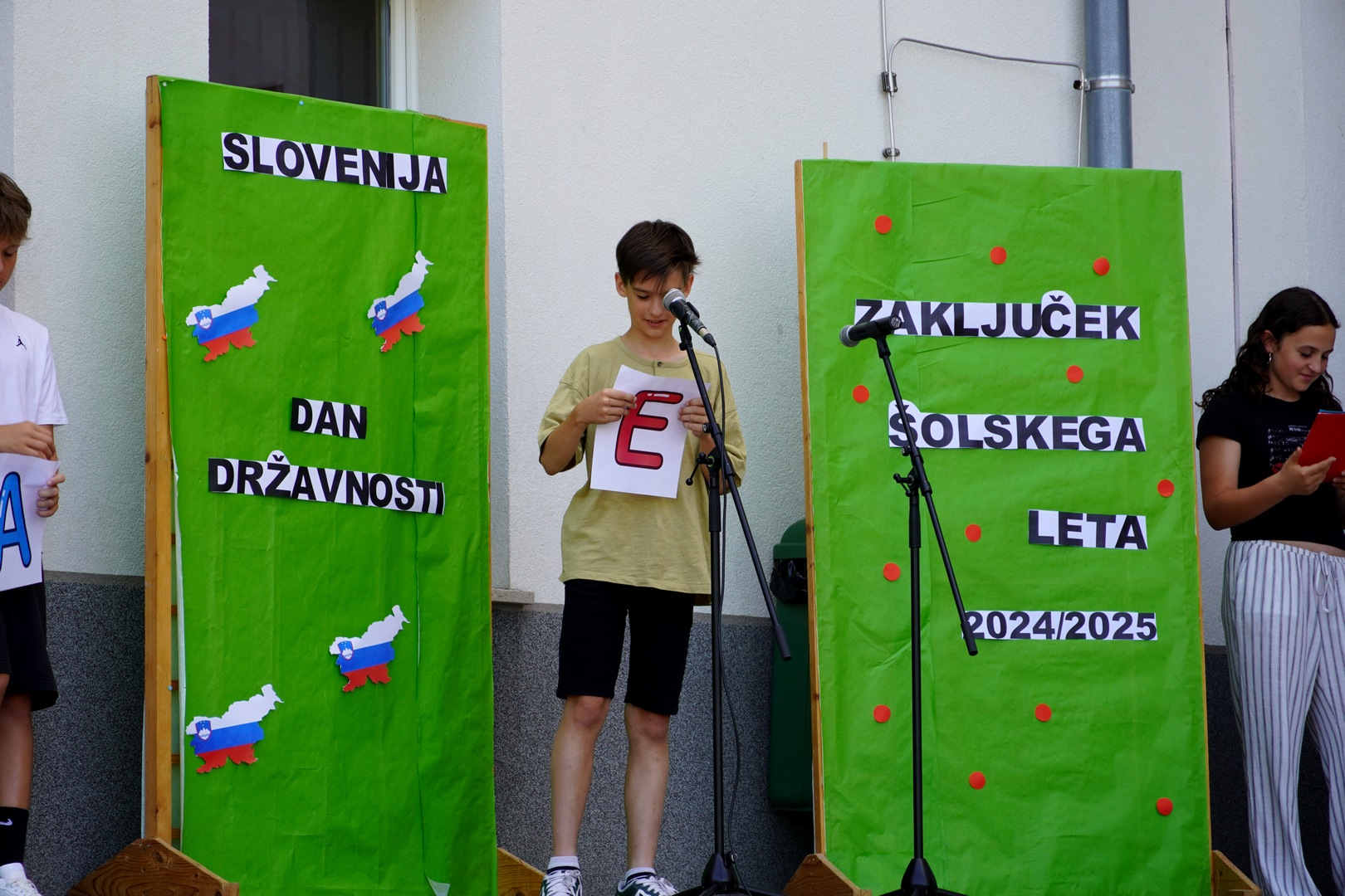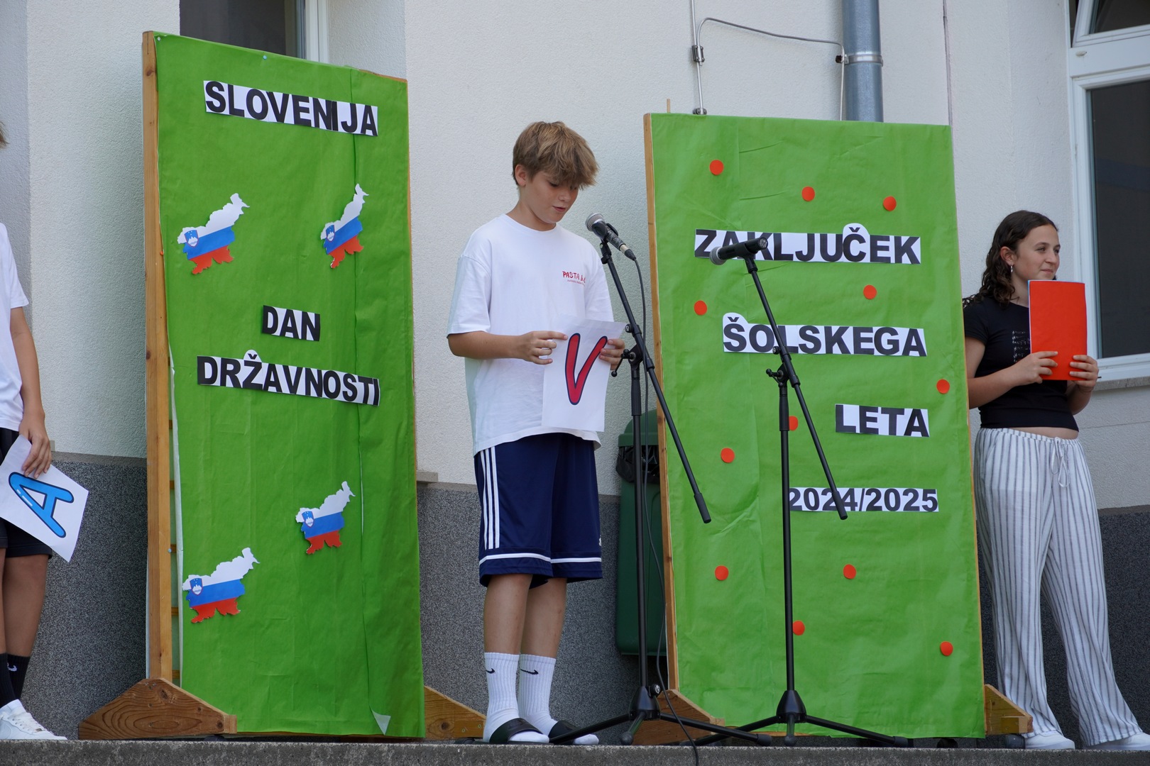 Začeli smo z dvema urama, v katerih so učenci skupaj z razredniki pogovorili o vseh pomembnih trenutkih letošnjega šolskega leta. Poudarili smo dosežke, se dotaknili prihodnjih ciljev in si izmenjali vtise. Po tem smo na šolskem igrišču proslavili dan državnosti – spremljali smo pevce, otroški zbor ter atraktiven plesni nastop. Po slovesnem delu je sledila osvežitev z okusnim sladoledom.