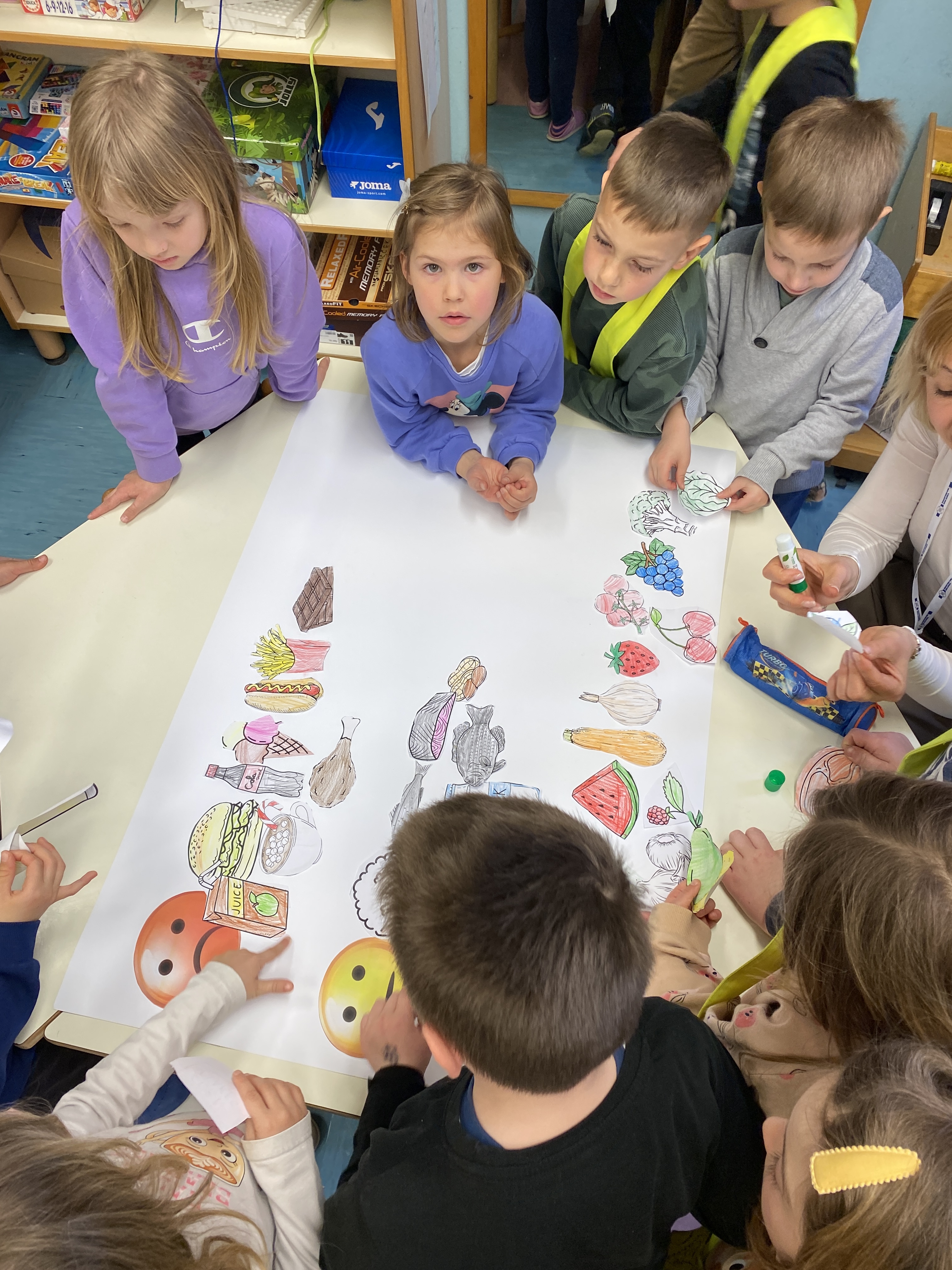 Za zaključek smo svoje znanje pokazali še v praksi. Skupaj smo izdelali plakat o zdravem načinu življenja in razvrščali živila v tri različne skupine: zdrava živila, živila, ki jih uživamo občasno, in tista, ki jih je bolje uživati redkeje. Ugotovili smo, da imamo prav sadje in zelenjavo najraje, kar nas je še posebej razveselilo.