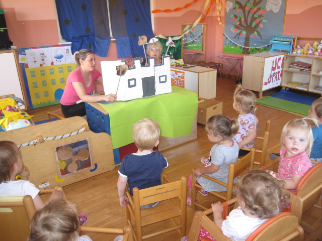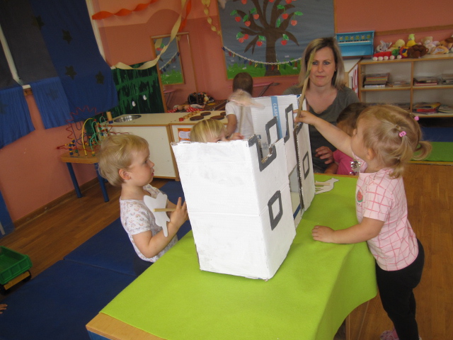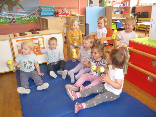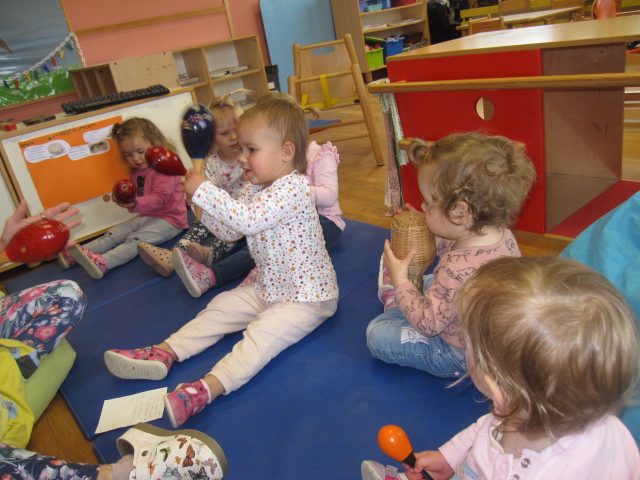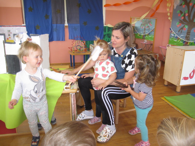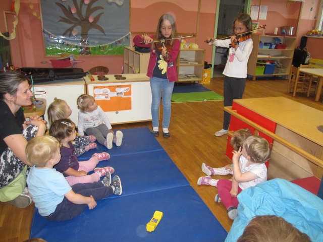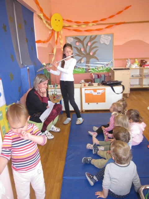 V beli igralnici smo spoznavali male instrumente, učenke iz osnovne šole pa so nam predstavile flavto in violino. Igrali smo se glasbeno-didaktične igrice, spoznali nove rajalne pesmice, ob petju pesmic smo se spremljali z malimi instrumenti ter poslušali in si ogledali glasbeno pravljico Grad gradiček. Za zaključek si je vsak izdelal svojo ropotuljico.