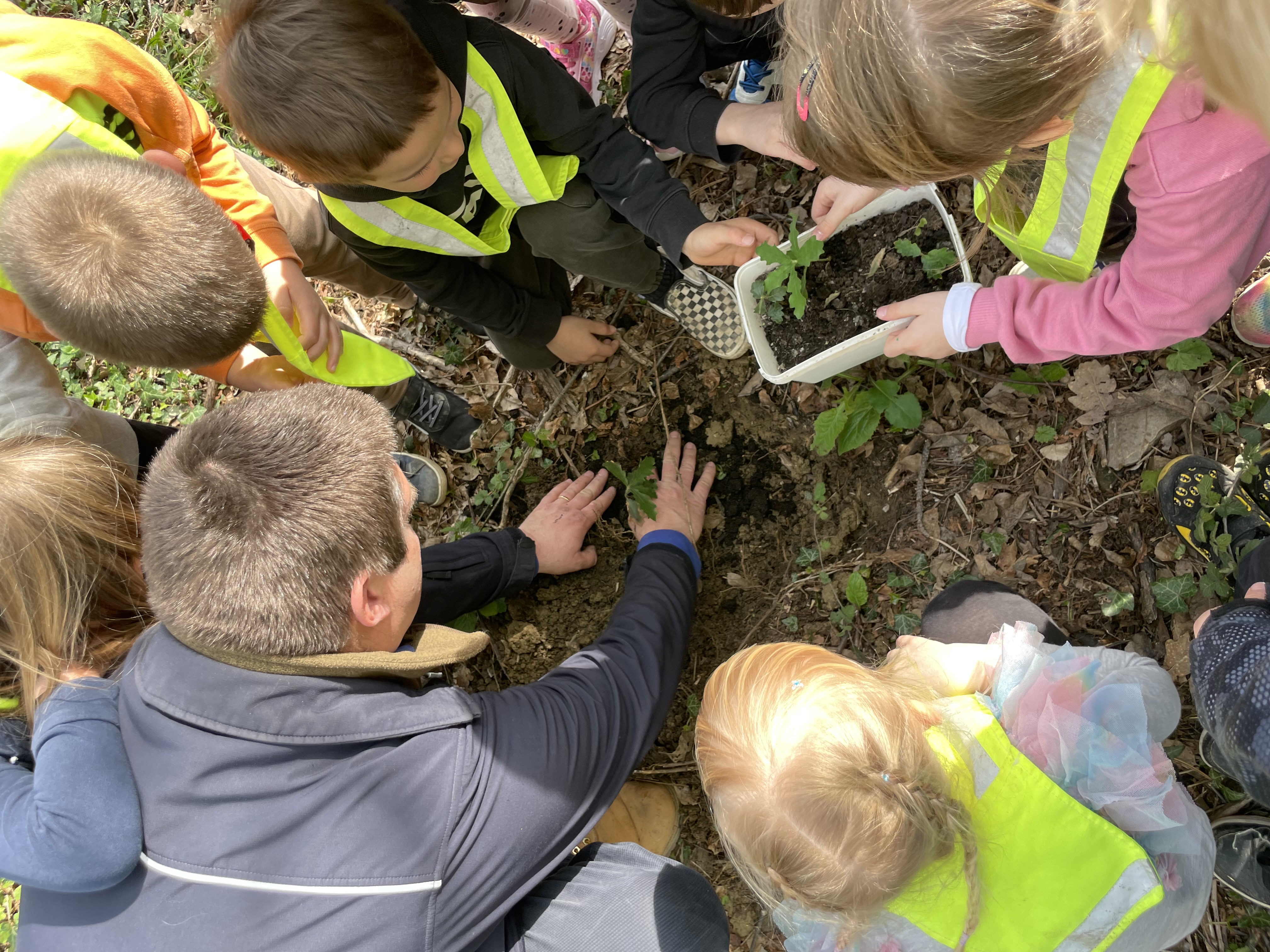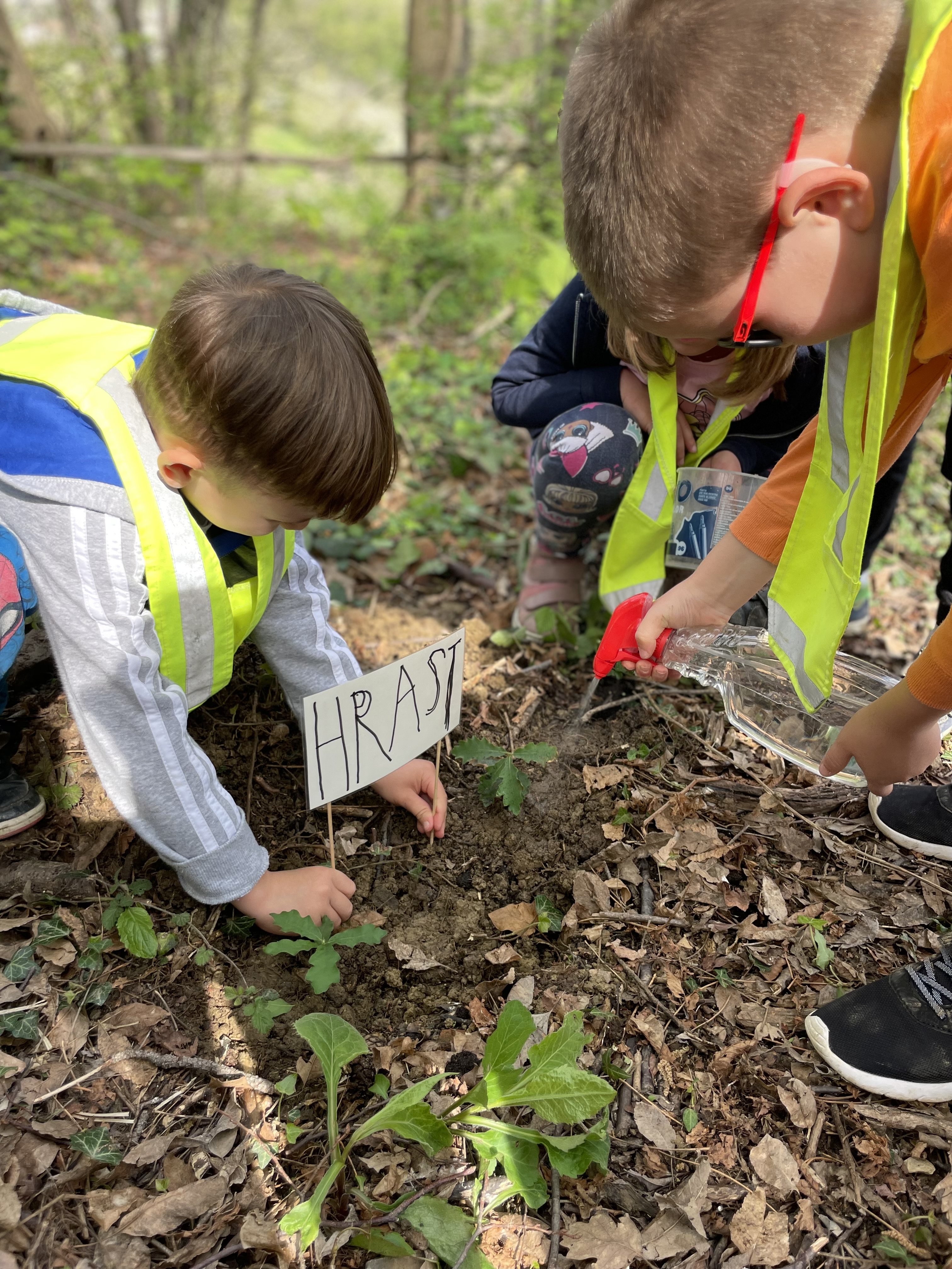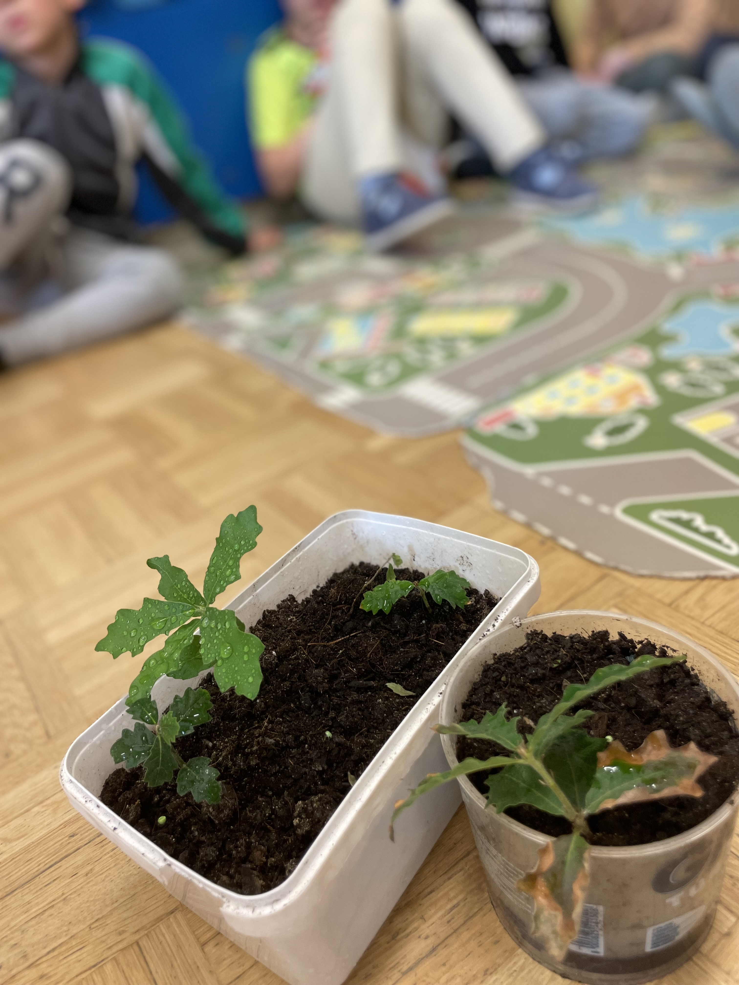 Deček je pri igri našel želod, iz katerega je bilo opaziti kalček. Odločili smo se, da ga odnesemo v vrtec, kjer smo se pogovorili kaj lahko z njim storimo. Želod smo posadili ter narisali tabelo za spremljanje njegovega razvoja. Spoznavali smo, kaj rastlina potrebuje za rast, ter mladiko pridno zalivali. Ko je ta dovolj zrasla smo se odločili, da jo posadimo v naš gozdiček. Za pomoč smo prosili gozdarja, očeta, deklice v skupini, ki nam je z veseljem priskočil na pomoč in nam veliko povedal o pomenu gozda in dreves za nas in obstoj planeta. Nima vsak otrok možnosti, da lahko posadi svoje drevo. Nam pa je bilo to omogočeno.