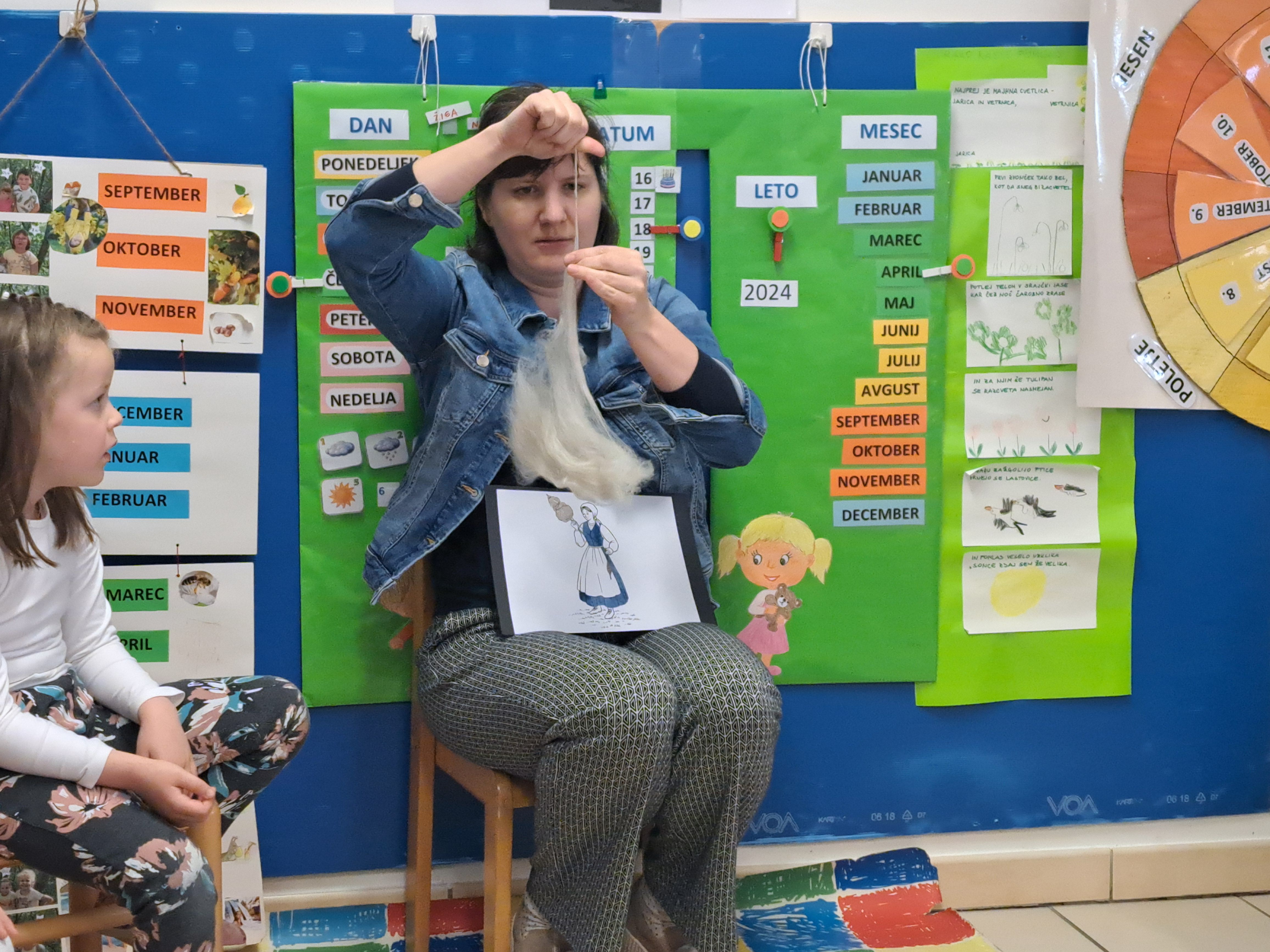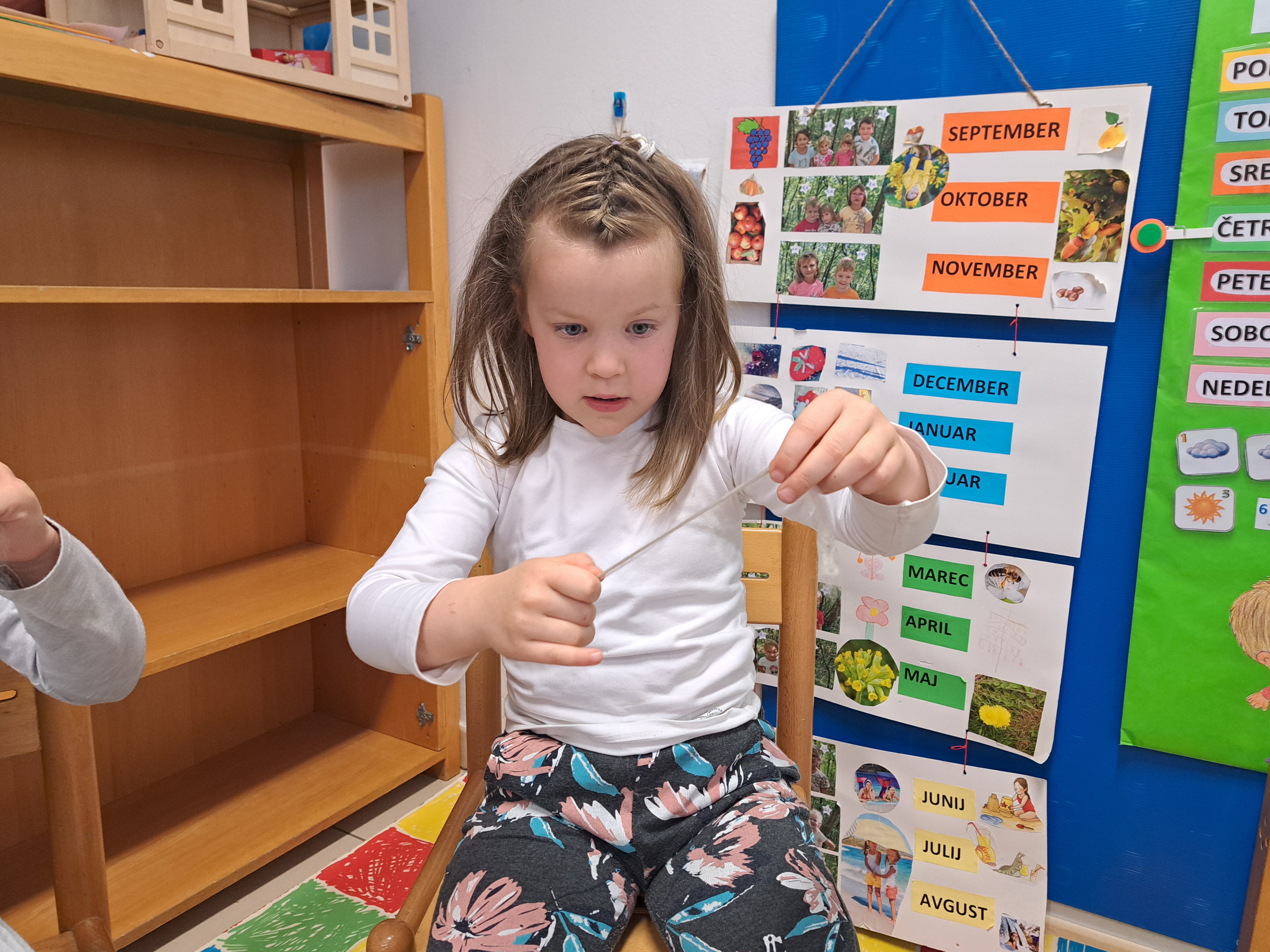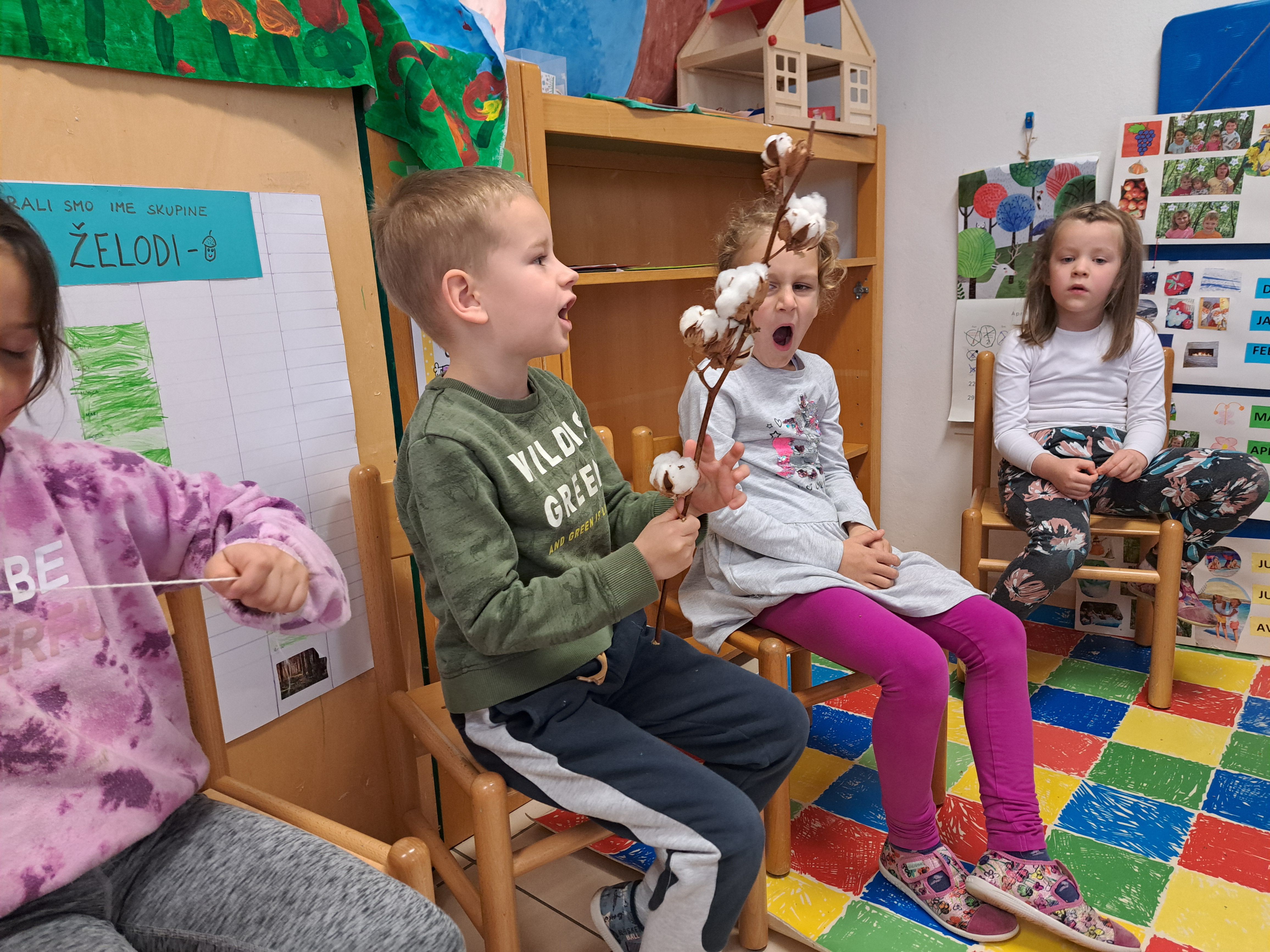 V okviru projekta Zeleni nahrbtnik smo v skupini Želodi spoznavali različne vrste materialov, med njimi tudi blago. Na obisk smo povabili Sofijino mamo Katarino, ki je znanstvenica in raziskuje, kako so se včasih oblačili in izdelovali blago. Spoznali smo, da blago lahko izdelajo iz volne, lana, bombaža, svile in celo iz plastike. Otipali in opazovali smo ostriženo, očesano in spredeno volno, otipali trdo steblo lanu, laneno nitko in laneno blago, bubo – kokon v kateri ostane gosenica in iz katerega dobimo tanko svileno nit za izdelavo svile, ter bombažno vejico s cvetovi iz katerih spredejo bombažno nit.