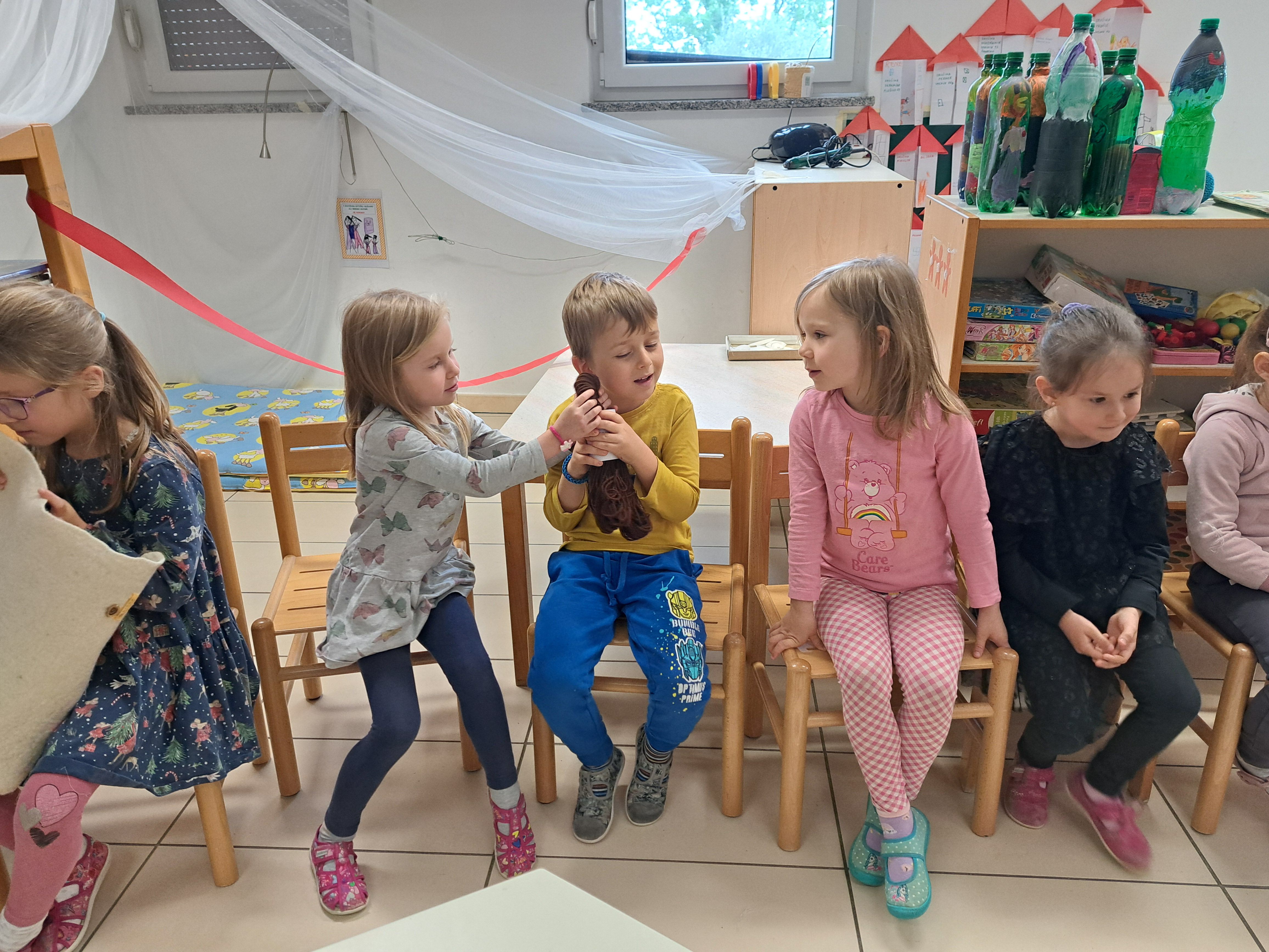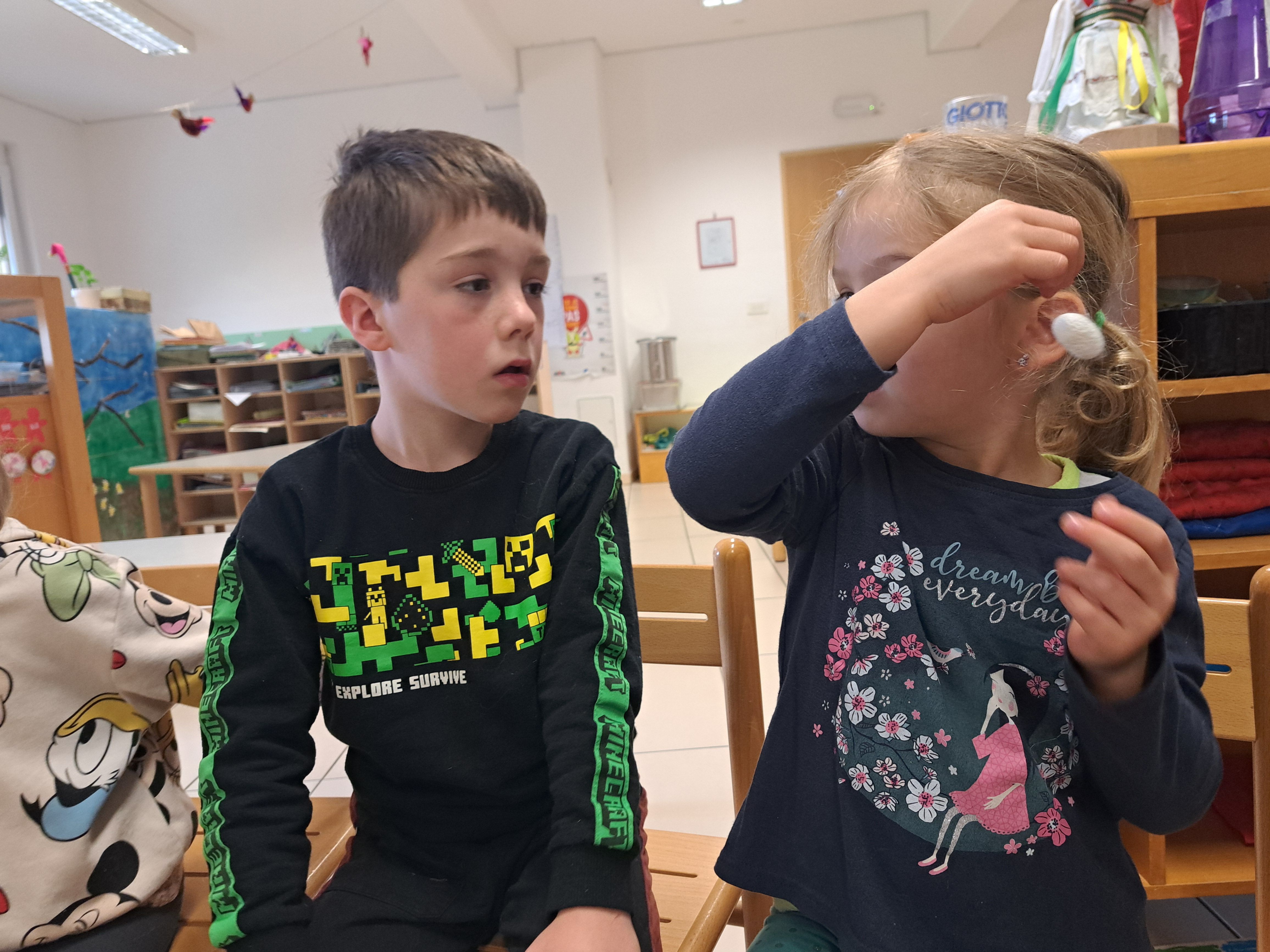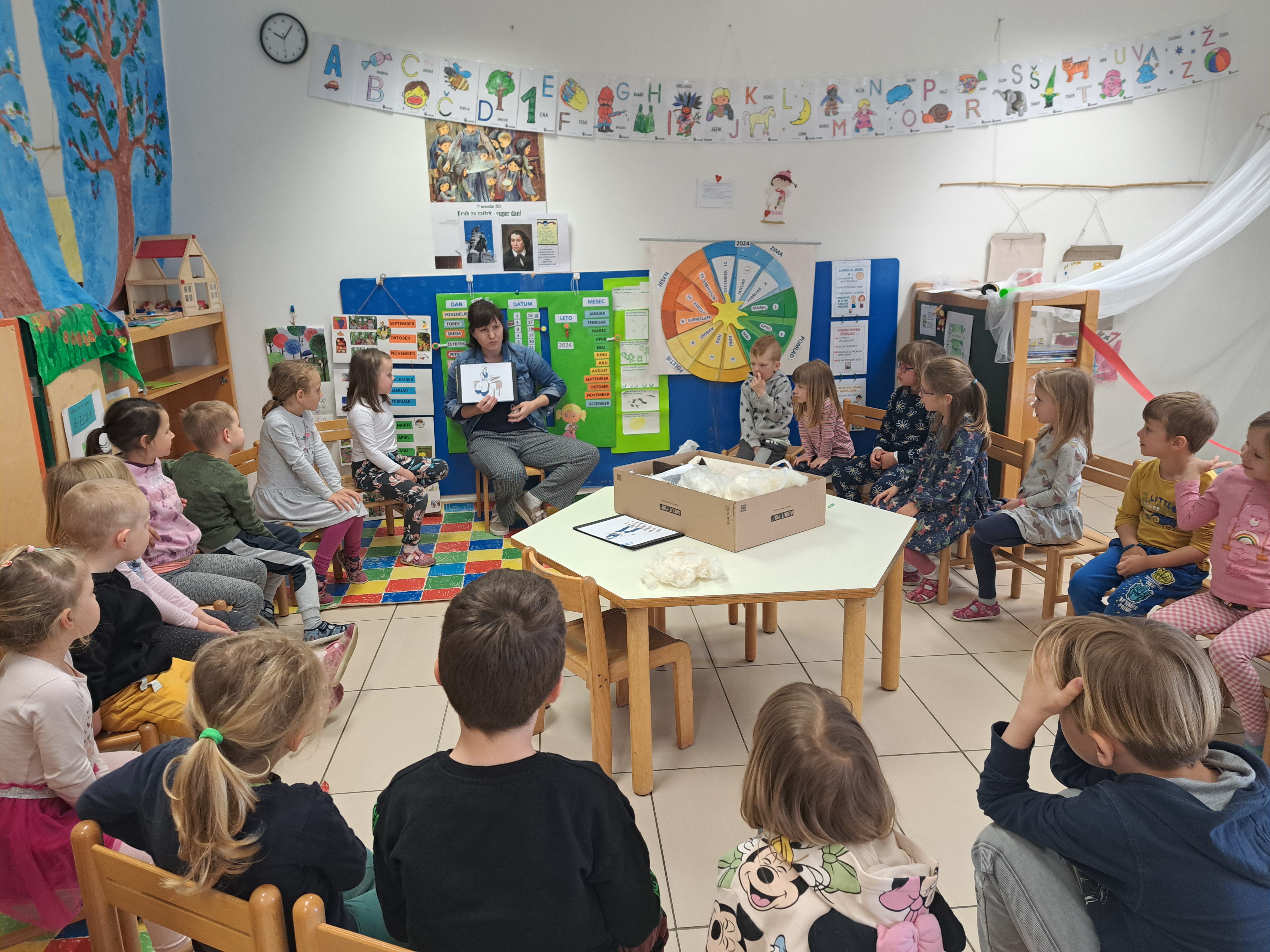 V okviru projekta Zeleni nahrbtnik smo v skupini Želodi spoznavali različne vrste materialov, med njimi tudi blago. Na obisk smo povabili Sofijino mamo Katarino, ki je znanstvenica in raziskuje, kako so se včasih oblačili in izdelovali blago. Spoznali smo, da blago lahko izdelajo iz volne, lana, bombaža, svile in celo iz plastike. Otipali in opazovali smo ostriženo, očesano in spredeno volno, otipali trdo steblo lanu, laneno nitko in laneno blago, bubo – kokon v kateri ostane gosenica in iz katerega dobimo tanko svileno nit za izdelavo svile, ter bombažno vejico s cvetovi iz katerih spredejo bombažno nit.