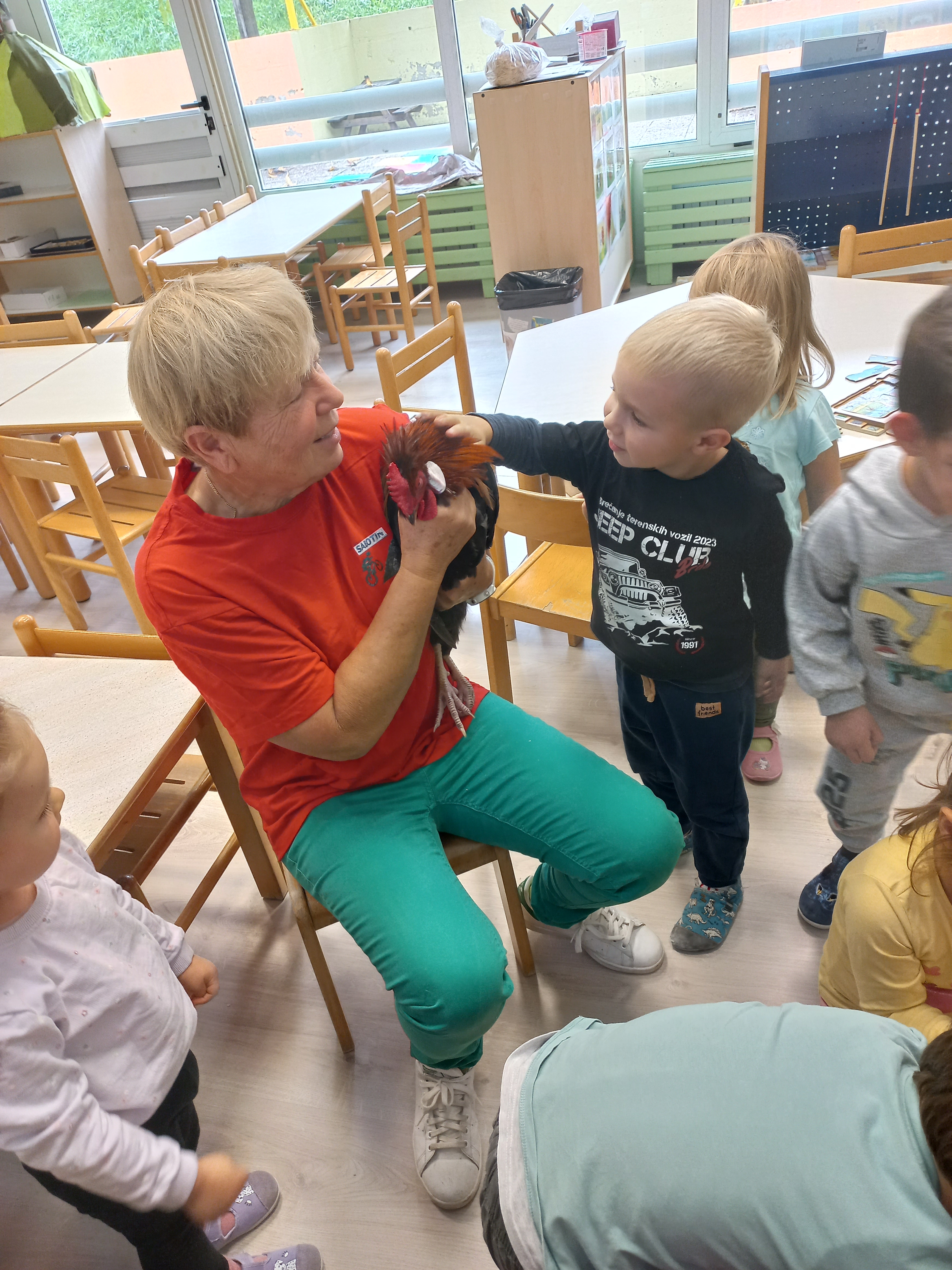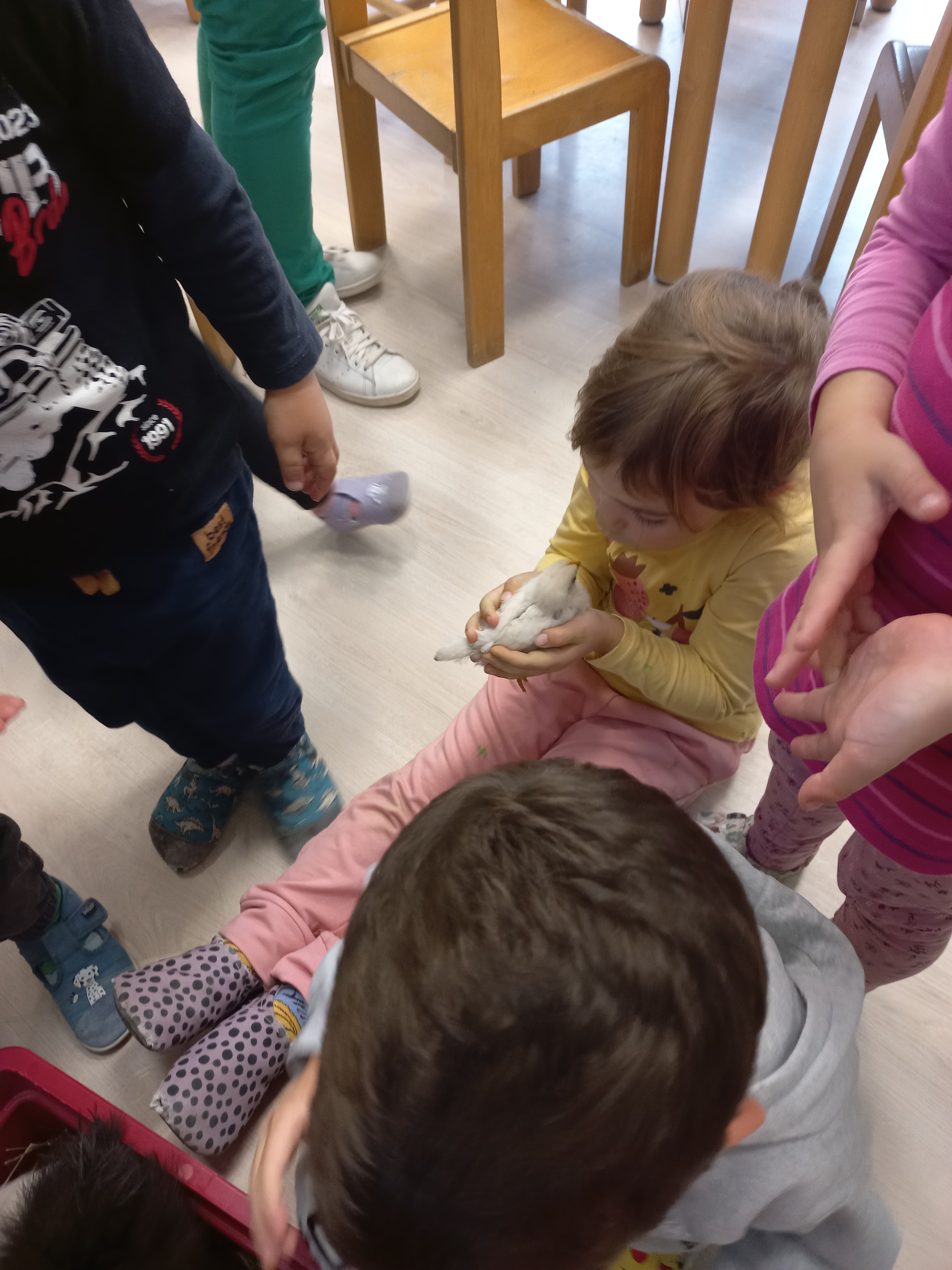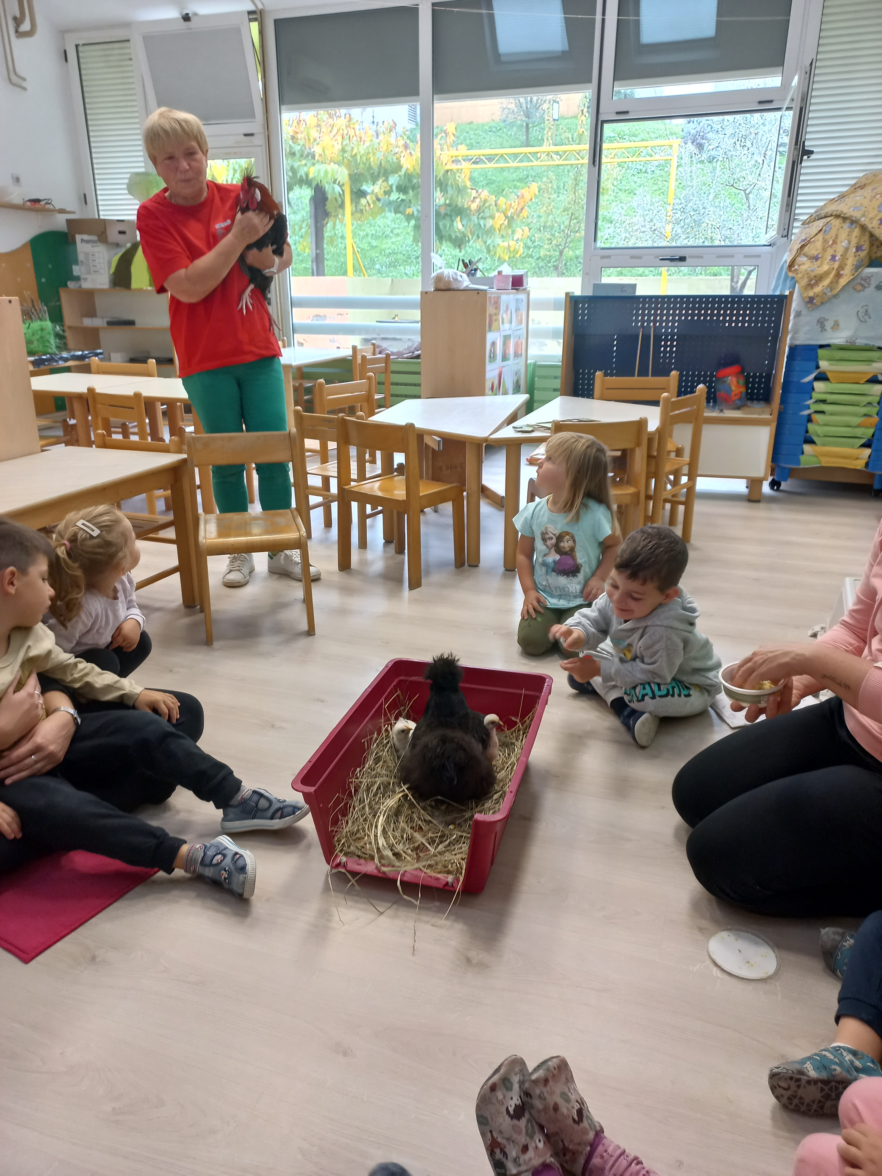 V vrtcu nas je obiskala kokošja družina iz Plešivega. Gospodarica Tanja nam je v zanimivi zgodbi predstavila kokoš Filomeno, petelina Feniksa in njune mehke, puhaste piščančke ter nam dovolila, da smo jih božali in hranili.
