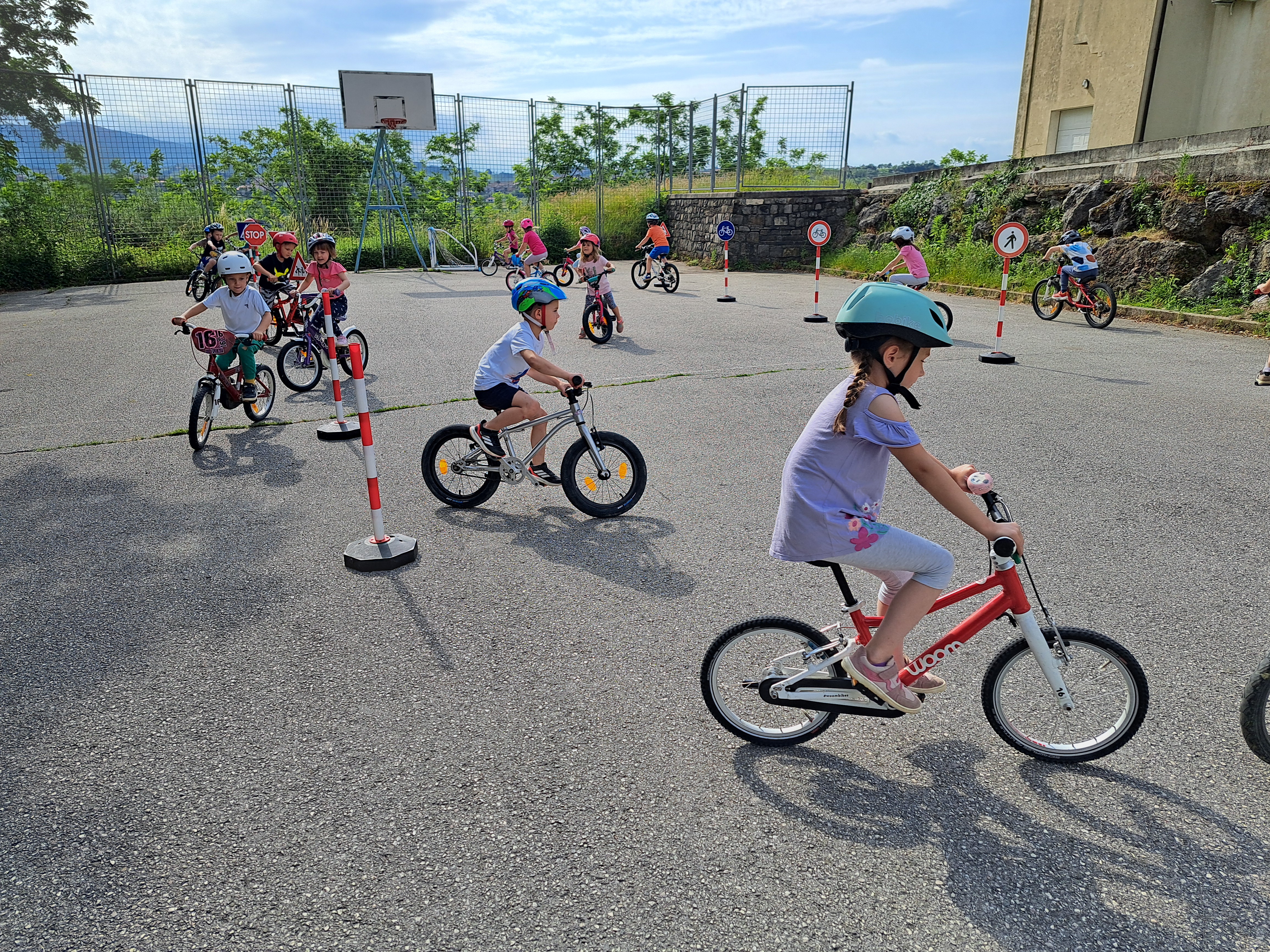 V okviru projekta »Mali sonček« otroci pridobivajo znanja iz različnih gibalnih spretnosti. Vzgojiteljice skozi celo leto pripravljamo specifične gibalne dejavnosti.Tokrat smo se v starejših slupinah lotili kolesarjenja.Otroci so v vrtec pripeljali svoja kolesa in seveda tudi čelade. Najprej smo si pogledali kaj spada pod obvezno opremo kolesa: brezhibna prednja in zadnja zavora, luč spredaj in zadaj, zvonec, odsevniki na pedalih, ustrezno napolnjene pnevmatike ter primerno nastavljena višina krmila in sedeža. Na igrišču sta nas pričakala policista, ki sta za nas pripravila poligon s prometnimi znaki. Najprej smo si prometne znake ogledali in razložili njihov pomen nato pa smo se usedli na kolo. Vijugali smo med stožci, se varno zaustavljali in bili pozorni na druge kolesarje. Za konec smo svoja kolesa še narislai.