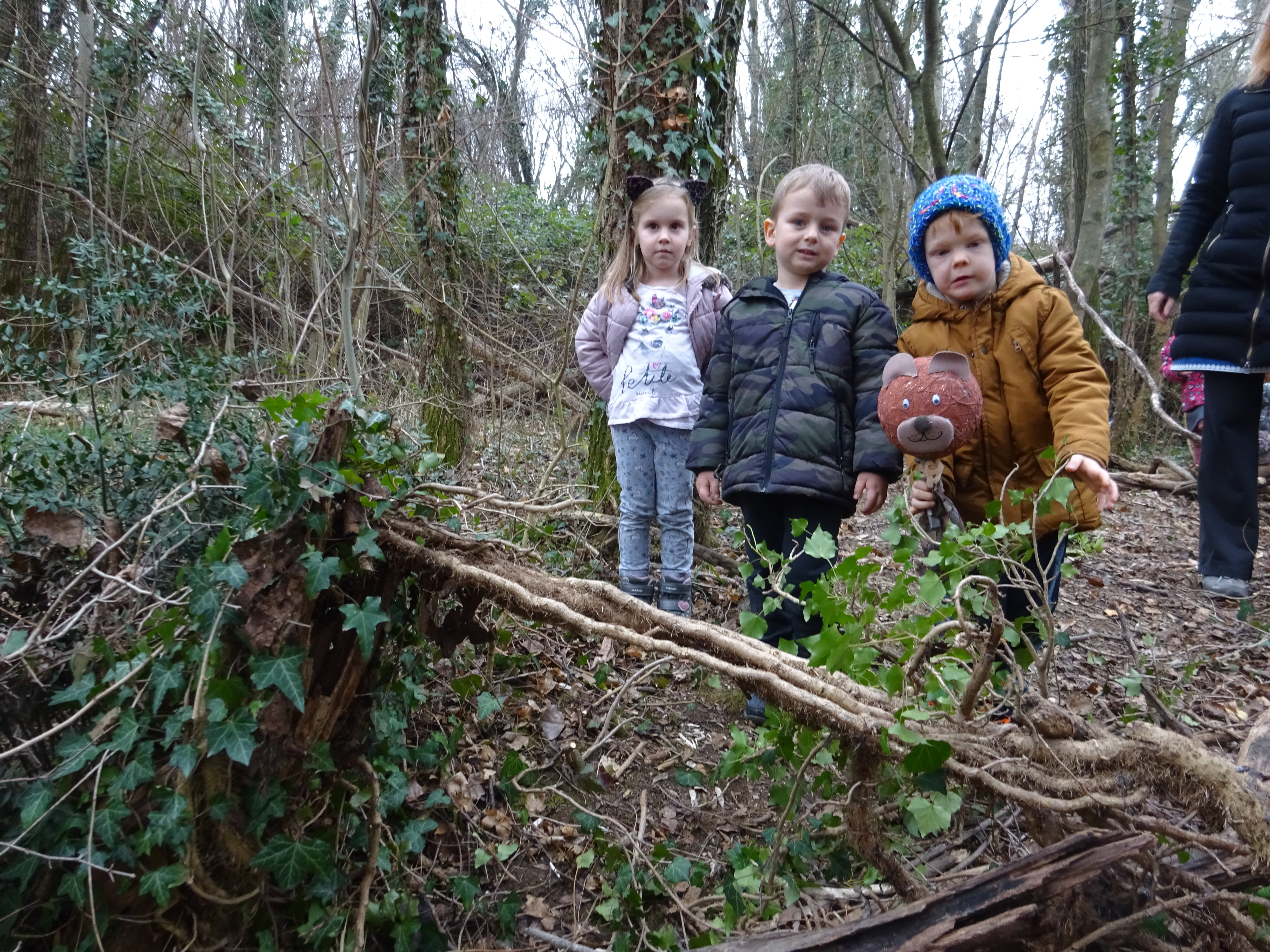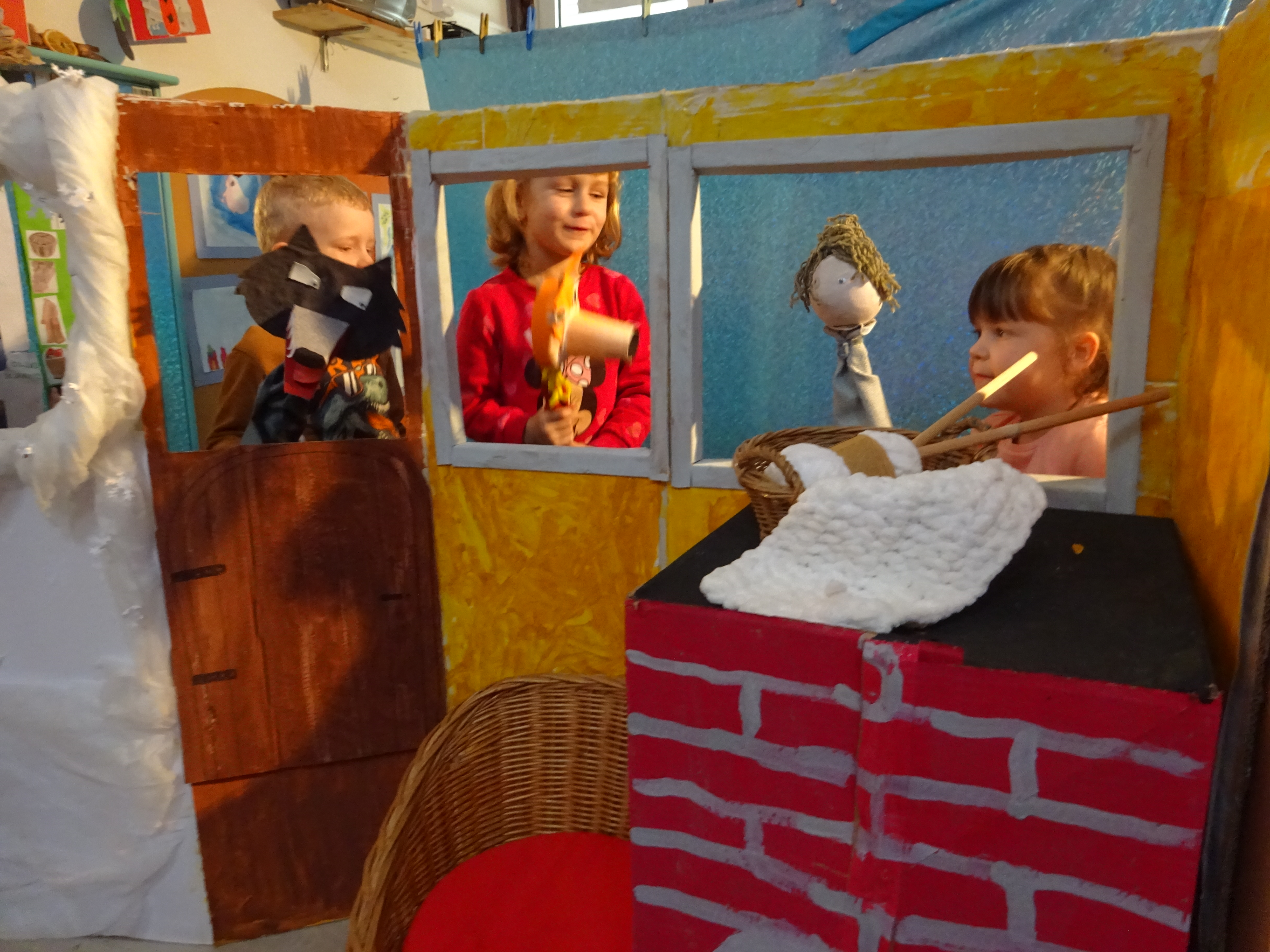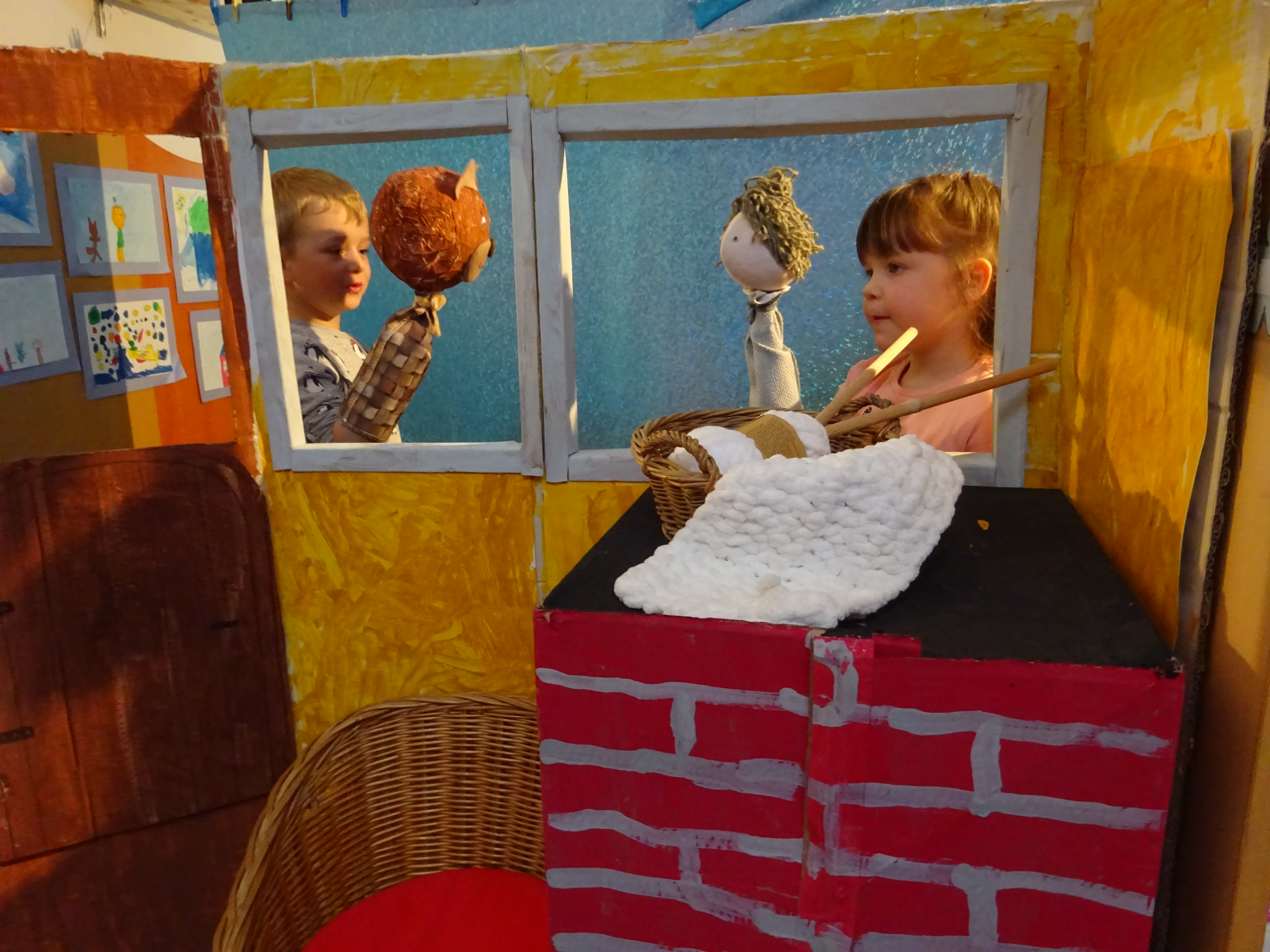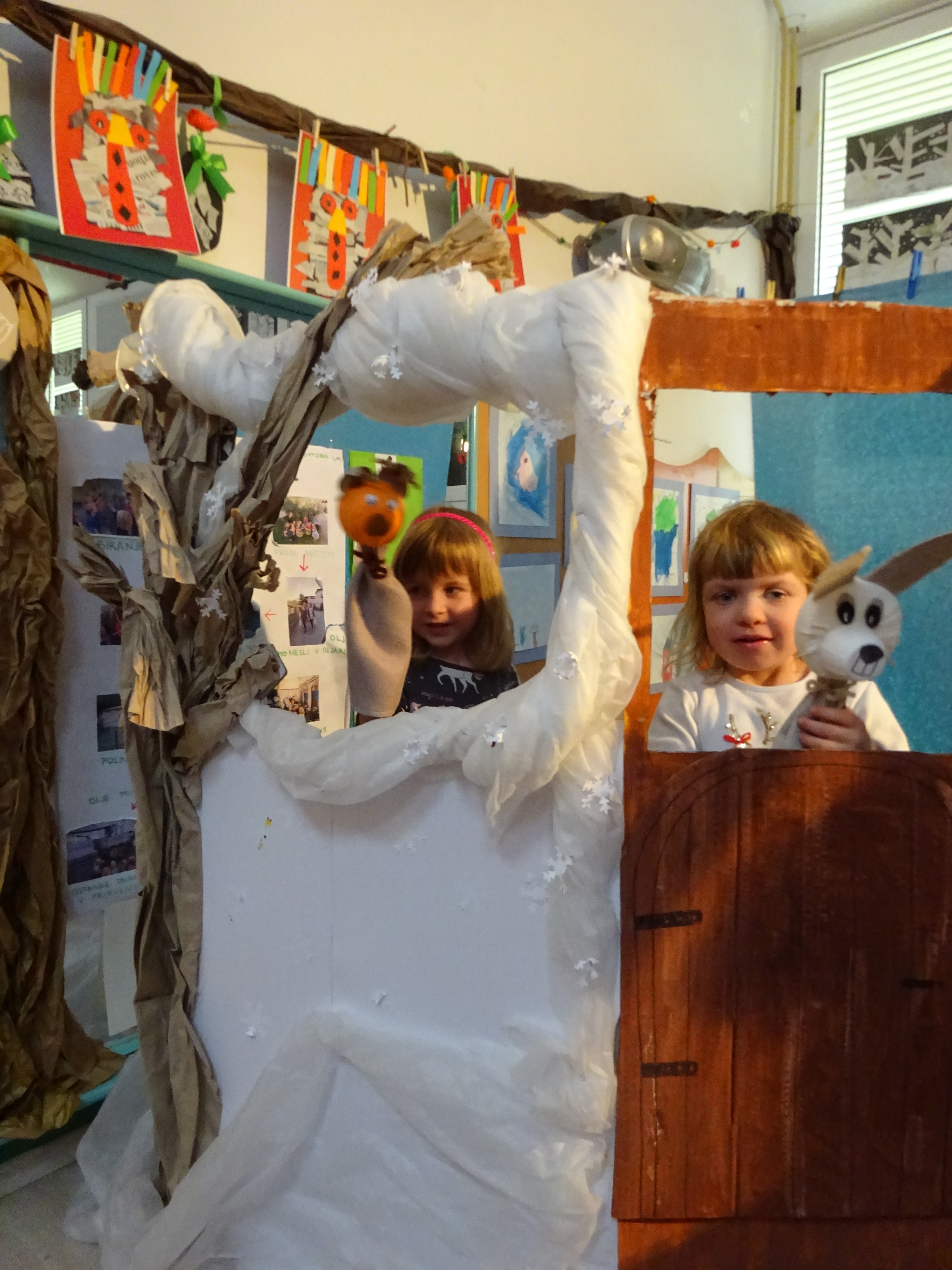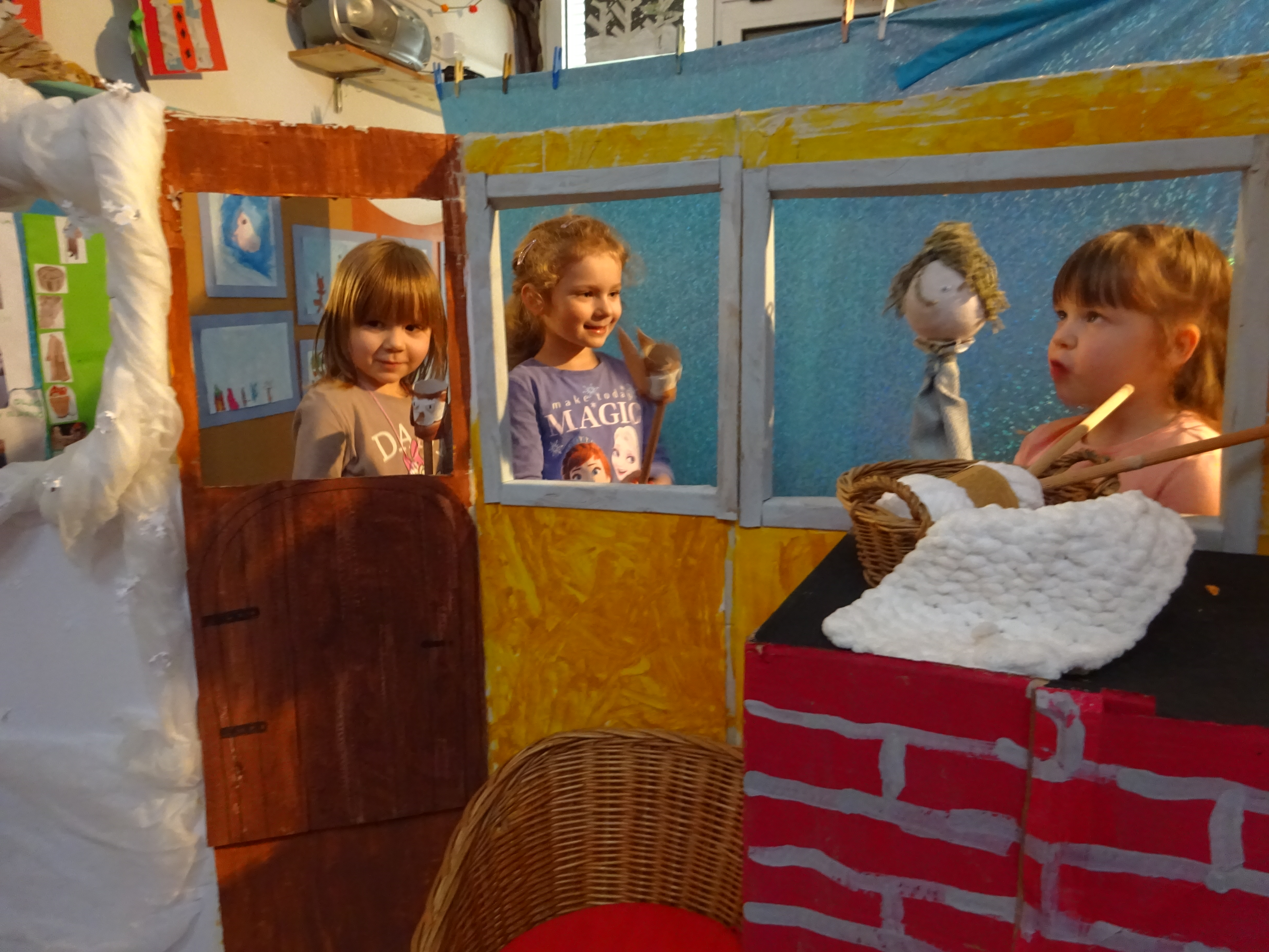 Otroci Modre igralnice, enote vrtca Dobrovo, so se z velikim zanimanjem podali v spoznavanje izvedbe lutkovne predstave s pripravo vseh potrebnih elementov: poznavanje zgodbe, izdelavo lutk, odra za predstavo, izbiro pesmi, igranje na ritmične instrumente, pripravo vabila in vstopnic. Predstavo so večkrat odigrali v prostorih vrtca, skozi igro pa so jo prenesli tudi v naravno gozdno okolje. Iz naravnih materialov, ki so jih imeli na razpolago (veje, listje, bršljan,..), so izdelali babici Zimi hiško in domovanje za živali. Z ročno izdelanimi lutkami pa so skozi igro večkrat podoživljali zgodbo. Prišla je do izraza njihova domišljija, kreativnost in sodelovanje. Lutkovno predstavo so predstavili vsem otrokom v enoti vrtca Dobrovo.