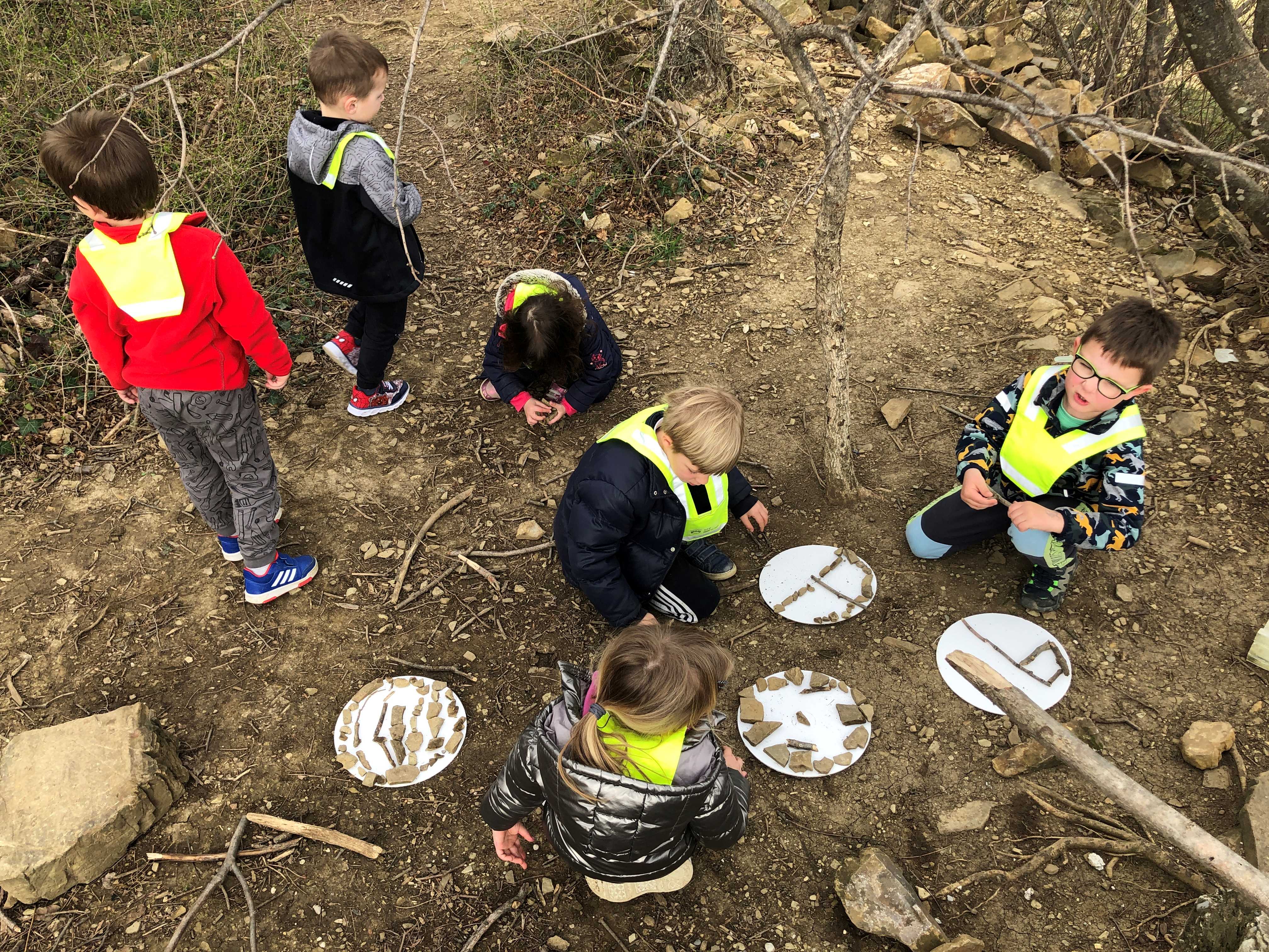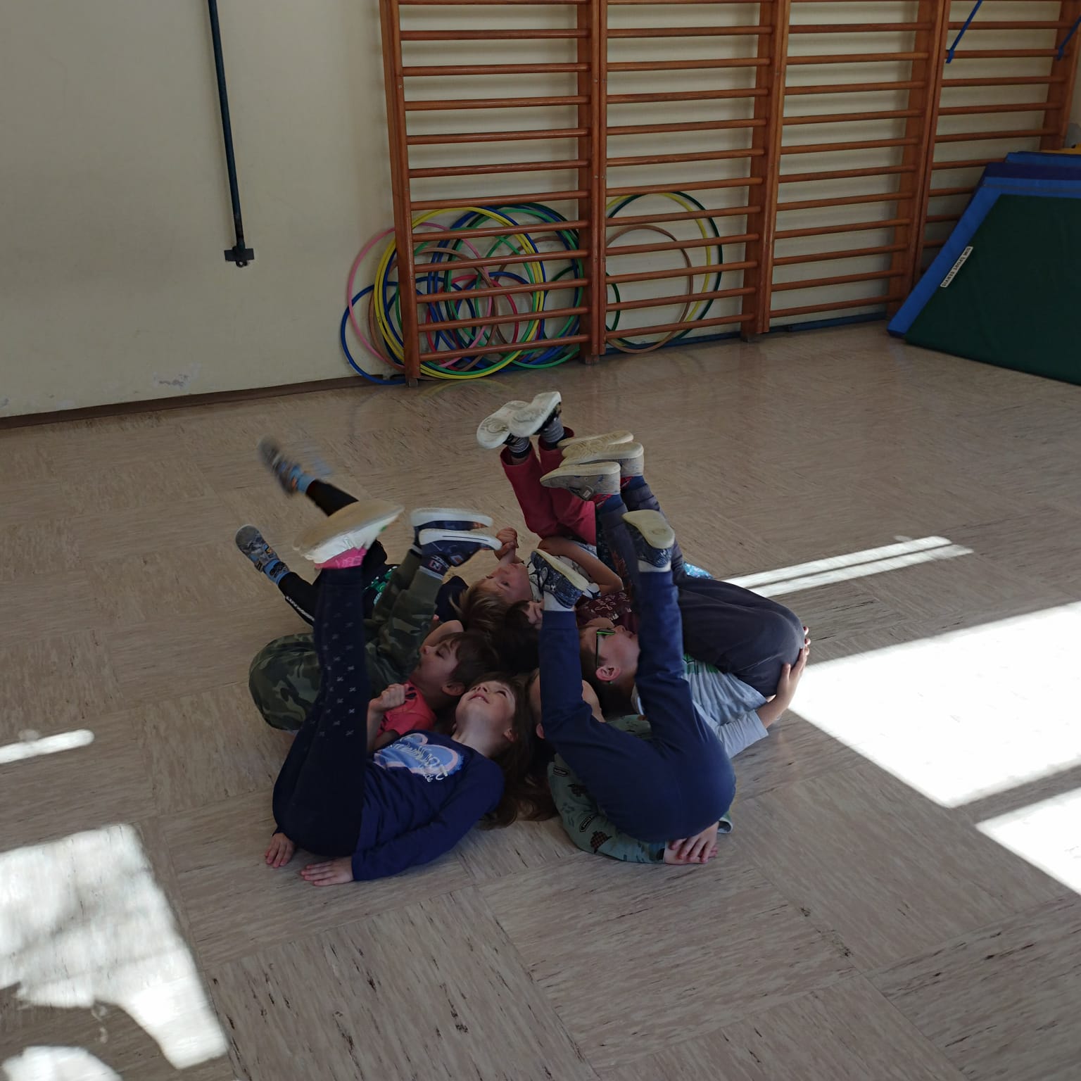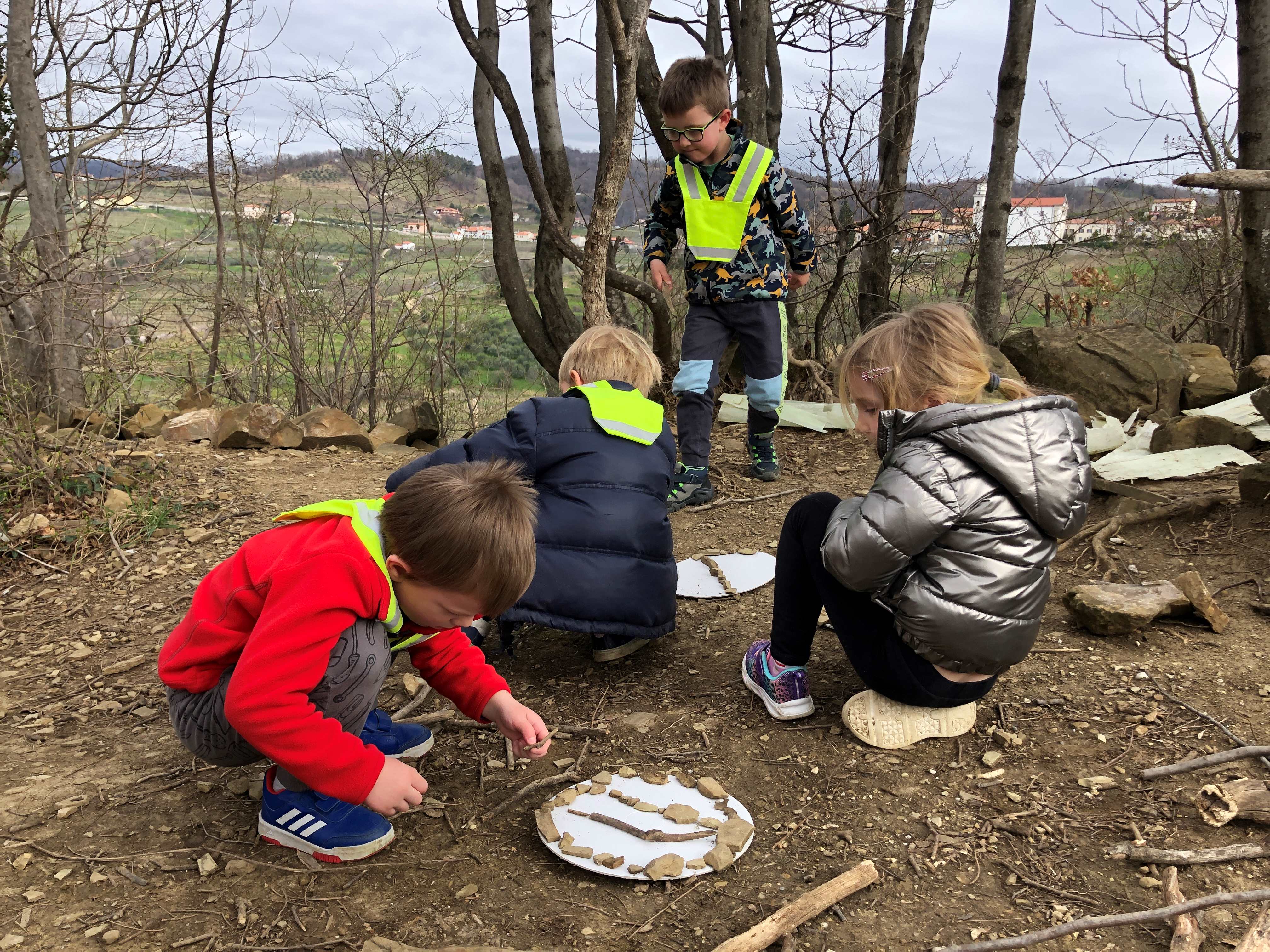 Pri Gozdnih škratih smo se ukvarjali z mandalo. Iskali smo jih v naravi: pajčevine, polži, cvetlice, ptičje gnezdo. V igralnici smo jih barvali, risali, ustvarjali z volno, v telovadnici pa smo jih z našimi telesi sami naredili.