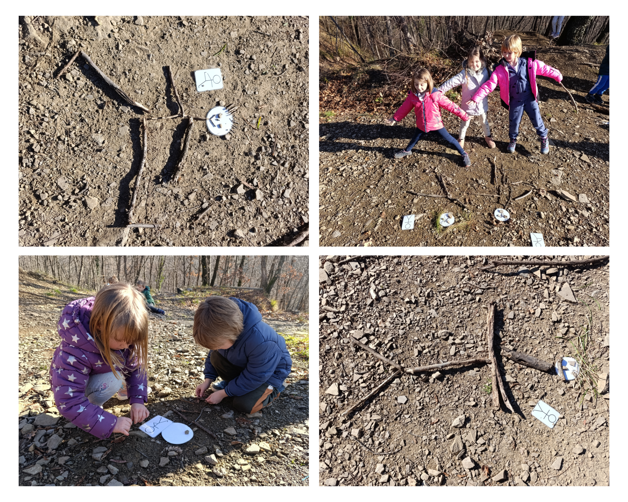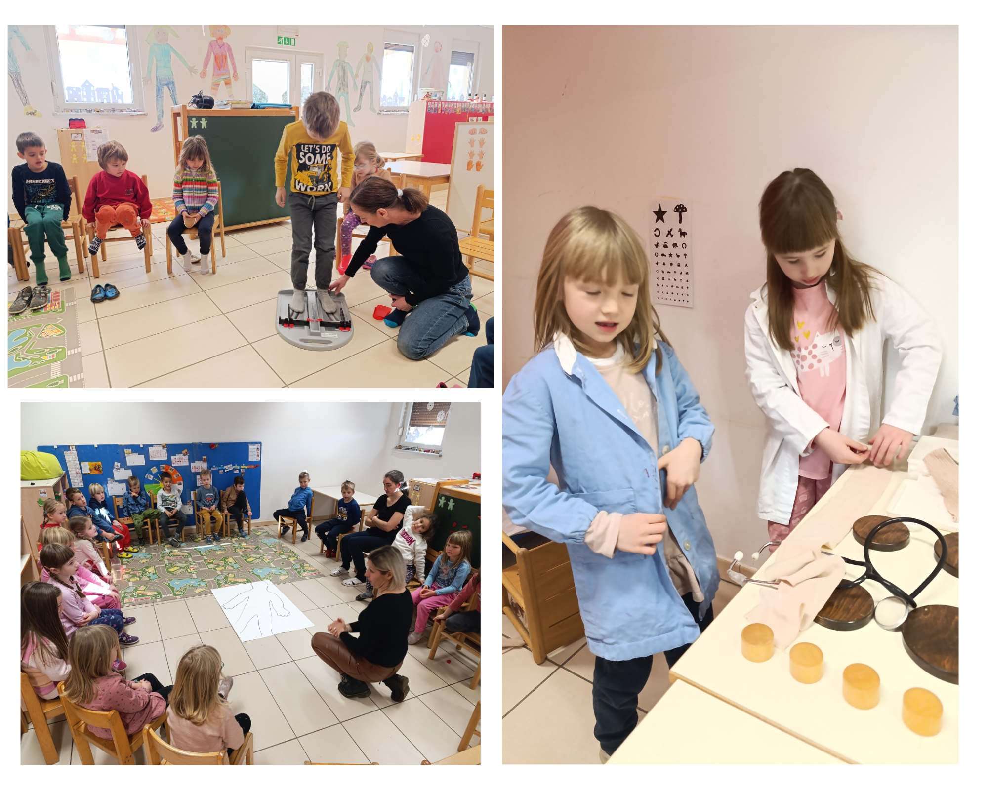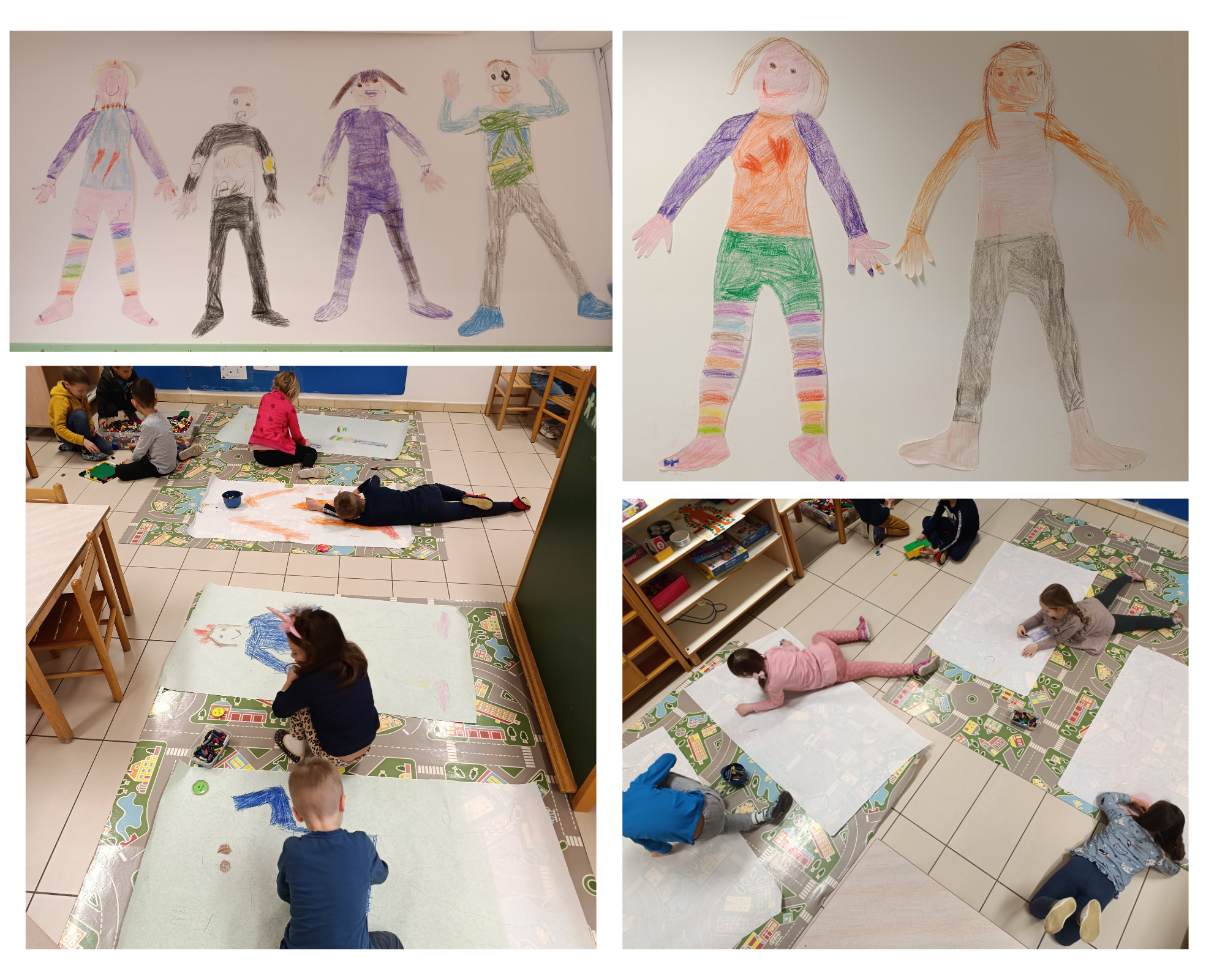 Na velik list papirja smo obrisali svoje telo in ga pobarvali. Izmerili smo našo višino in tako ugotovili kdo je v naši igralnici najvišji in kdo najnižji. Obiskala nas je ga. Suzana, mama naše Eli, ki je prodajalka v trgovini čevljev in nam pokazala kako izmerimo velikost stopala in tako izberemo ustrezno velikost čevlja. Tako smo ugotovili kdo ima v naši skupini največje in kdo najmanjše stopalo in kdo bo kmalu potreboval nove copate. V ogledalu smo opazovali svoje oči ter obraz ter izdelali lepljenko. Zelo radi pa se igramo tudi v naši ambulanti, kjer s povoji povijamo poškodovane noge in zdravimo najrazličnejše bolezni. V Biljani zelo veliko časa preživimo v gozdičku, kjer najlažje spoznamo kaj vse naše telo zmore. V gozdičku smo iz različnih palic izdelali figure v različnih položajih, ki smo jih prikazali tudi s svojimi telesi. Obraze pa so dobila tudi drevesa v našem gozdičku.