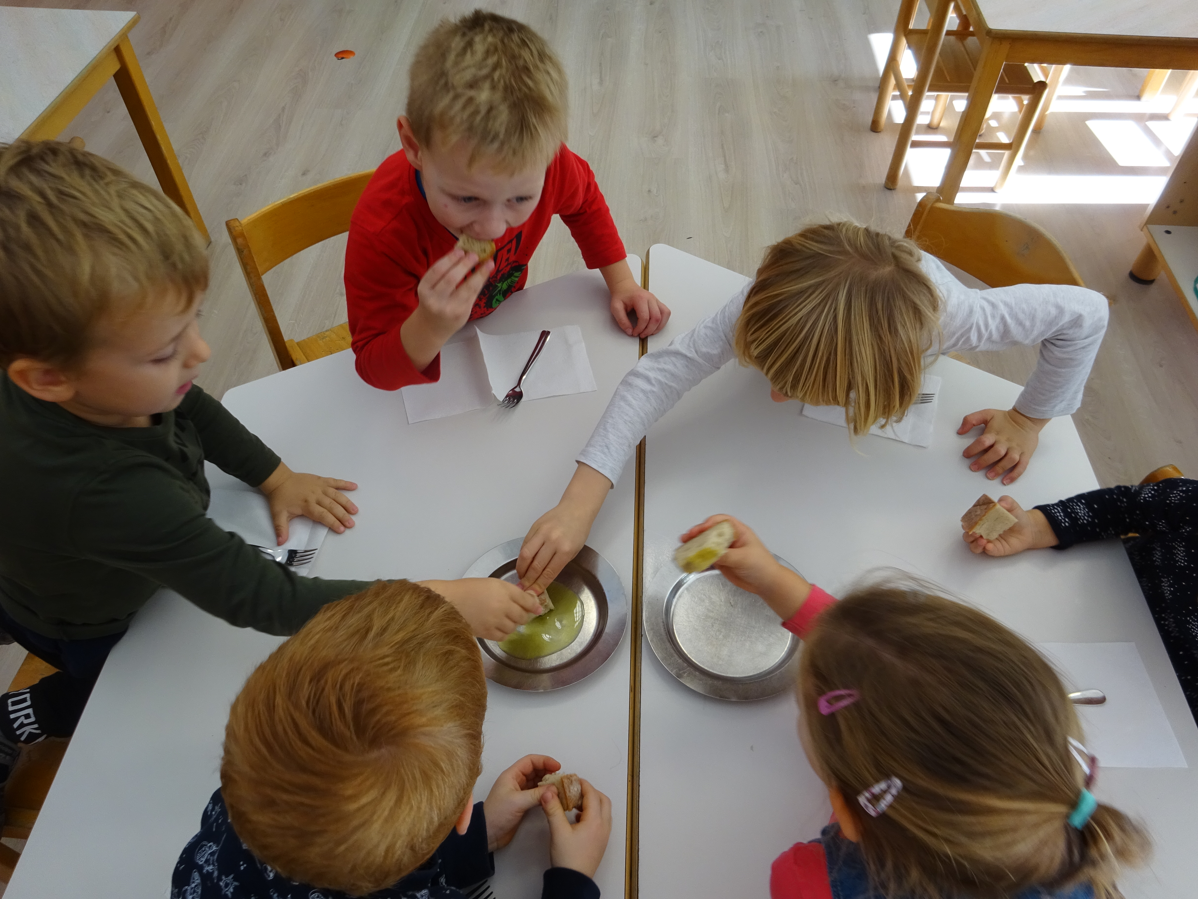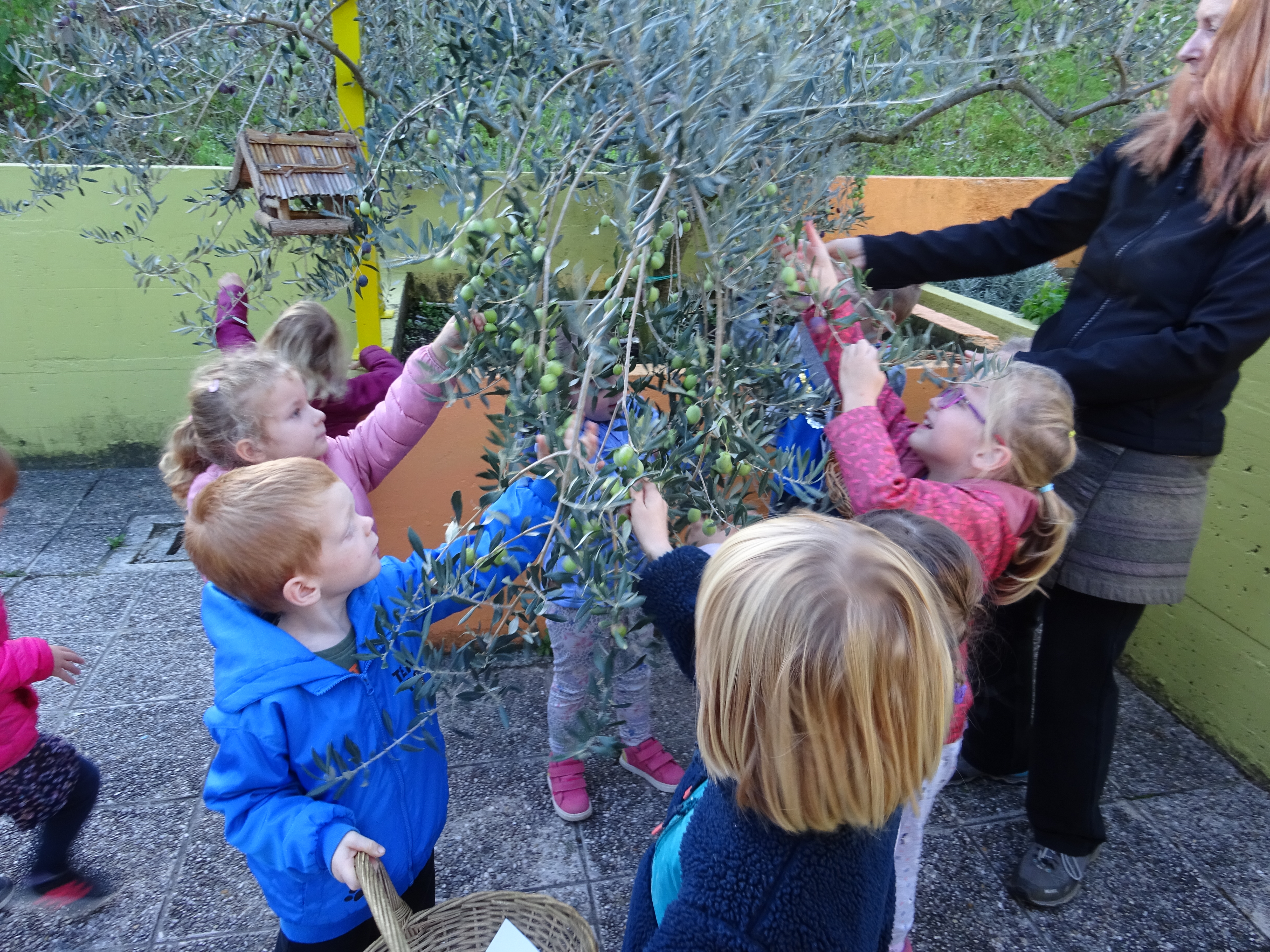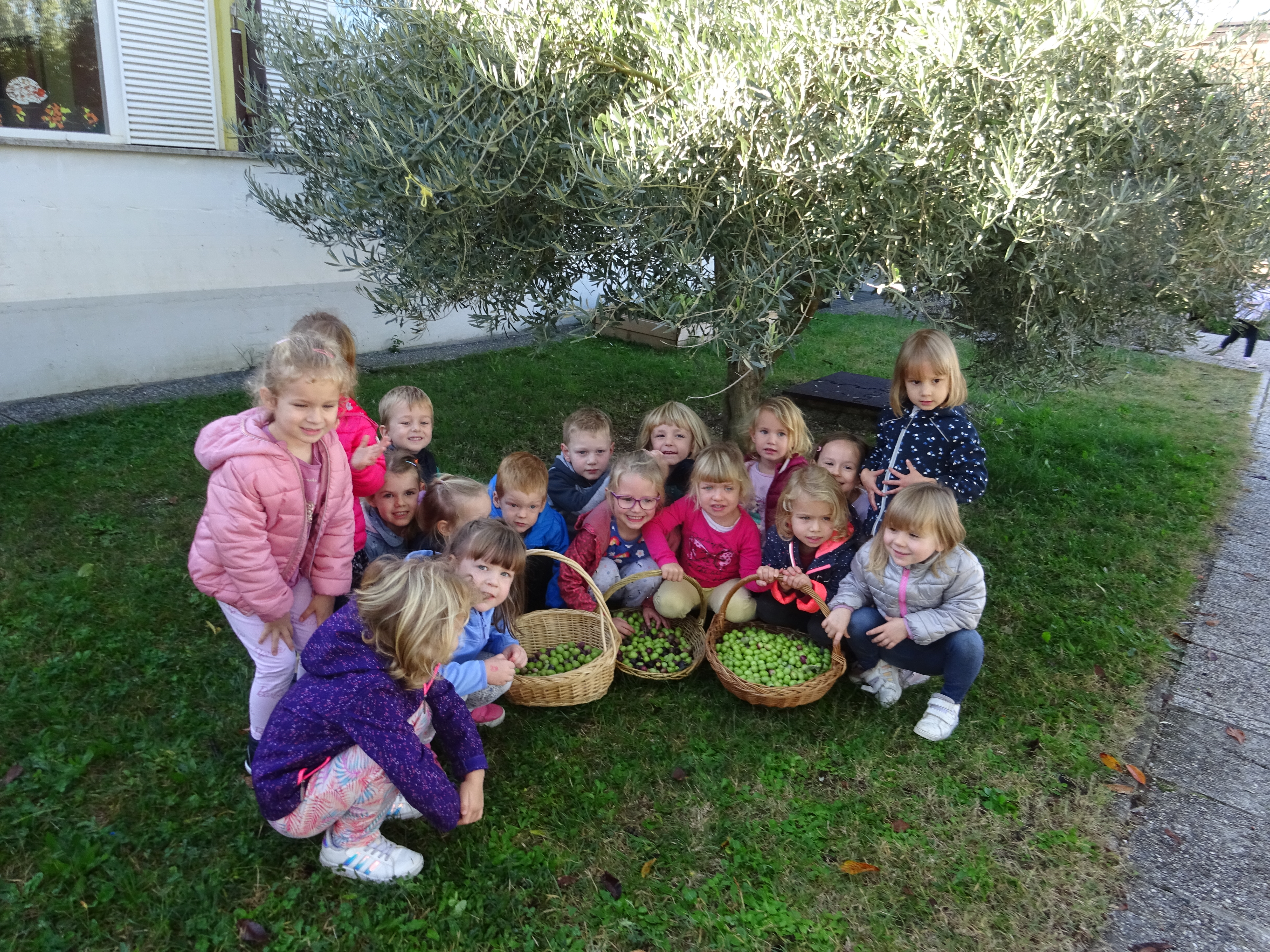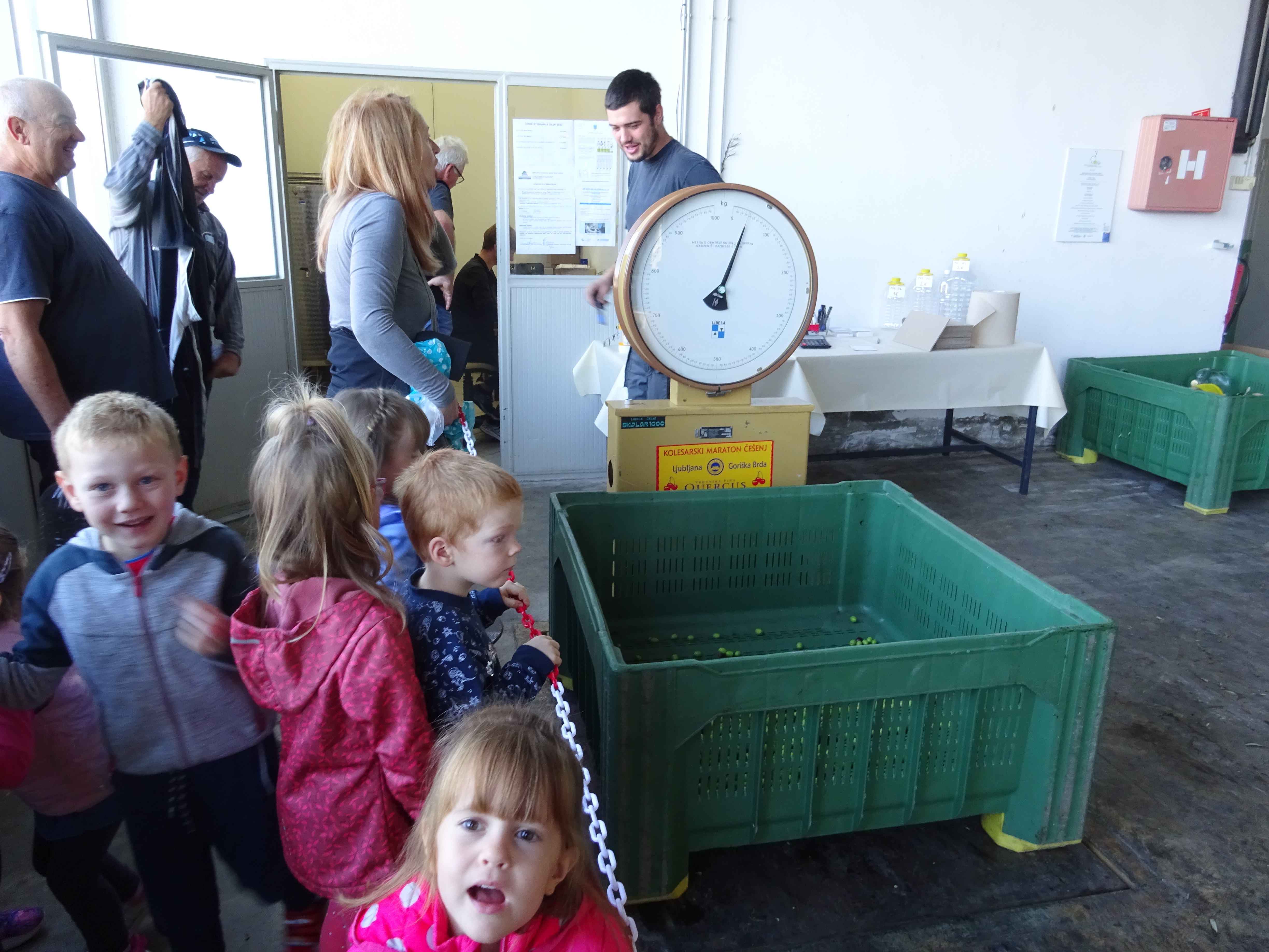 V zadnjih dneh oktobra smo otroci Modre igralnice obirali oljke v okolici vrtca. Odnesli smo jih v klet, kjer so jih na veliki talni tehtnici stehtali, nato pa smo si ogledali linijo za stiskanje olivnega olja. Polne zaboje oljk so stresli v zbiralnik, sledilo je pranje, sekljanje in stiskanje oljčne kaše v torklji. Z oljem, ki je priteklo ven, smo napolnili steklenice. Ko smo prišli v vrtec, smo oljčno olje z navdušenjem okušali. Bilo je odlično.