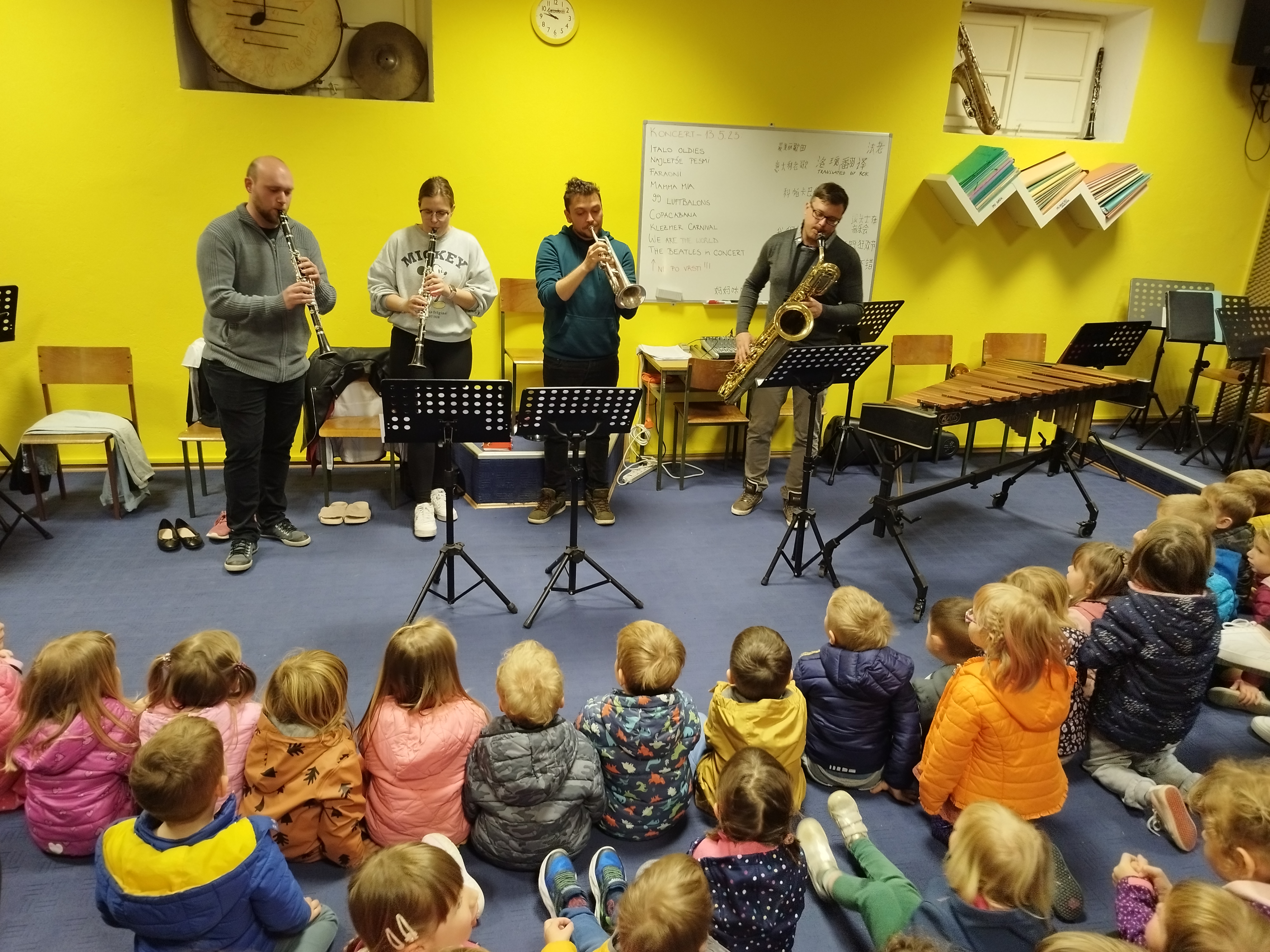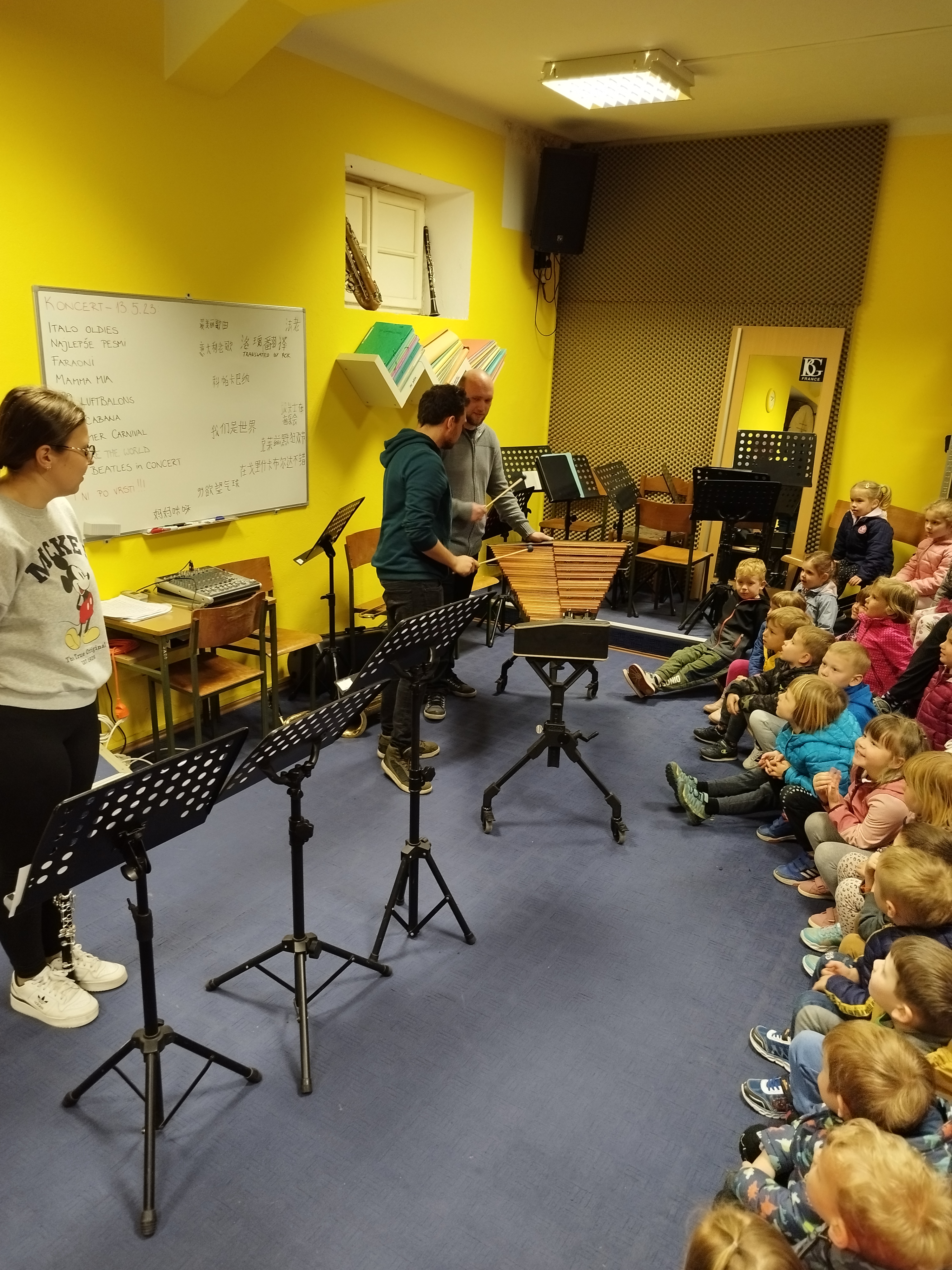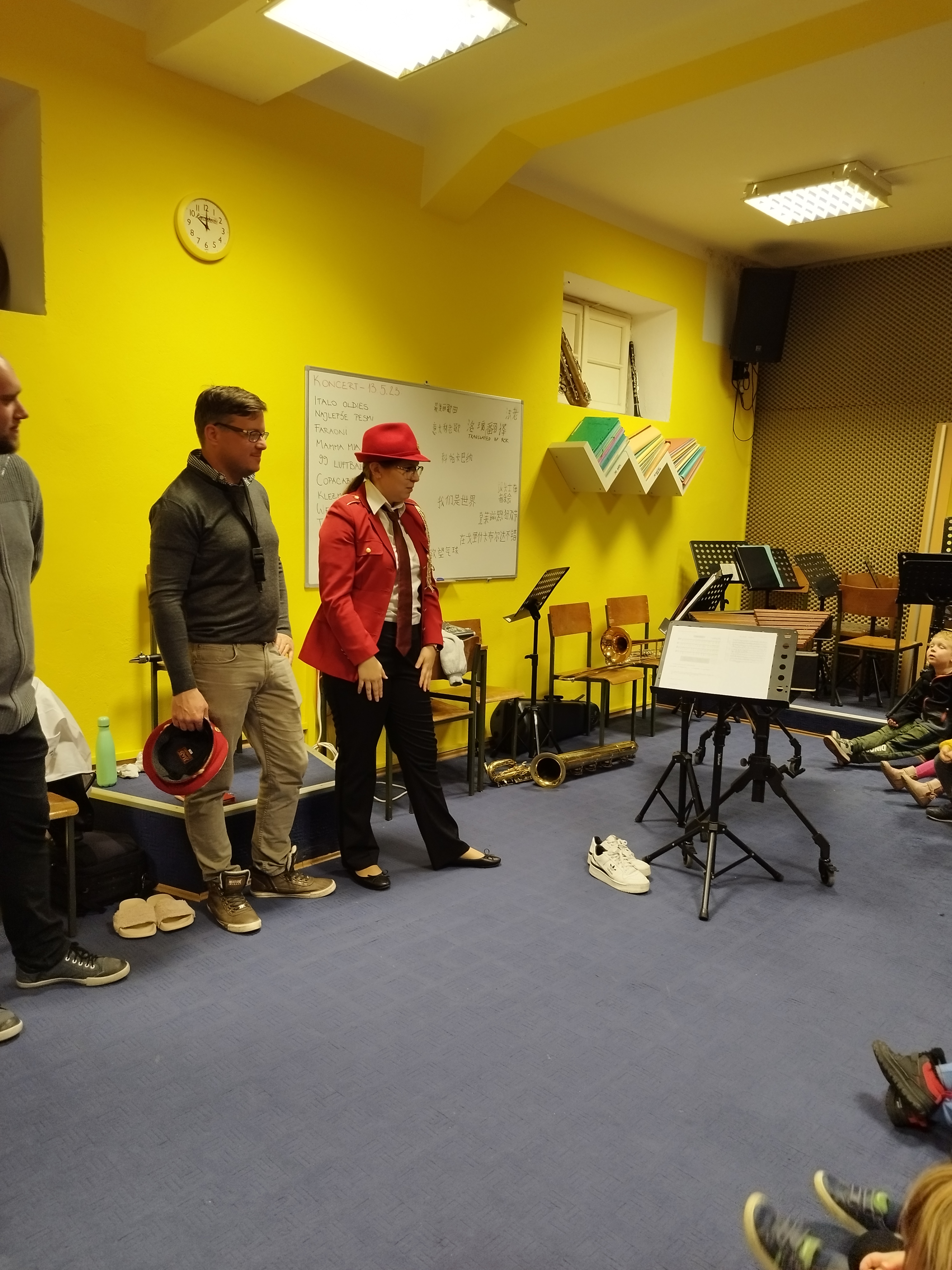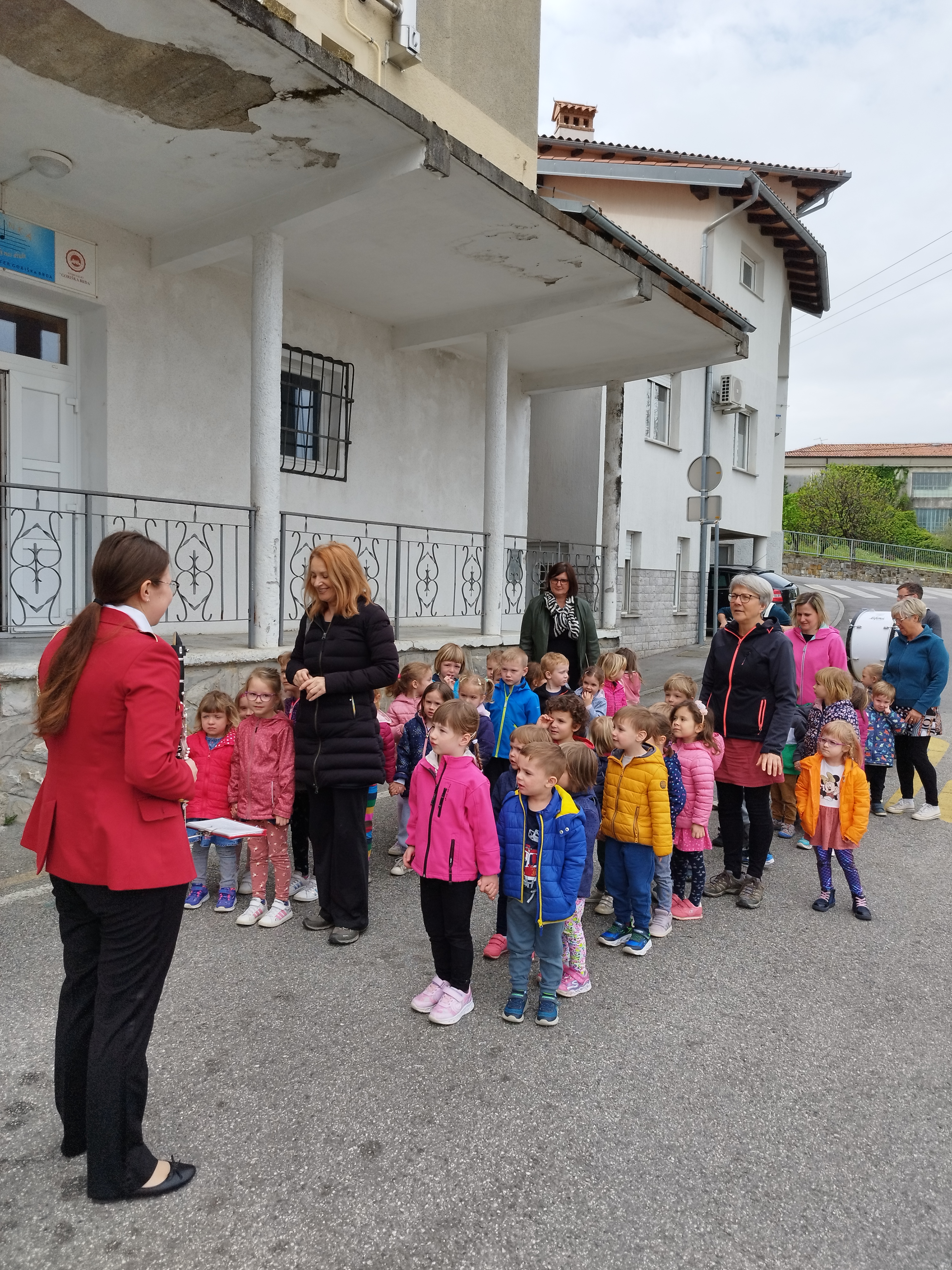 Sredinske skupine smo obiskale prostore Pihalnega orkestra Dobrovo. Prijazni godbeniki so nam predstavili in zaigrali na različne instrumente iz skupin pihal, trobil in tolkal. Preko igre smo spoznali tudi njihovo koncertno uniformo. Zaključili pa smo s skupnim korakanjem ob spremljavi.