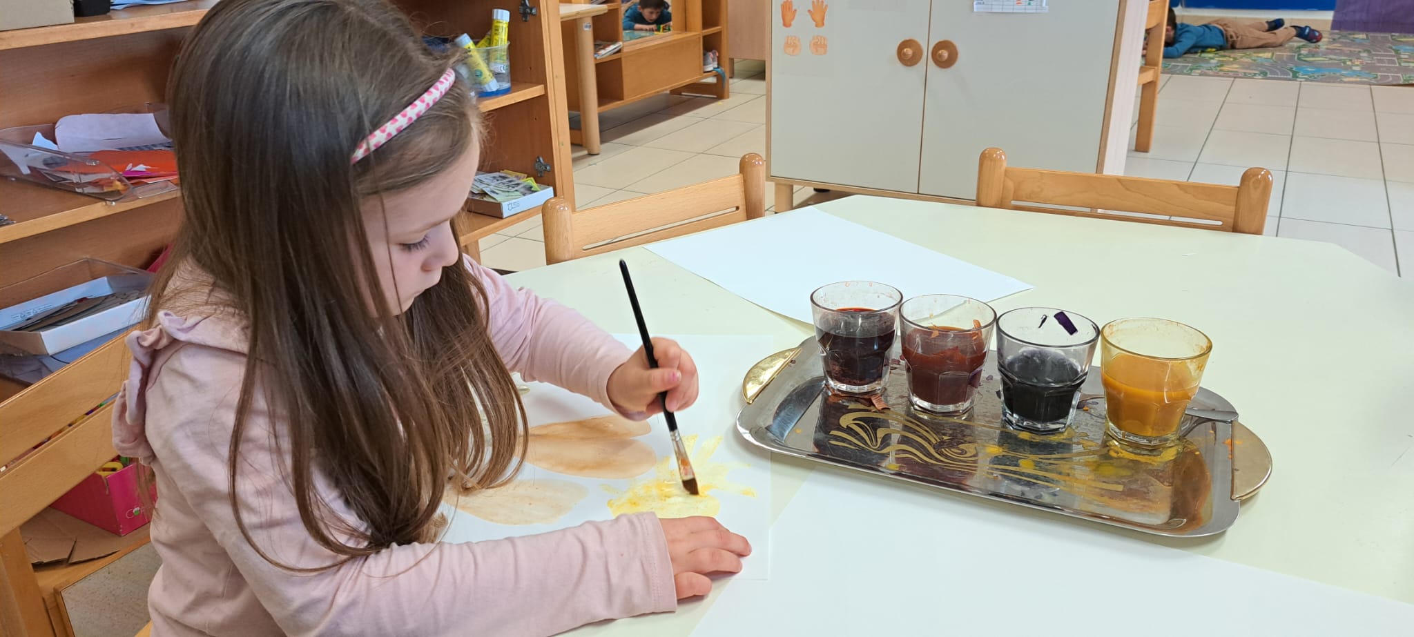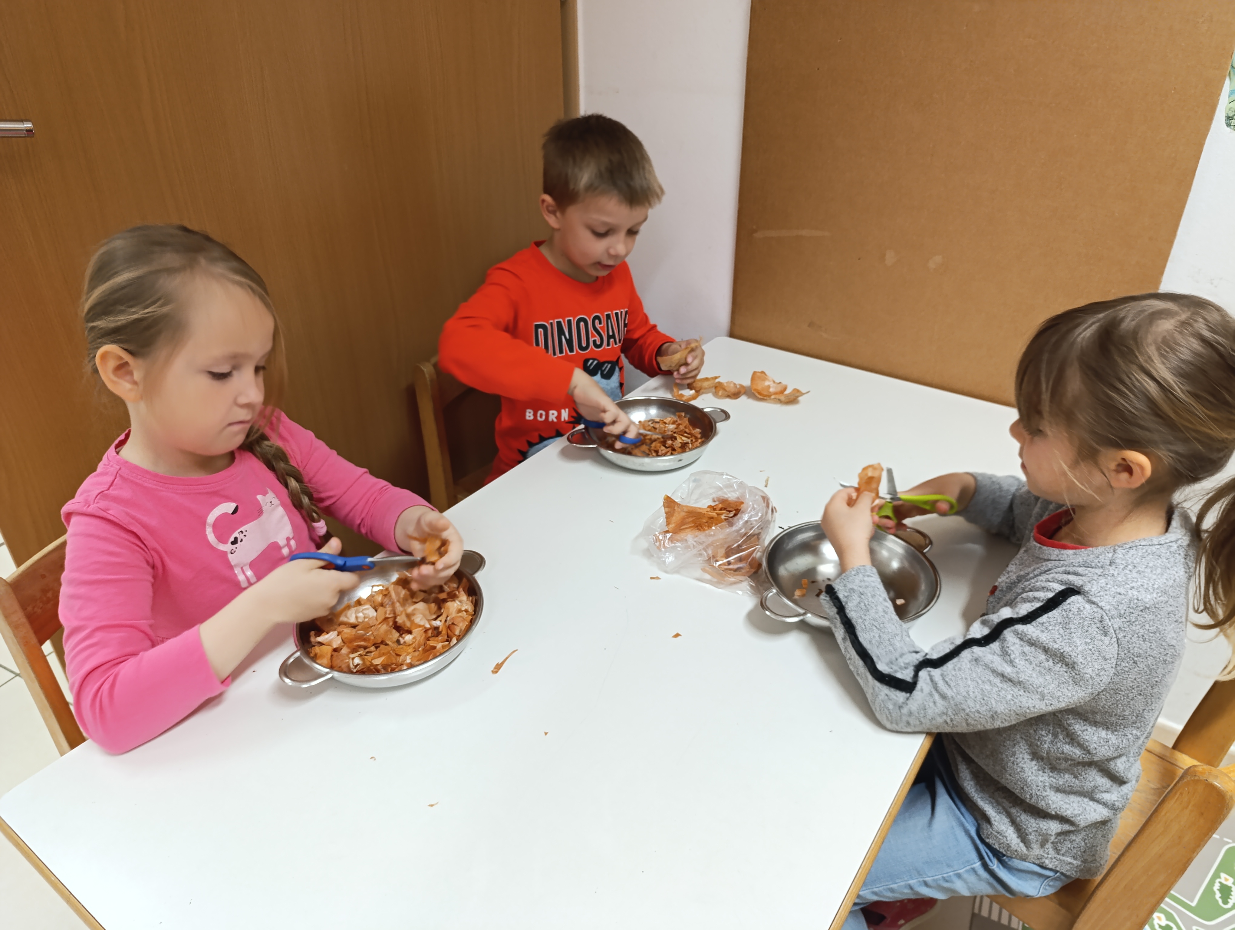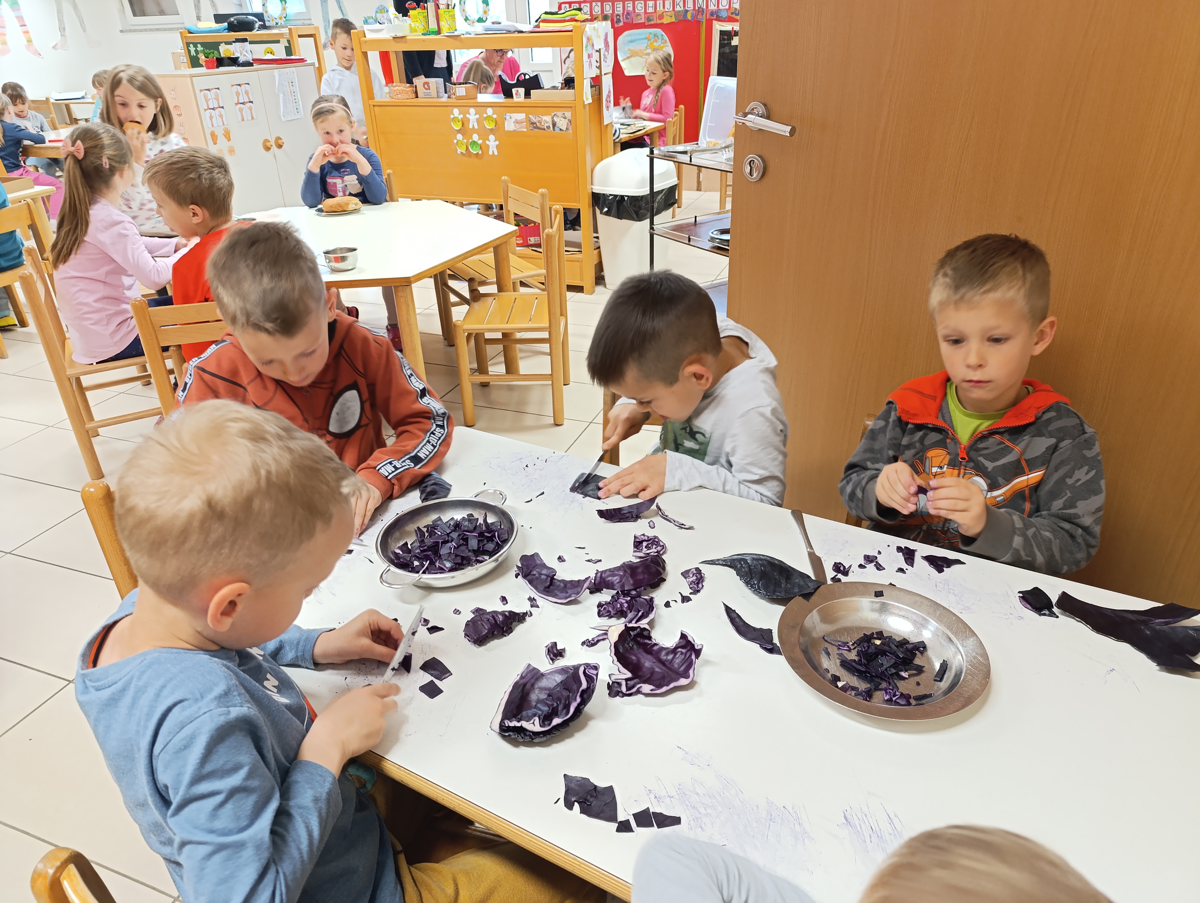 V skupini volki smo raziskovali naravna barvila. Odločili smo se, da bomo z njimi barvali jajca. Otroci so olupke rdeče in rjave čebule narezali na manjše koščke in ob tem še vadili strizenje s škarjami. Za barvanje jajc pa smo uporabili še rdeče zelje in kurkumo. Preden smo jajca potopili v obarvano vodo so otroci povedali kako mislijo, da se bodo jajca obarvala.