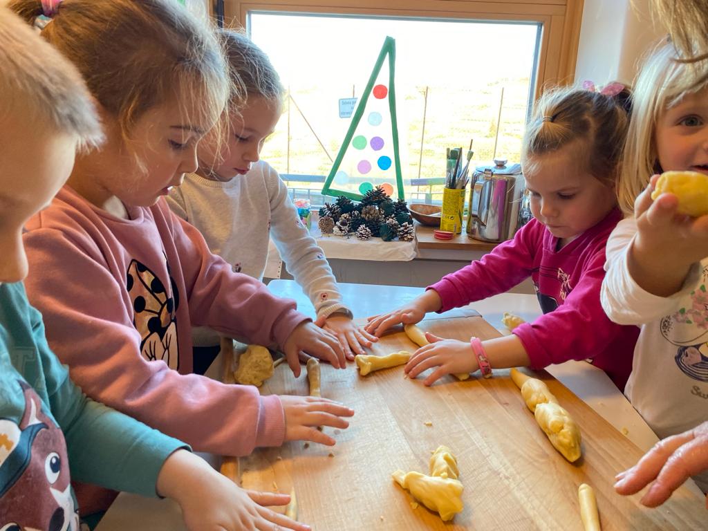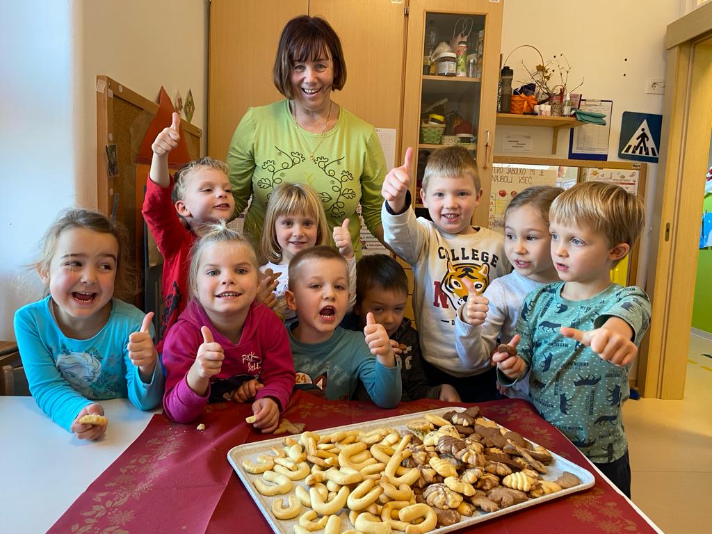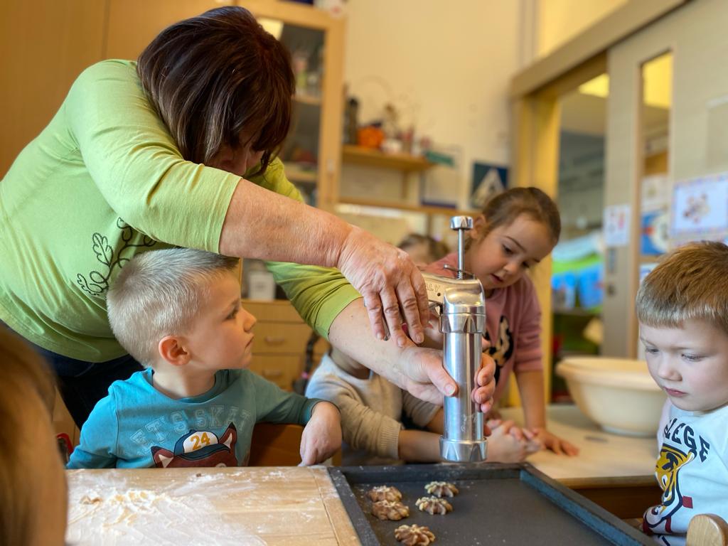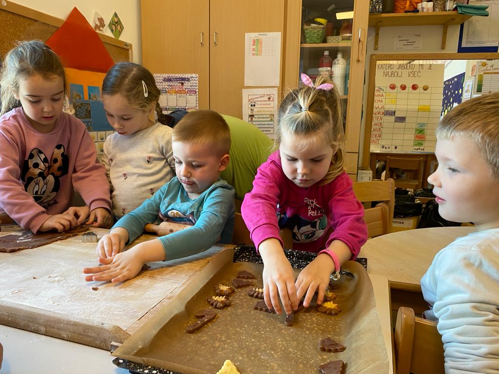 V ponedeljek, 18. decembra, je v vrtec Kojsko prispela nona Nataša Filej, ki je skupini otrok navdušeno pokazala, kako se pripravijo najokusnejši piškoti. Skupaj smo oblikovali testo, ustvarjali različne oblike in nestrpno čakali, da so se piškoti spekli. Po peki so si vsi skupaj privoščili slasten priboljšek, ki so ga skupaj ustvarili.