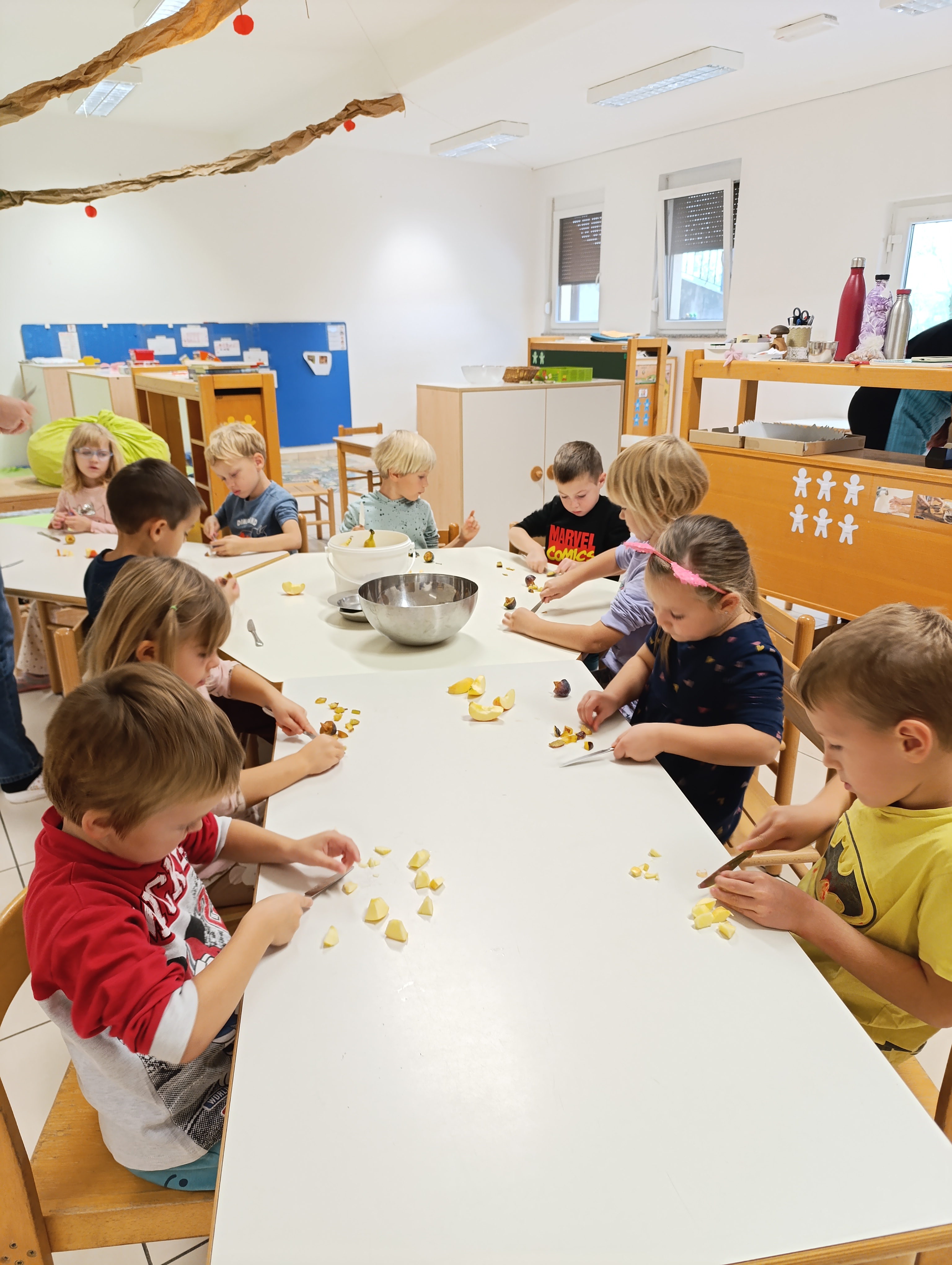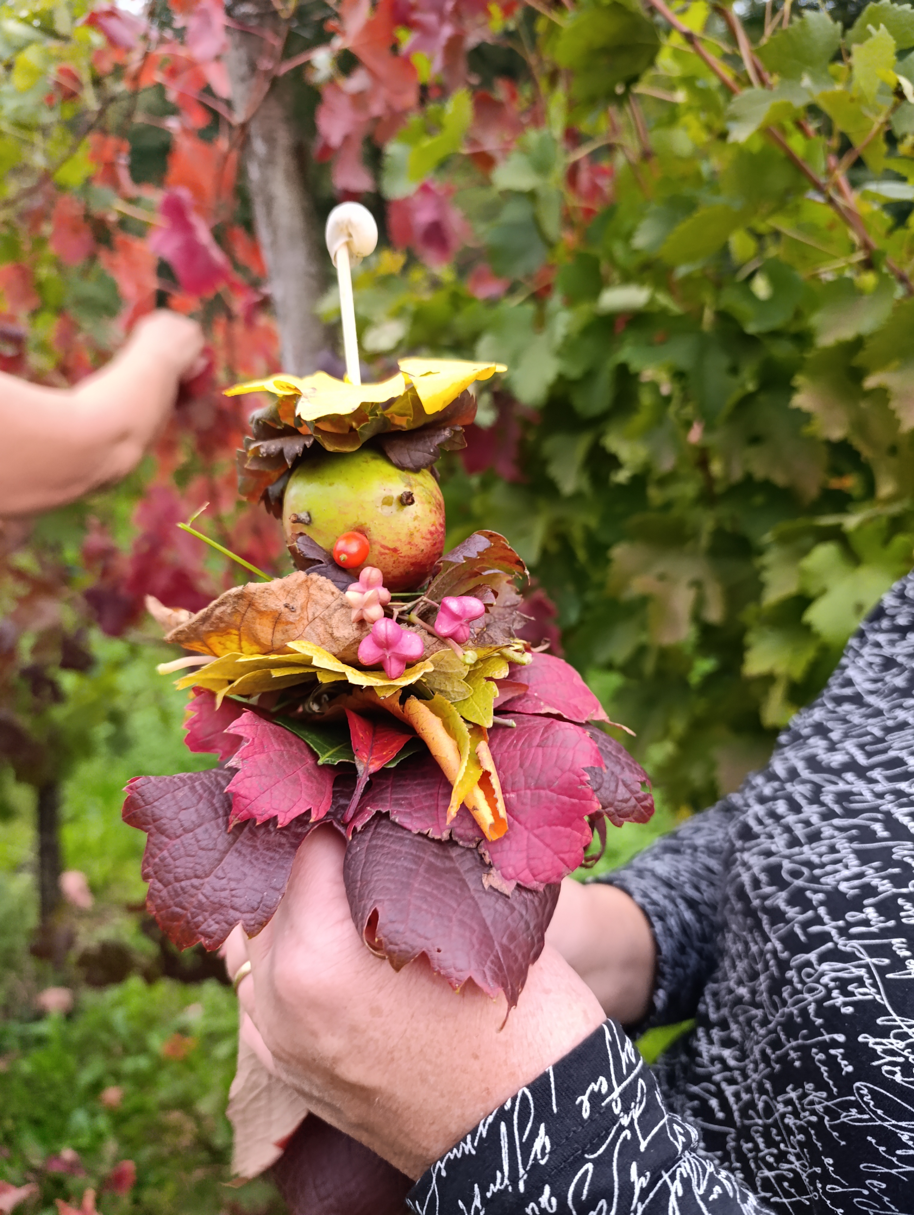 V vrtcu je že dopoldne zadišalo po sladkih dobrotah saj smo se odločili,da za none in nonote kar sami spečemo pecivo in posušimo jabolka. Popoldne smo se v lepem številu zbrali pred vrtcem in krenili na pot v dolino med Biljano in Kozano. Po poti smo nabirali jesensko listje,ki smo ga natikali na palčko in tako izdelali jesenskega škrata Jesenkota. Ko smo se vrnili na vrtčevsko dvorišče je sonce že zahajalo. Okrepčali smo se s pecivom in si pomahali v slovo.