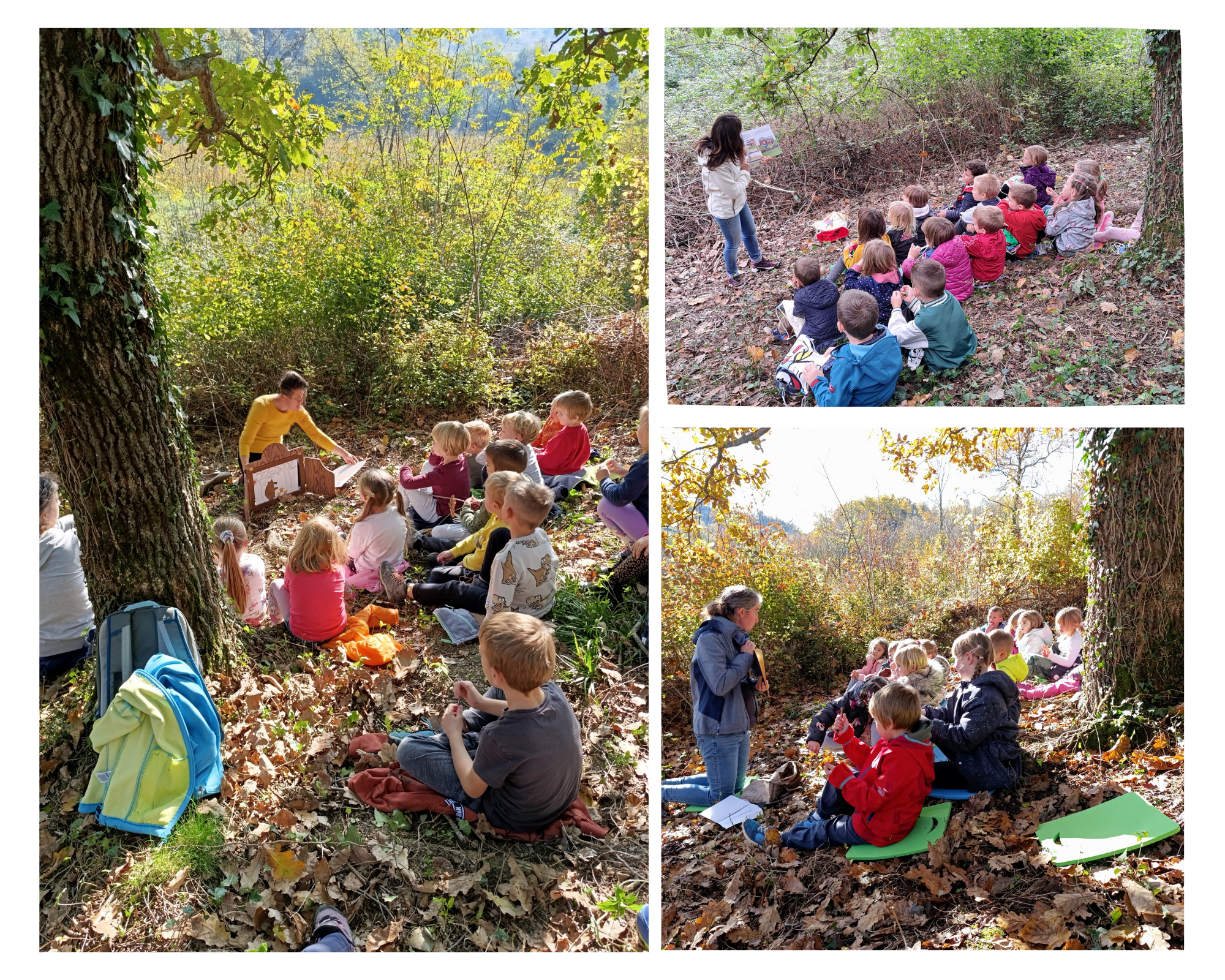 Ker veliko časa preživimo na prostem, smo se že v jeseni odpravili raziskovat okolico vrtca z namenom, da poiščemo primeren prostor, kjer si bomo uredili pravljični kotiček. Našli smo ga pod krošnjo mogočnega hrasta, kamor zahajamo vsak teden in prisluhnemo pravljici.