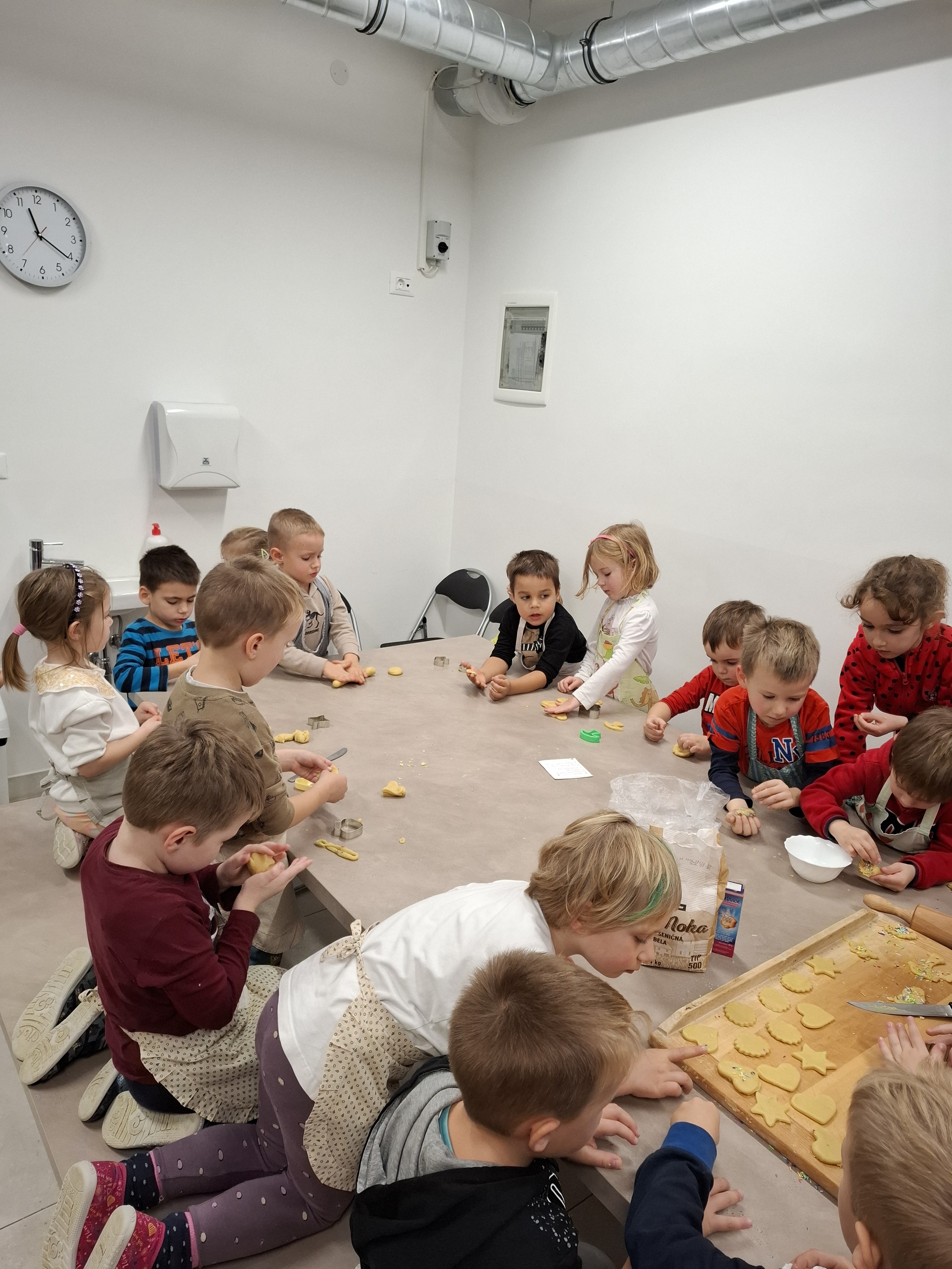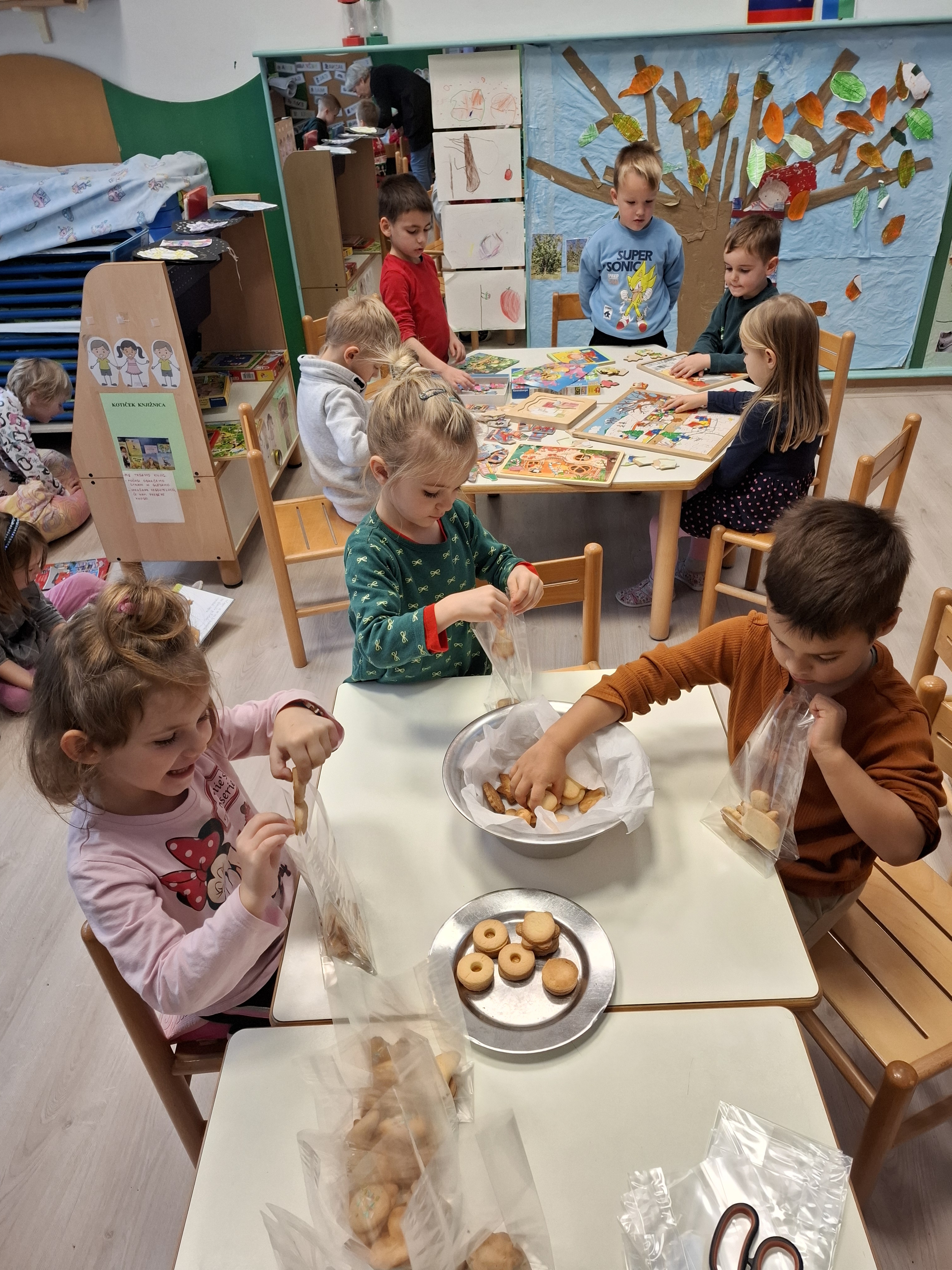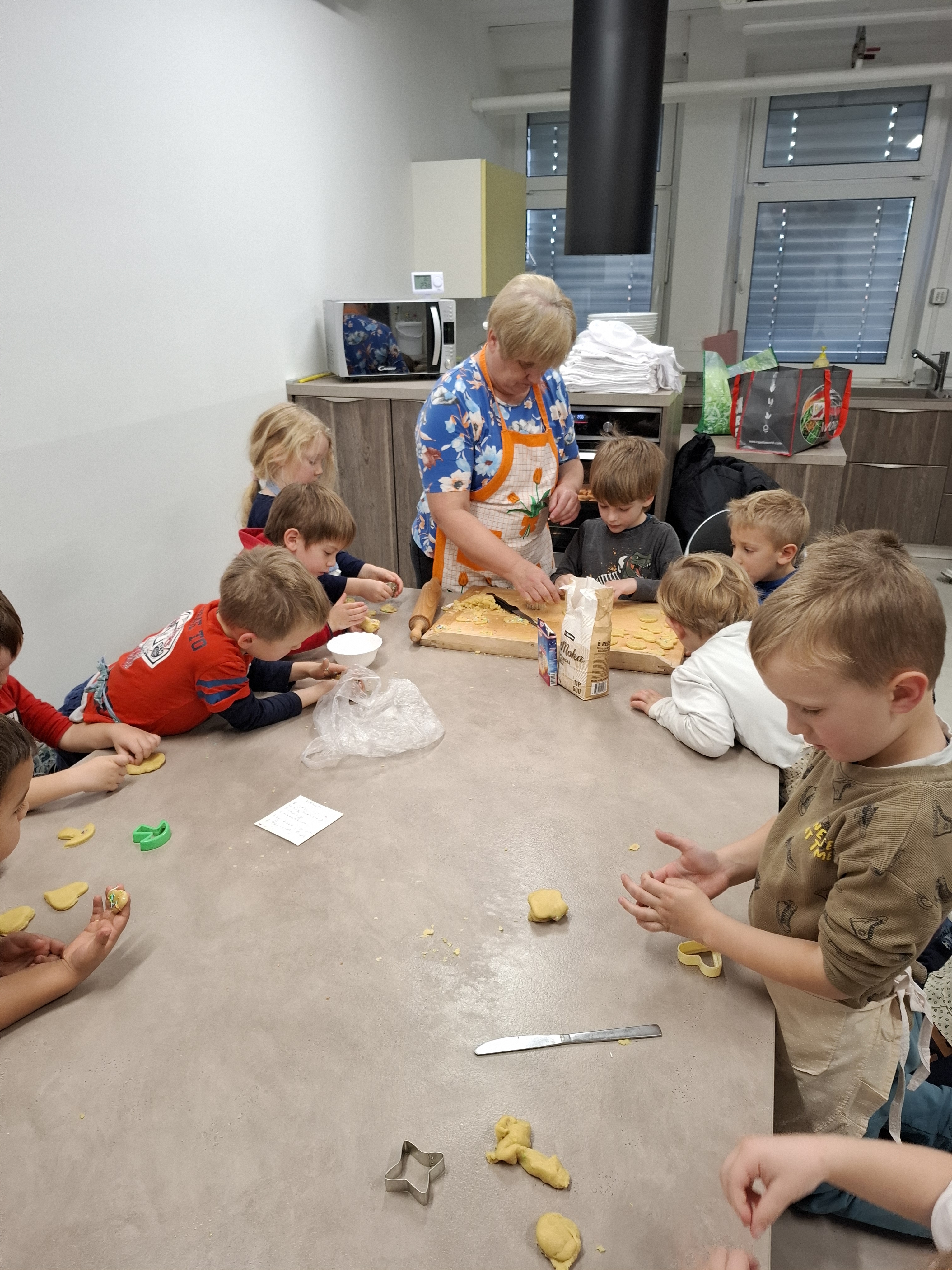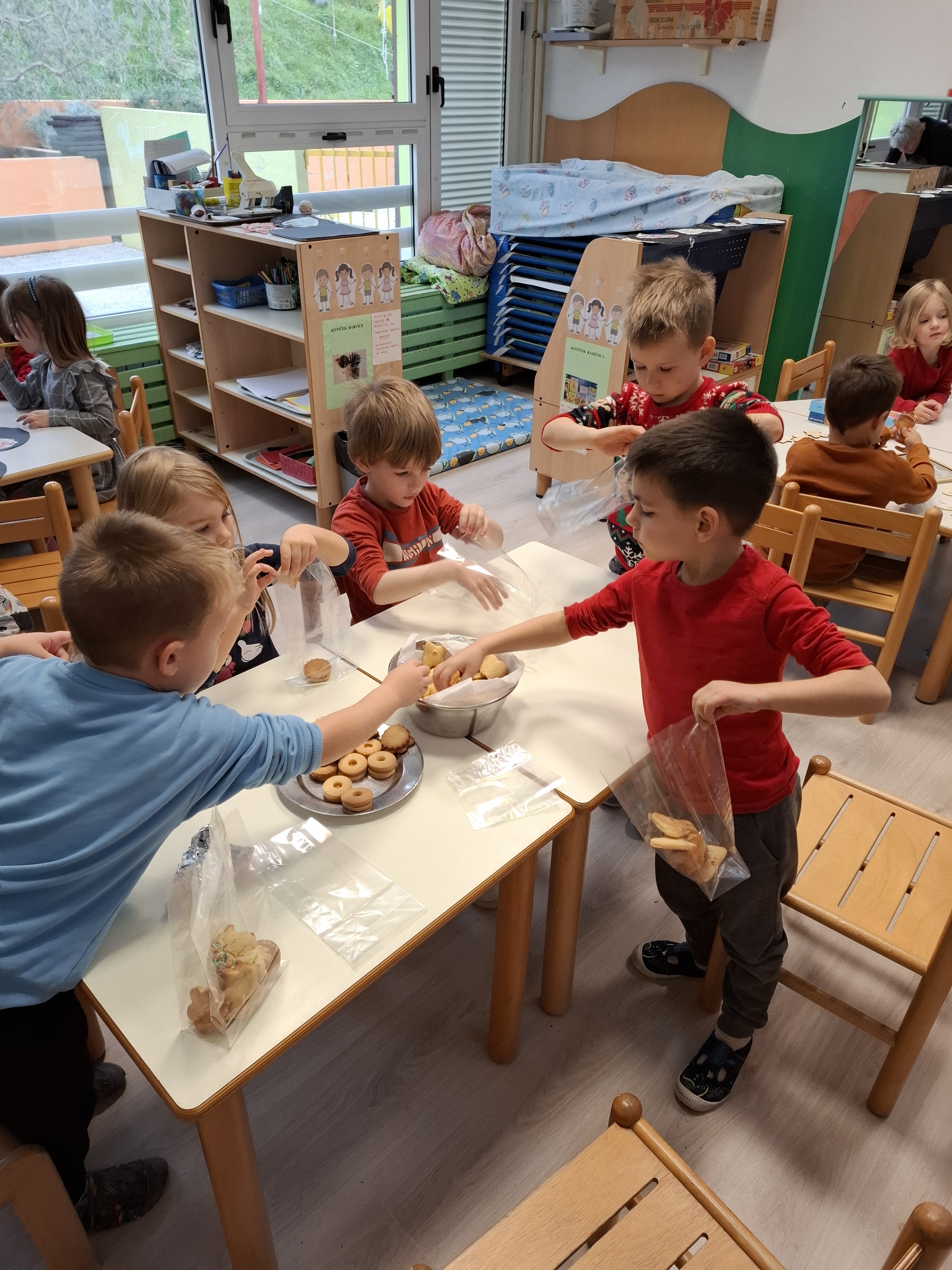 Hvaležni smo, da se je našemu povabilu odzvala Etienova nona, ki je prišla v vrtec in nam pomagala pri peki piškotov. Le-te smo skrbno zavili in jih ponudili na praznični tržnici.