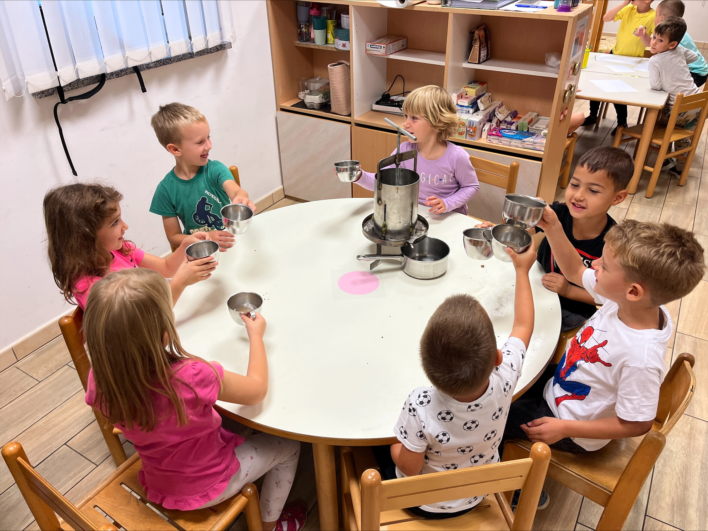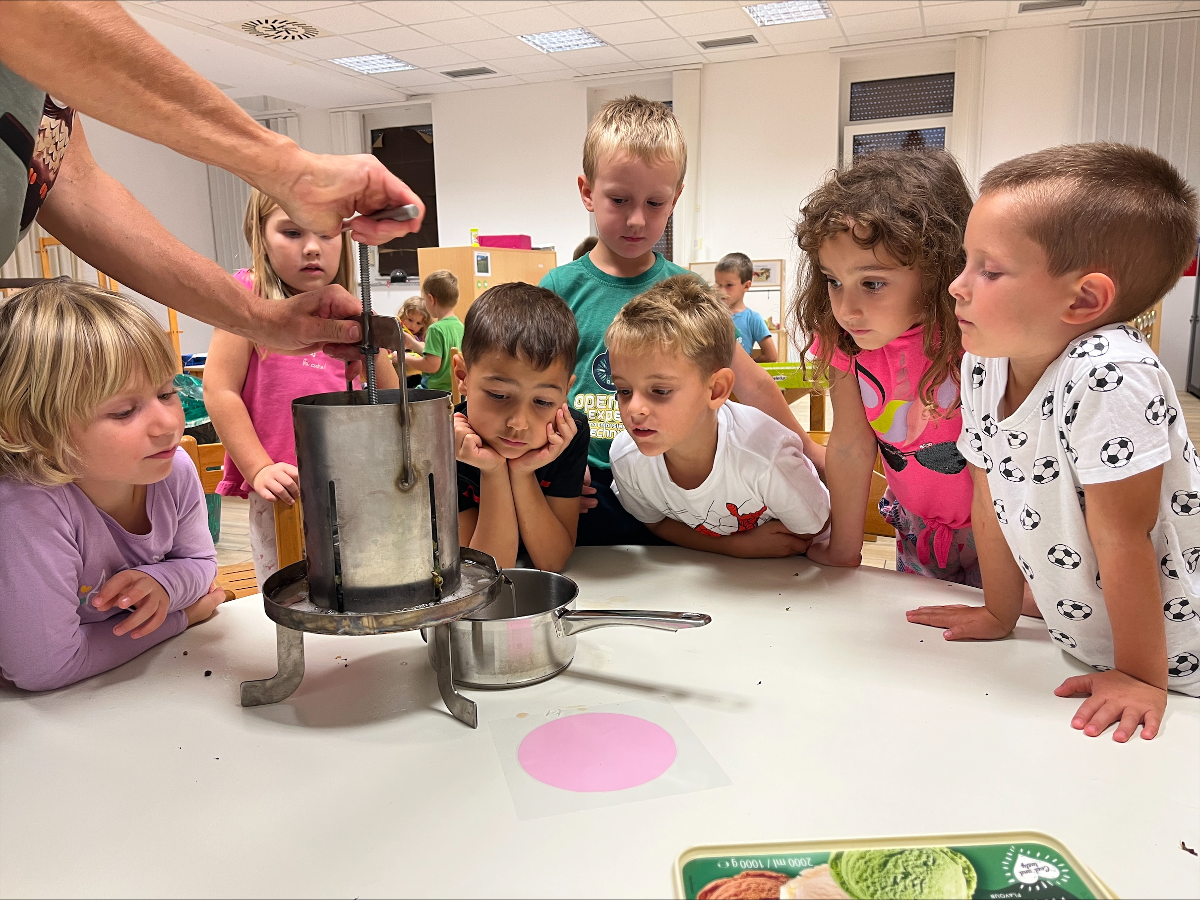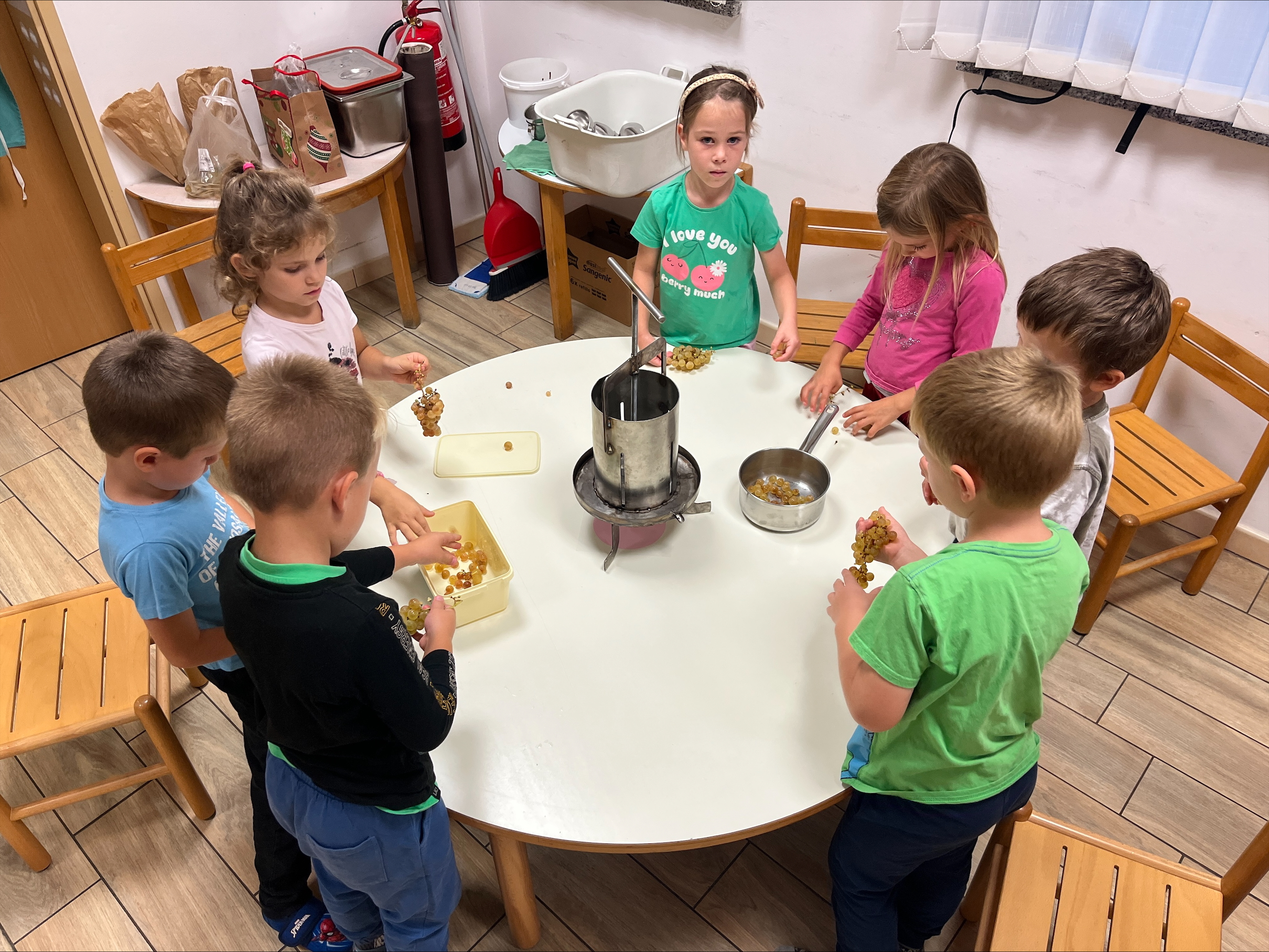 Otroci iz skupine Formule so od doma prinesli grozdje. Grozdne jagode smo najprej skrbno ločili od peclja in jih zbrali v posodo. Nato smo jih dali v prešo in skupaj opazovali, kako se iz njih počasi iztiska sladek sok. Na koncu smo grozdni sok tudi poskusili - bil je odličen in še slajši zato, ker smo ga pridelali sami.