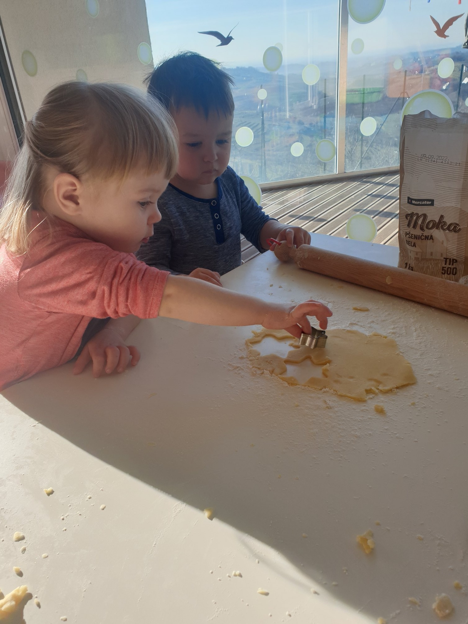 Z otroki smo našli skrito pismo. Napisal ga je škratek Toni, ki si je svoj domek uredil nekje v našem vrtcu. Obljubil je, da nam bo velikokrat pustil kakšno presenečenje. Prinesel nam je belo sceno za Belo pravljico, glasbo za ples Snežink, recept in sestavine za peko piškotov, pesem o Zvezdici …
