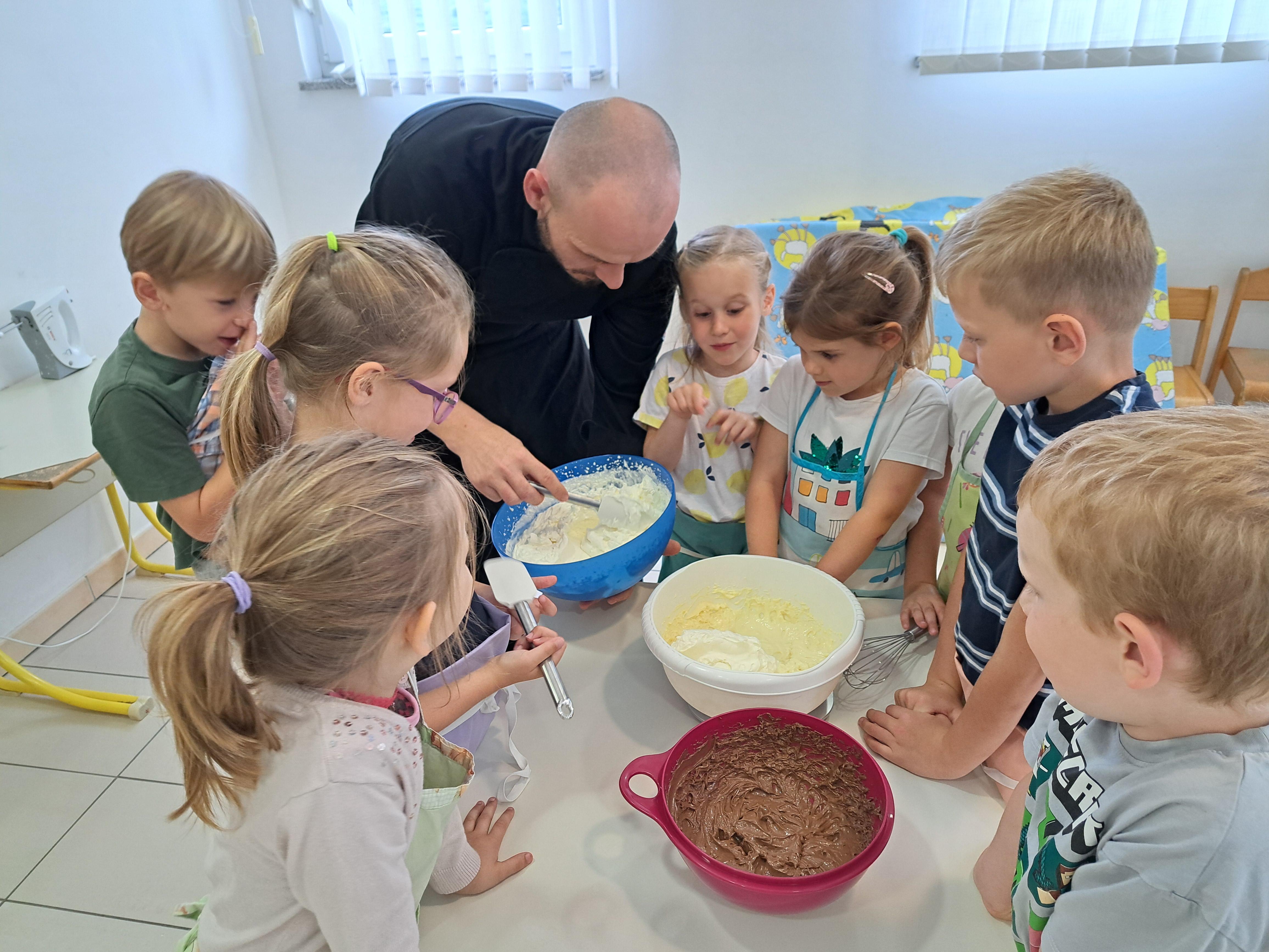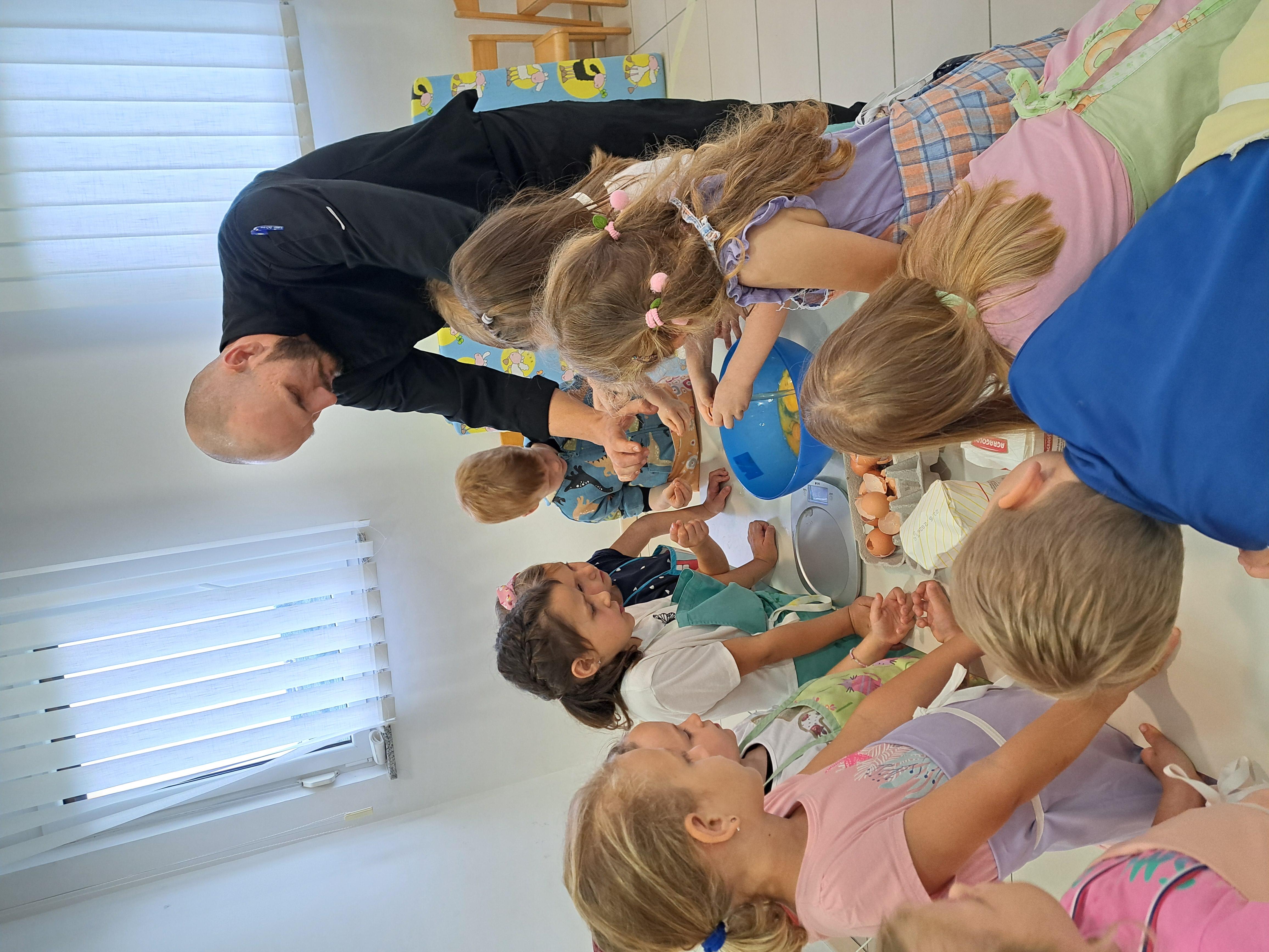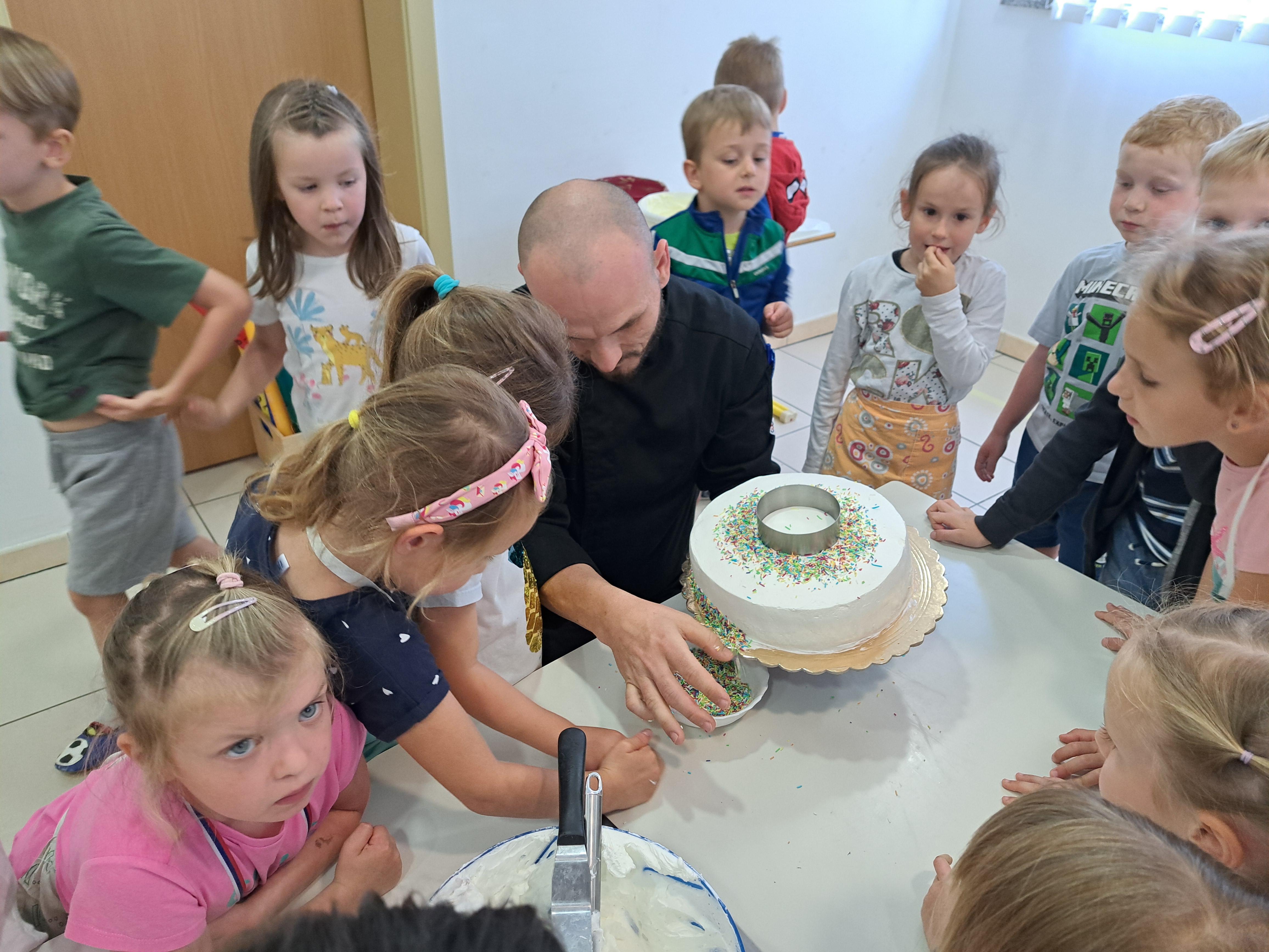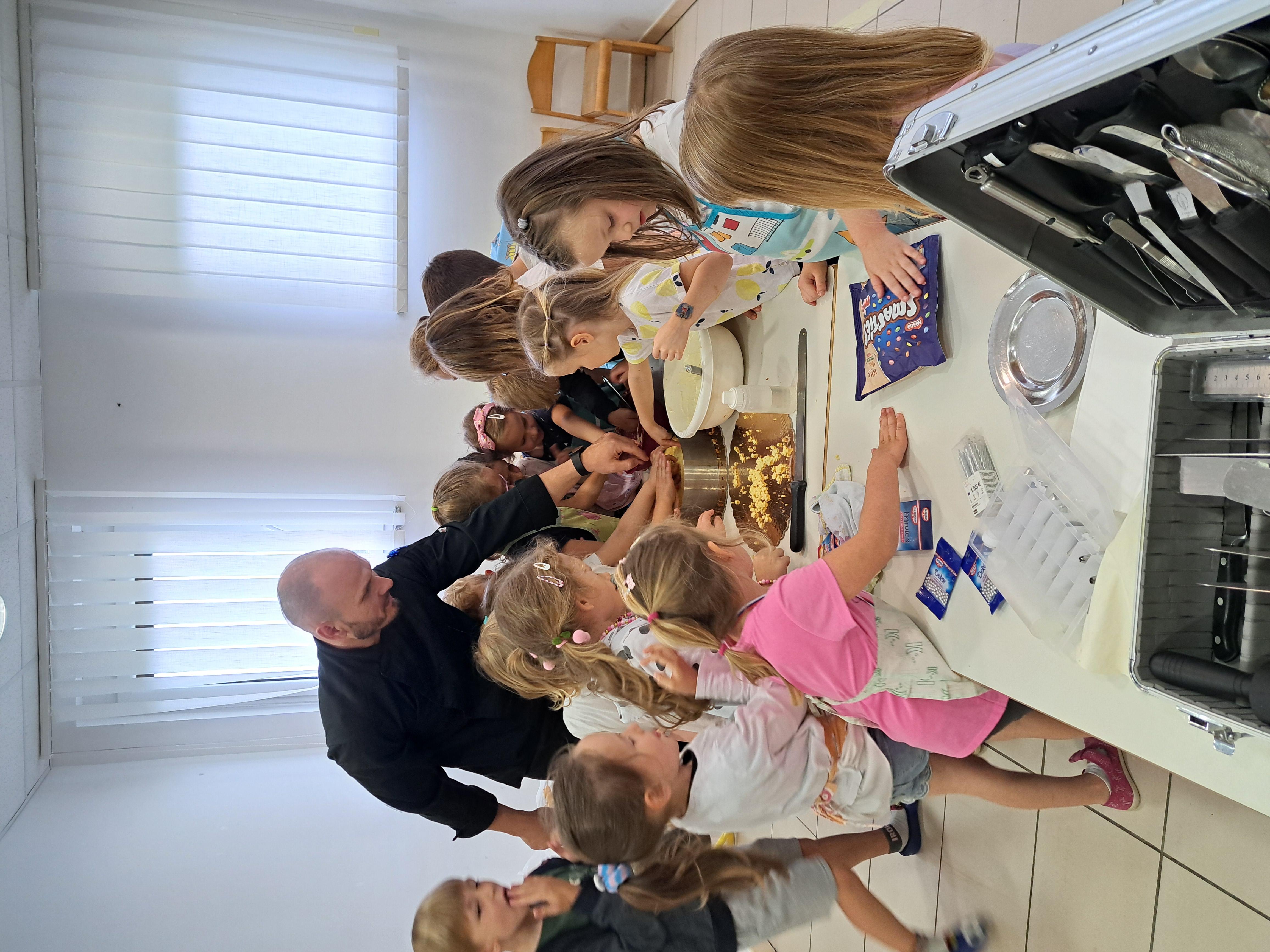 Oče naše Lael, ki je slaščičar »MASTER CHEF« nam je bil pripravljen predstaviti postopke za pripravo prave torte. Skupaj z njim smo mešali, tehtali in spekli puhast biskvit. Ko se je ohladil smo ga prerezali in namazali s slastno čokoladno kremo. Okrasili smo jo s smetano, pisanimi mrvicami, bombončki in seveda s svečkami, brez katerih rojstnodnevne torte ni. Uspelo nam je. Postavili smo jo v hladilnik do naslednjega dne, ko smo praznovali in se sladkali. Zelo nam je teknila, saj je bila odlična.