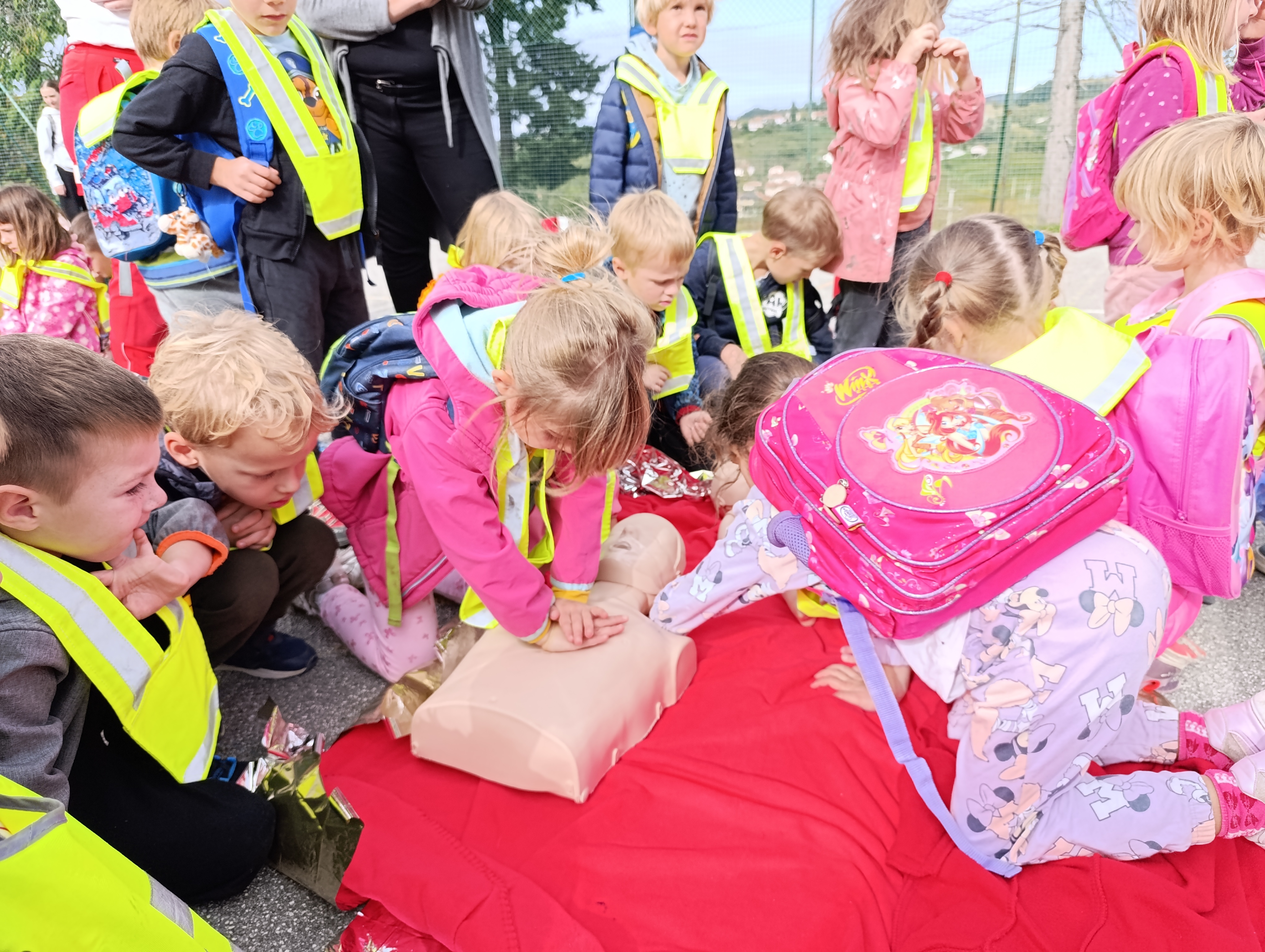 Tega dne je na Dobrovem potekala tudi briška obeležitev dneva oživljanja. Na šolskem igrišču so se predstavili predstavniki različnih reševalnih služb. Dogodek je še dodatno popestril naš dan. Najprej smo odšli na kosilo v šolsko jedilnico, kar je bil za večino otrok poseben dogodek saj so se srečali z brati in sestrami, ki že obiskujejo šolo, pa tudi z otroci, ki so lani obiskovali vrtec v Biljani. Ko smo se okrepčali smo si na šolskem igrišču ogledali še druge predstavnike reševalnih služb. Pozdravil nas je policist, ki nas bo v vrtcu obiskal prihodni teden.Preizkusili smo se v oživljanju. Najbolj zanimivo pa nam je bilo srečanje s policijskim in reševalnimi psi.