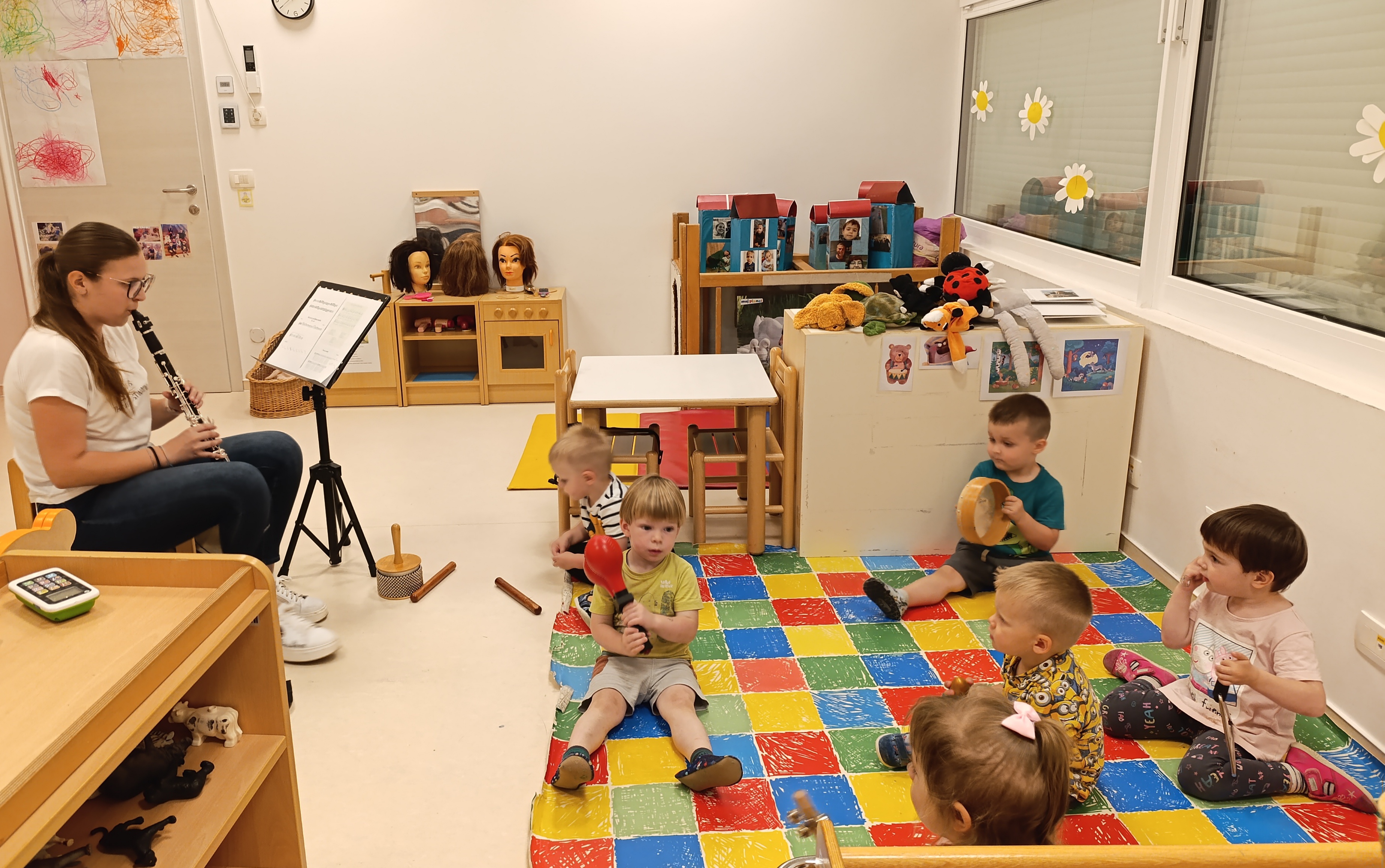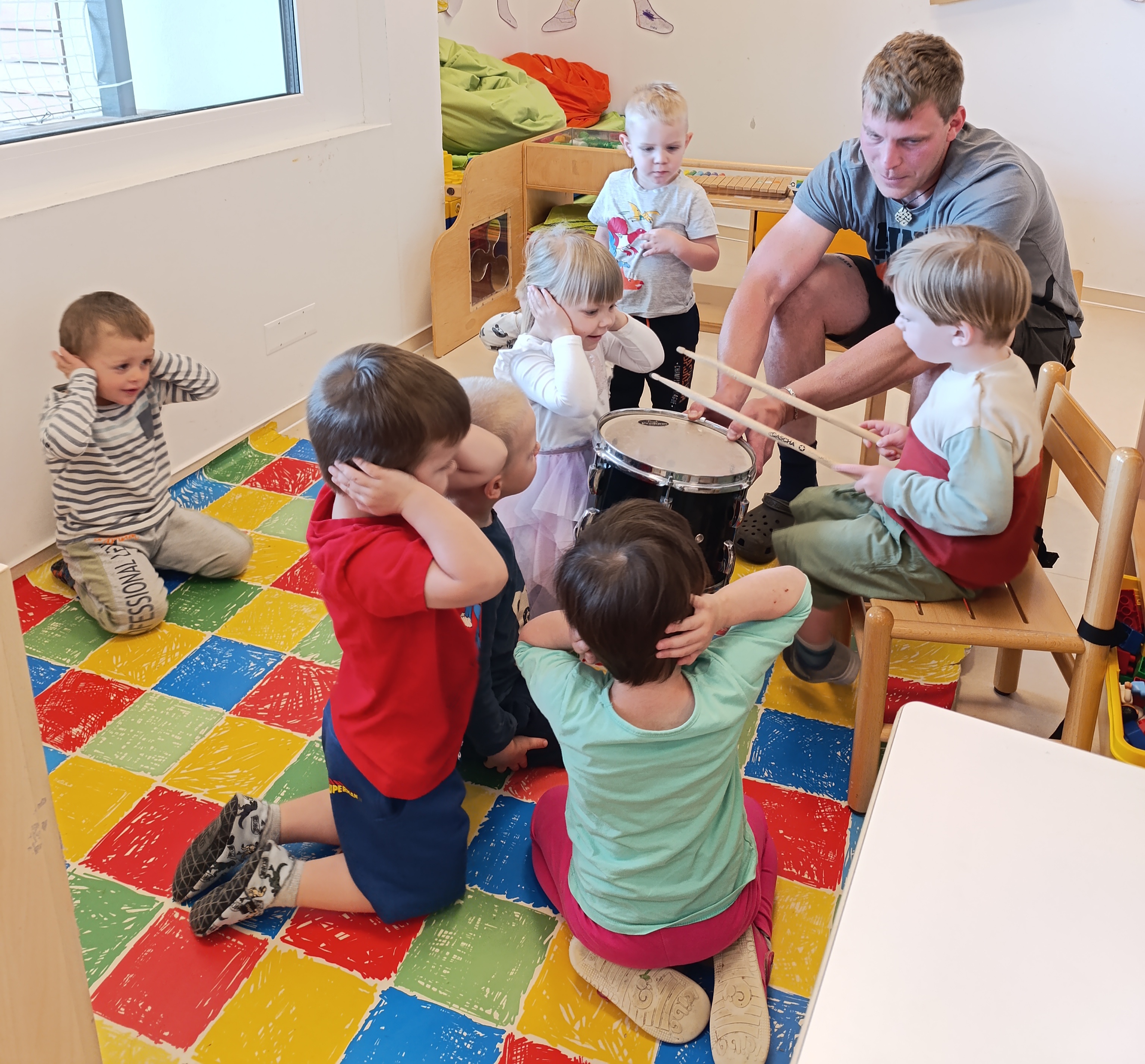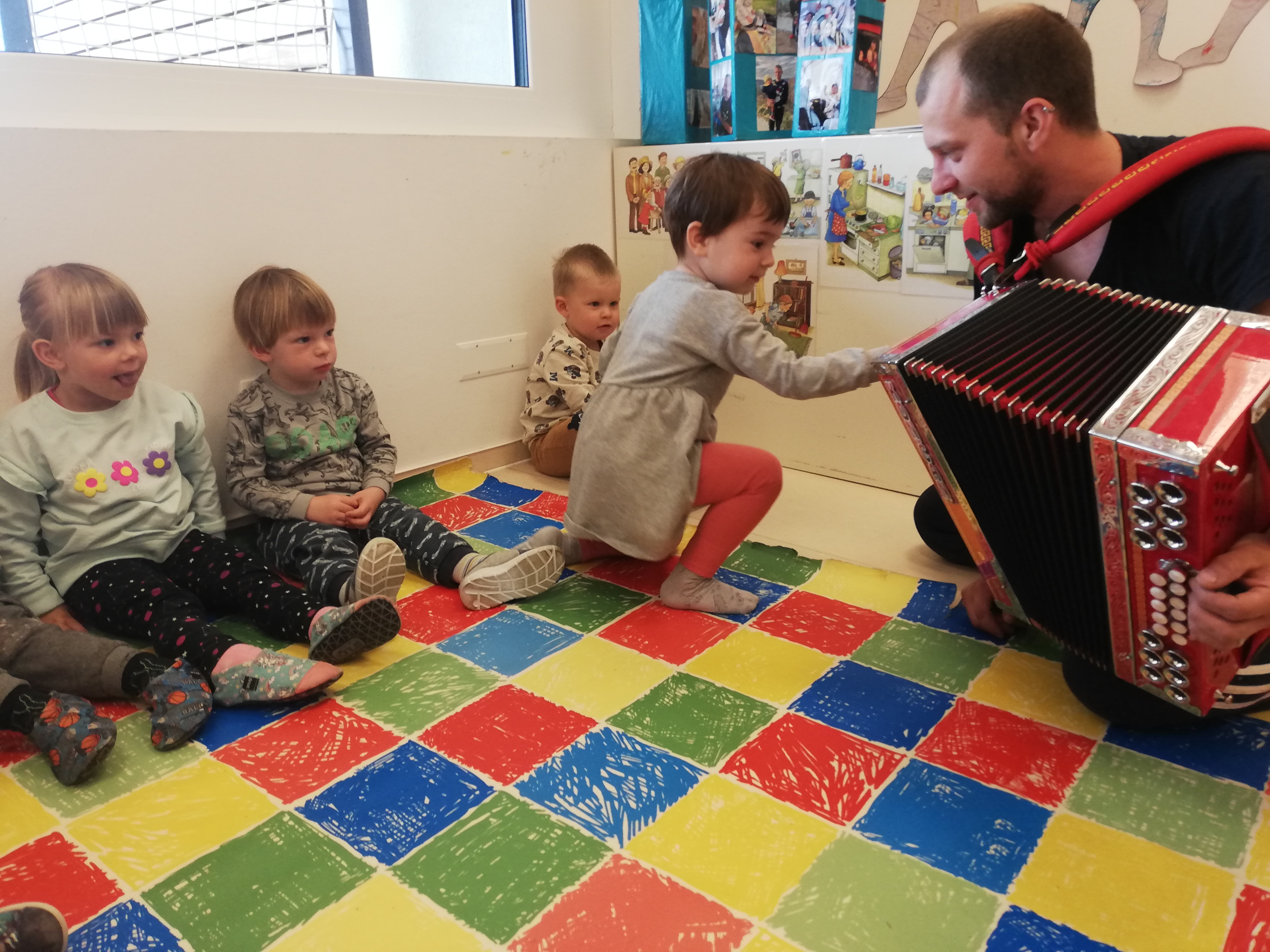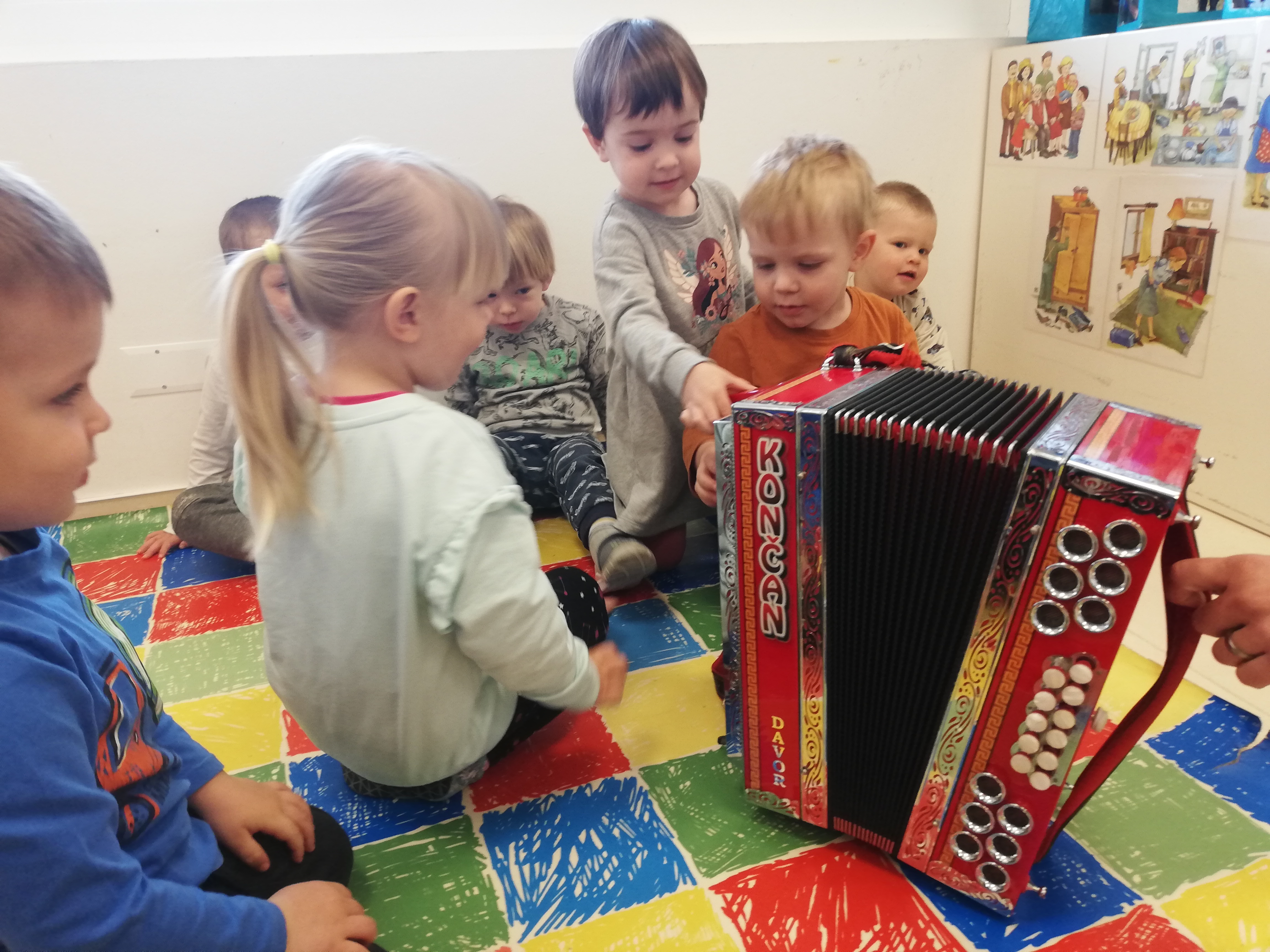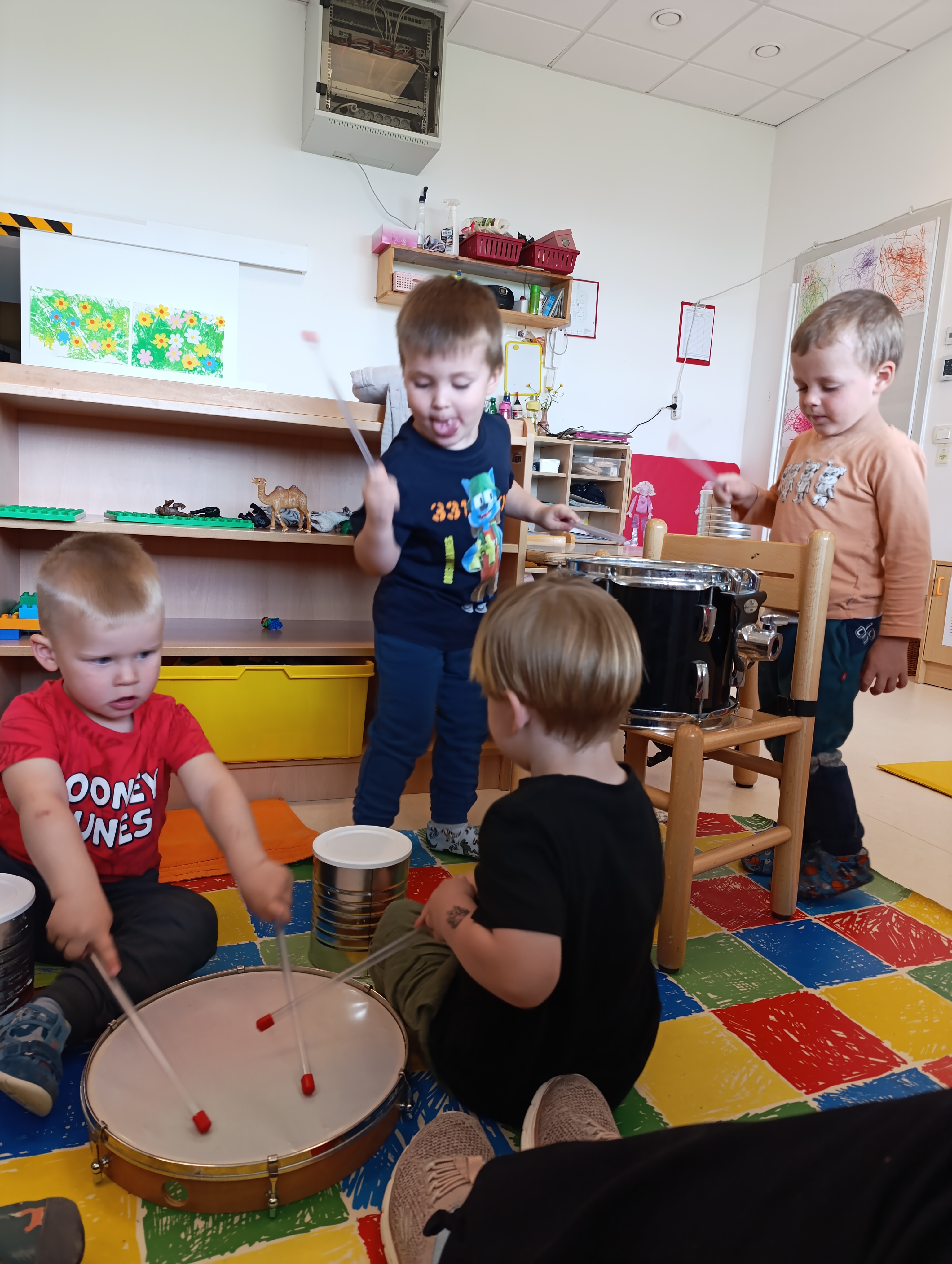V skupini Želvice zelo radi pojemo in poslušamo glasbo, zato smo mesec maj posvetili glasbi. Igrali smo se glasbeno-didaktične igre preko katerih smo spoznavali pojem tiho/glasno ter zaigrali na male instrumente (ropotulje, bobne, kabaso...). V igralnici smo si uredili glasbeni kotiček s ksilofoni in si izdelali mikrofone. Na obisk smo povabili Anjo, ki nam je predstavila flavto in klarinet, tata Davor nam je zaigral na harmoniko, tata Alian pa nam je predstavil bobne.