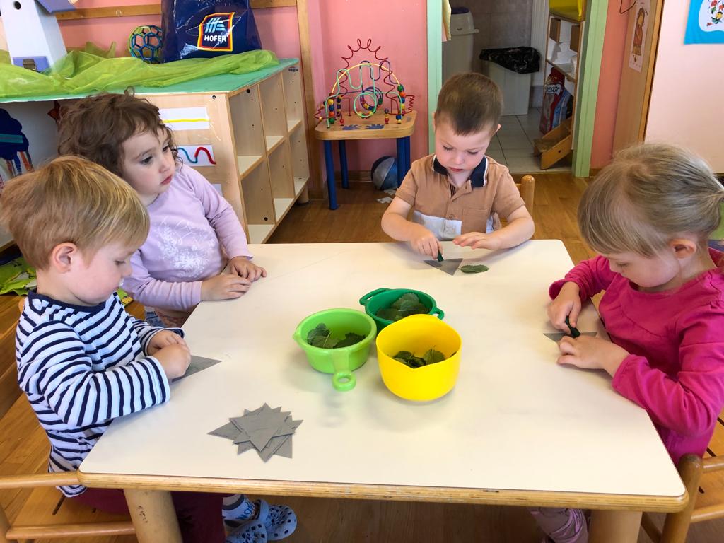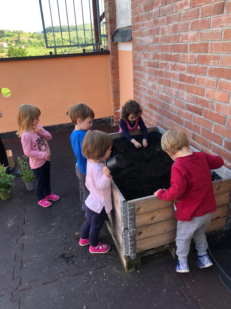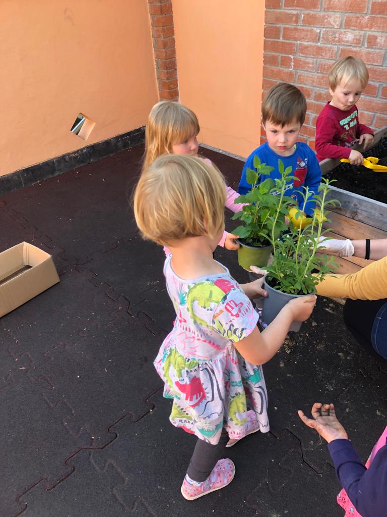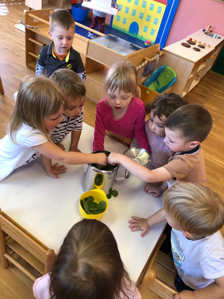 Na atriju bele skupine smo v visoko gredo posadili sivko, meliso in stevijo. Zelišča smo nato nabrali ter jih raziskovali z vohom in okusom. Doživljanja ob vohanju in okušanju so otroci izrazili z risanjem. Iz stevije in melise pa smo pripravili tudi osvežilno pijačo.