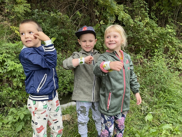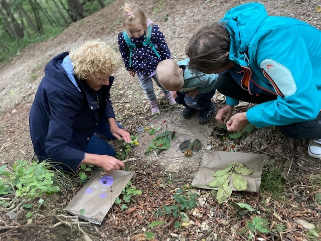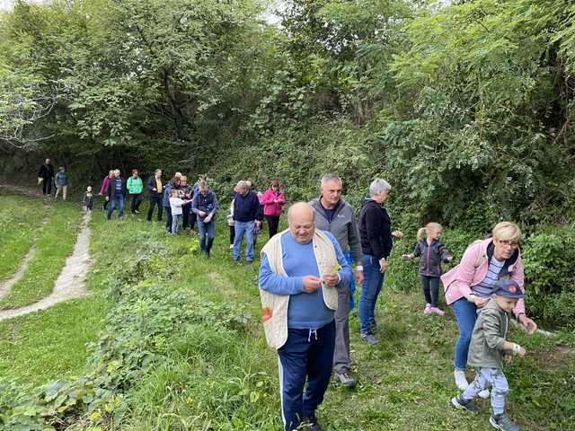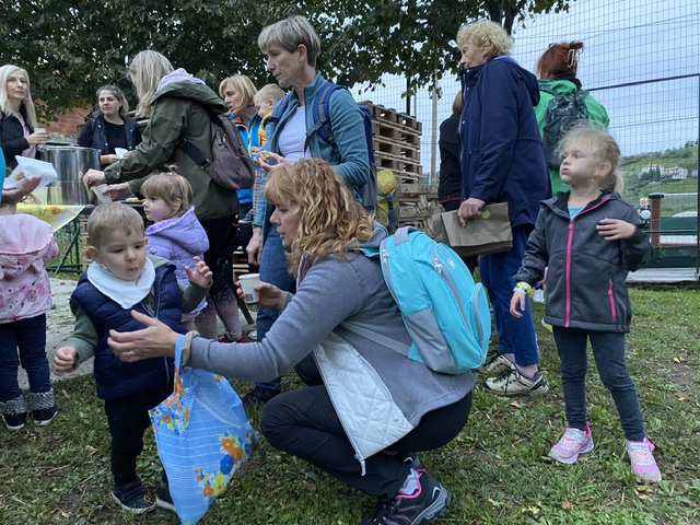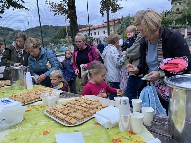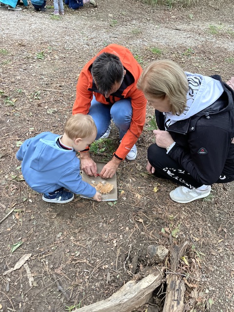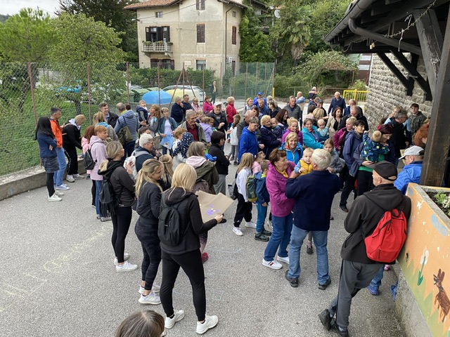 Vremenska napoved za ta teden ni ravno naklonjena dejavnostim na prostem, zato smo za naš tradicionalni pohod z nonoti izbrali do večera še suh ponedeljek. Ob 17.30 se nas je tako pred vrtcem zbralo kar lepo število-otrok, nonotov, non in vzgojiteljic. Kot običajno smo se na pohod odpravili po dveh krožnih poteh pod svetim Križem-starejši skupini po daljši,spodnji poti, mlajše tri skupine pa po zgornji, krajši poti. Med hojo smo se kratkočasili z naravnim materialom v nalogah, ki so jih pripravile vzgojiteljice. Skupni cilj je bil tudi letos v Riu. Tam smo se odžejali, poklepetali in se posladkali z jabolčno pito, ki sta jo spekli naši kuharici. Prav gotovo je bil to čudovit začetek tedna otroka: na nepopisne liste naših najmlajših smo dodali čudovito izkušnjo medgeneracijskega povezovanja.