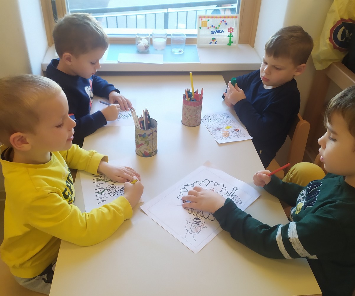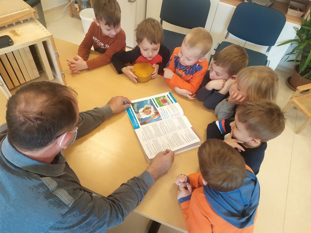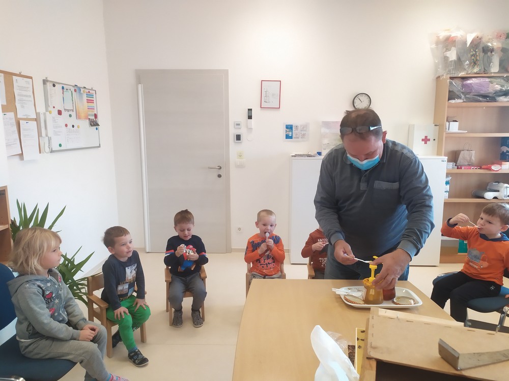 Pikapolonice je dan prej obiskal čebelar Danilo in nam povedal veliko zanimivega o čebelah. Za pokušino nam je prinesel dve vrsti medu, v petek pa nam je kuharica pripravila za malico še tretjega. Okušali smo lipov, kostanjev in cvetlični med. Vsi so nam bili zelo okusni. Po malici smo pobarvali vsak svojo pobarvanko o čebelicah, zaplesali smo čebelji ples Zum zum zum in se na travniku igrali igrico Čebelice v panj.