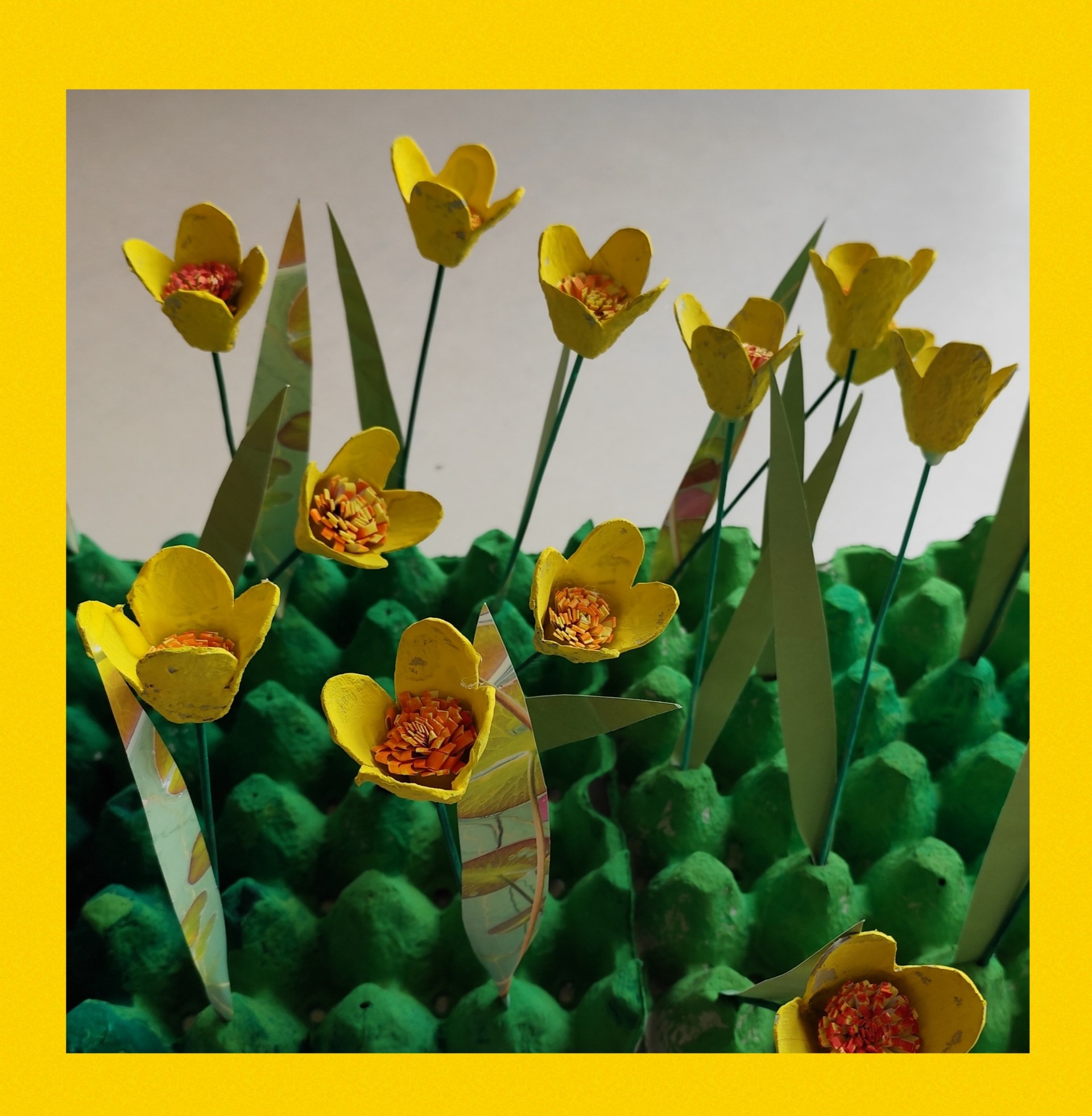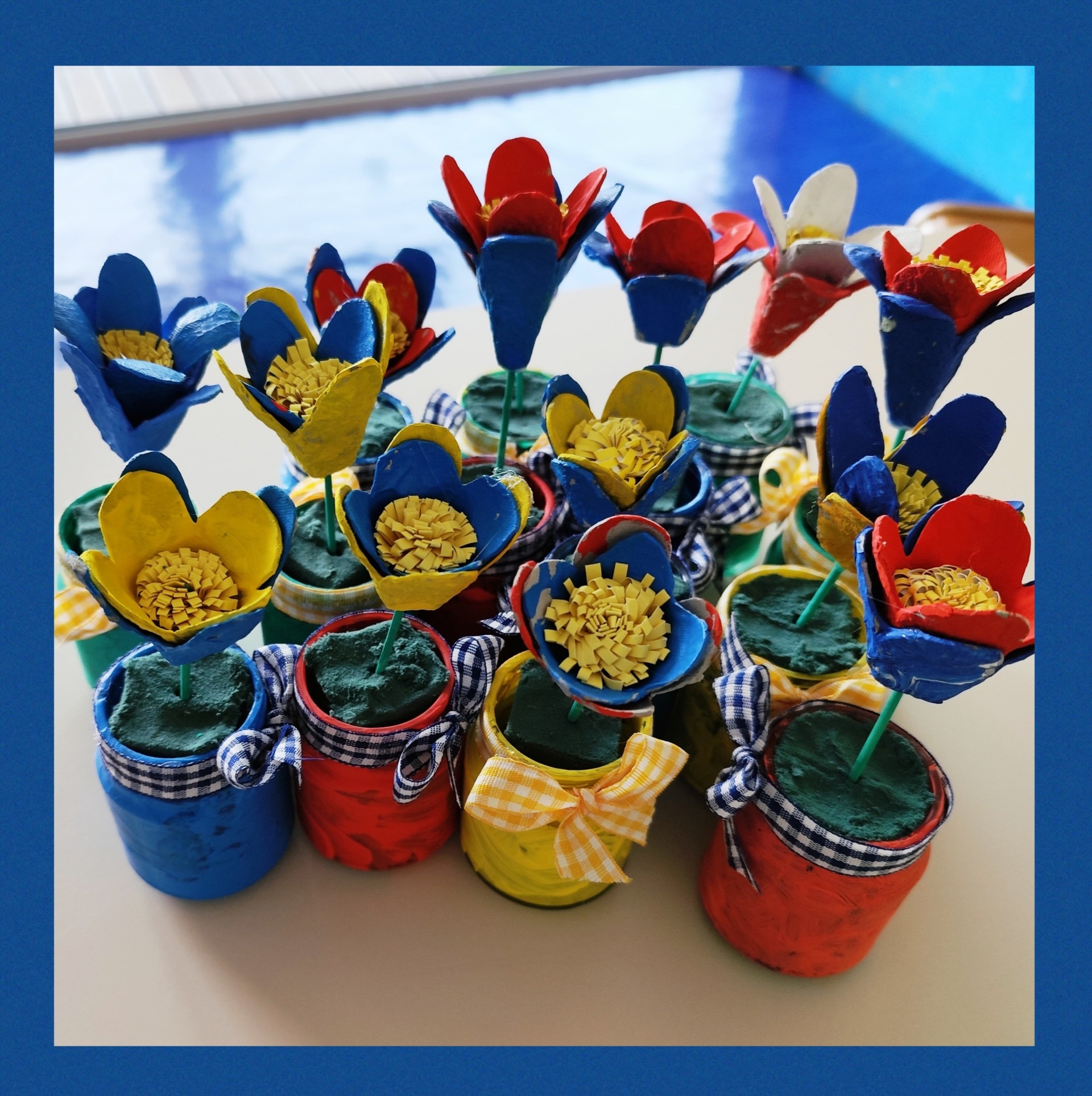 Tako smo se odločili, da za začetek uporabimo kartonske embalaže za jajca. Iz njih smo z otroki izdelali narcise, ki krasijo našo garderobo in tudi rožice, s katerimi so otroci razveselili mame ob materinskem dnevu. Pred veliko nočjo pa smo pripravili papirnato kašo, iz katere smo izdelali skledice.