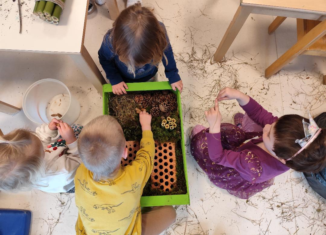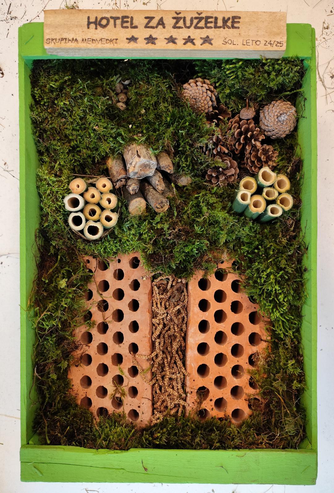 Nadaljevali smo s ponovno uporabo plastenk, v katere smo posadili čebulice cvetlic. Otroci iz starejše skupine so posadili zelišča v visoke grede na našem igrišču, tako da smo se odločili, da iz odpadnih in naravnih materialov izdelamo tudi hotel za žuželke.